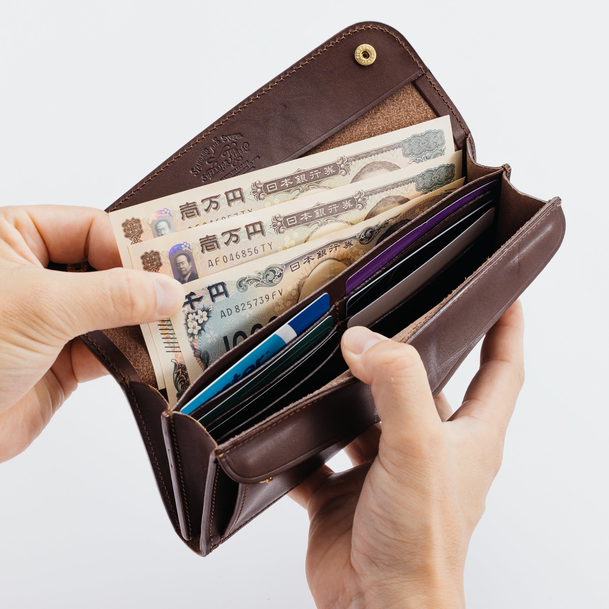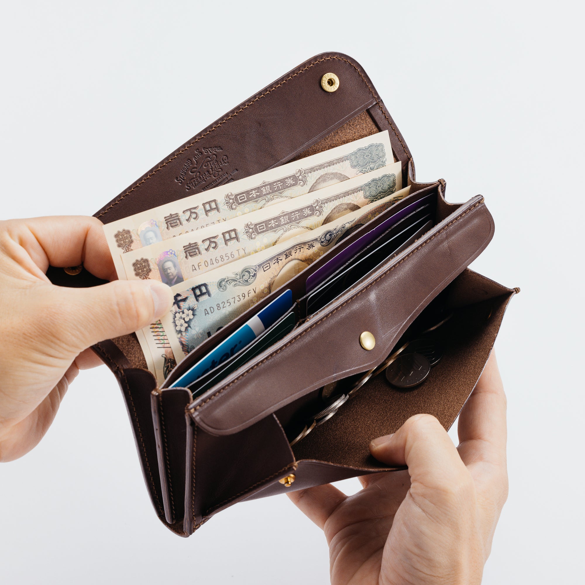 This wallet is made of our original leather, which is tanned only from high quality parts with coarse fibers (called berries) removed, and is richly oiled.