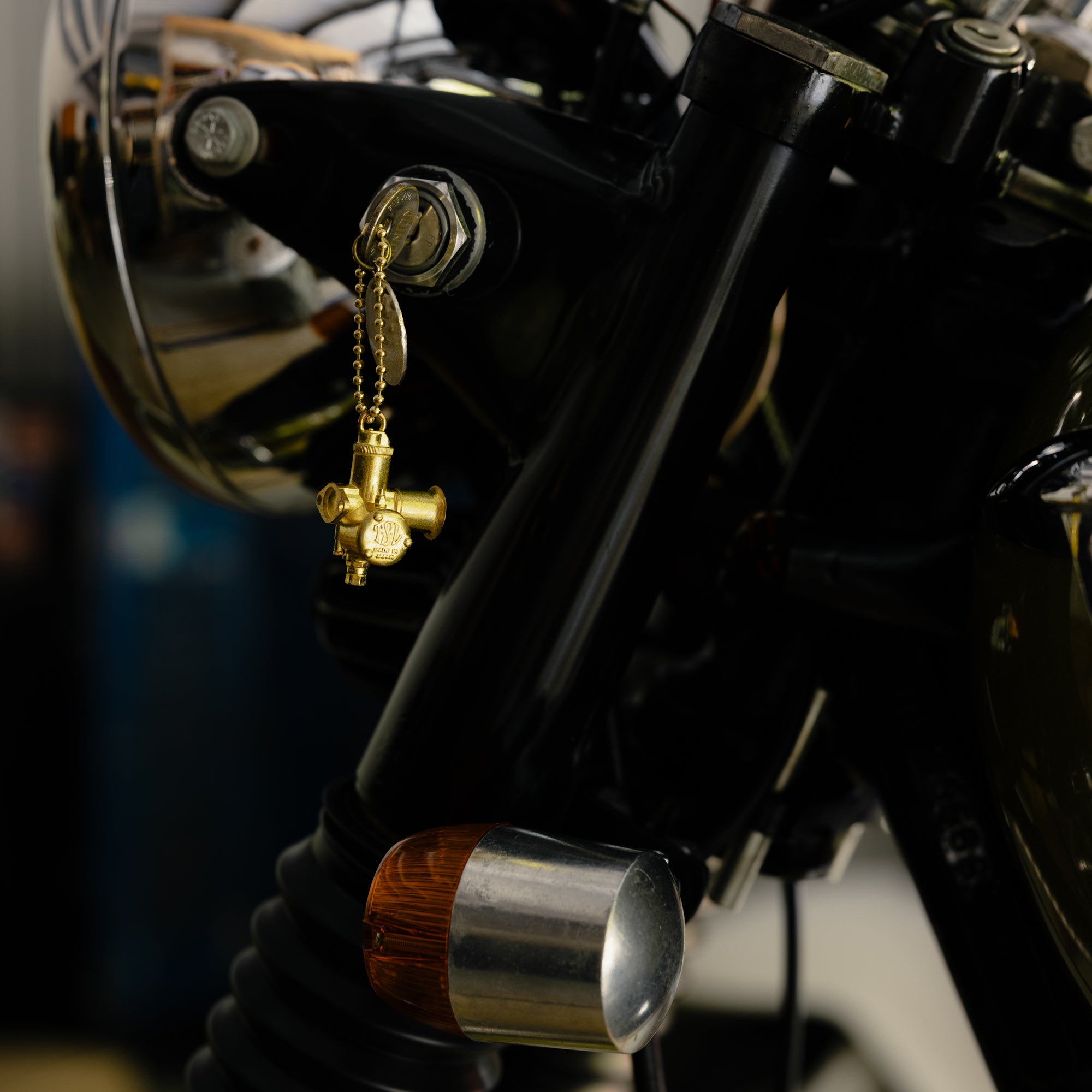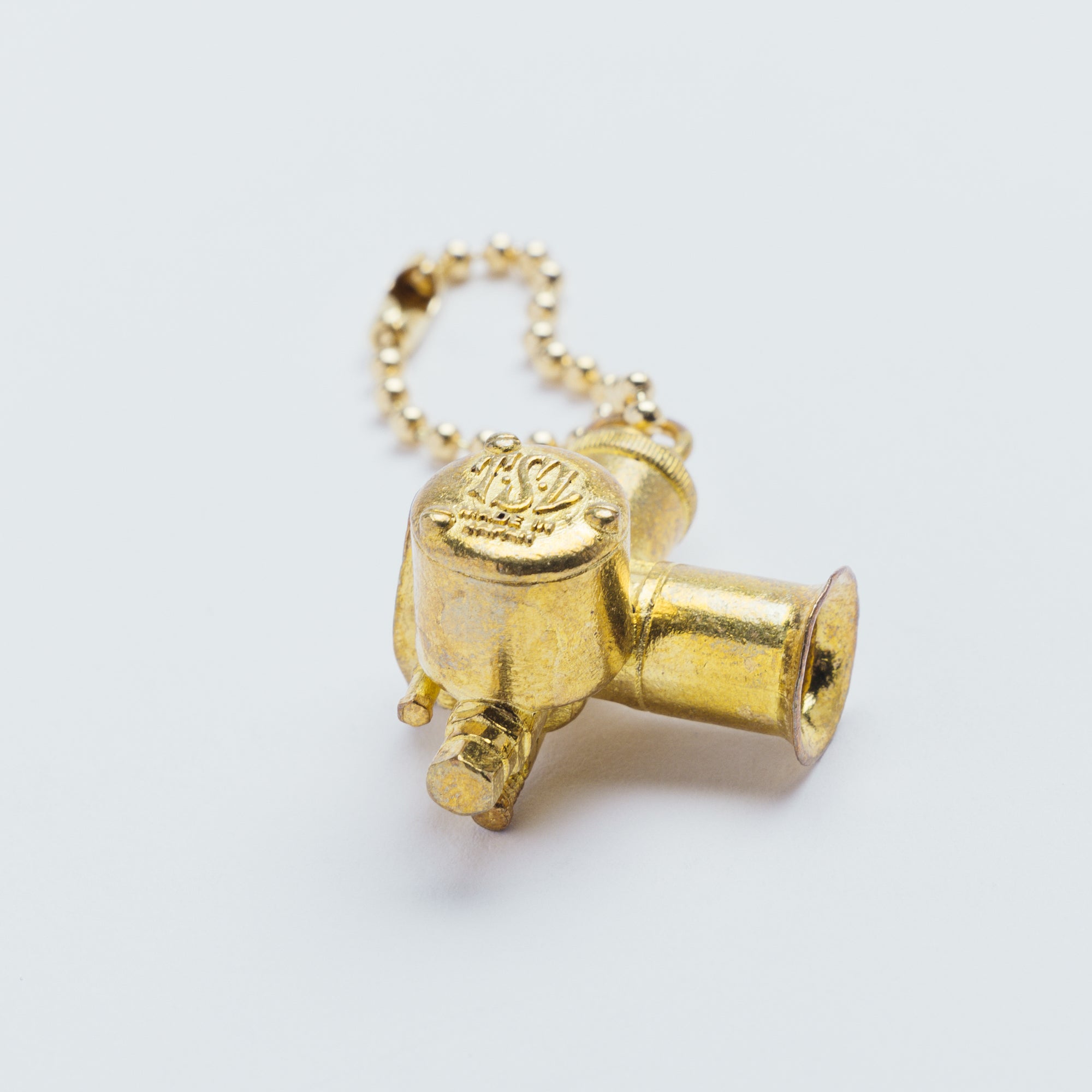 Vintage carburetor-style brass charm.