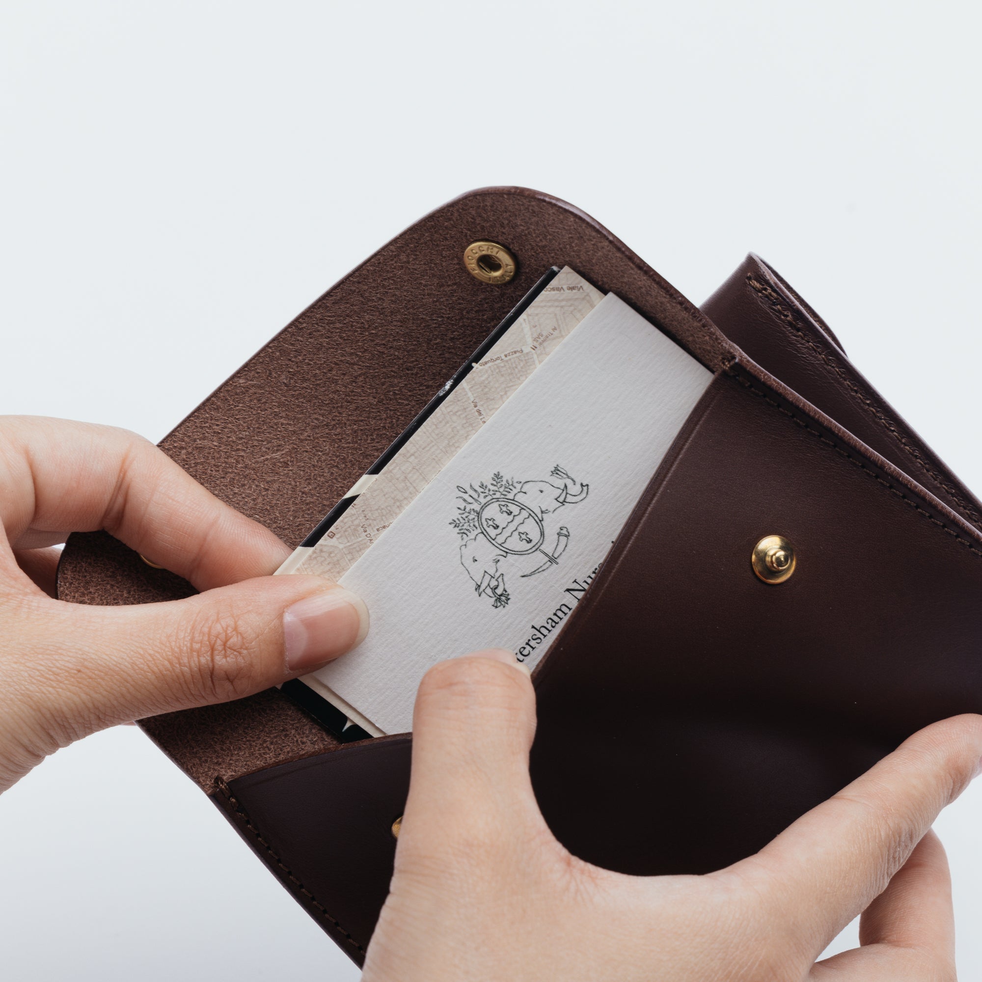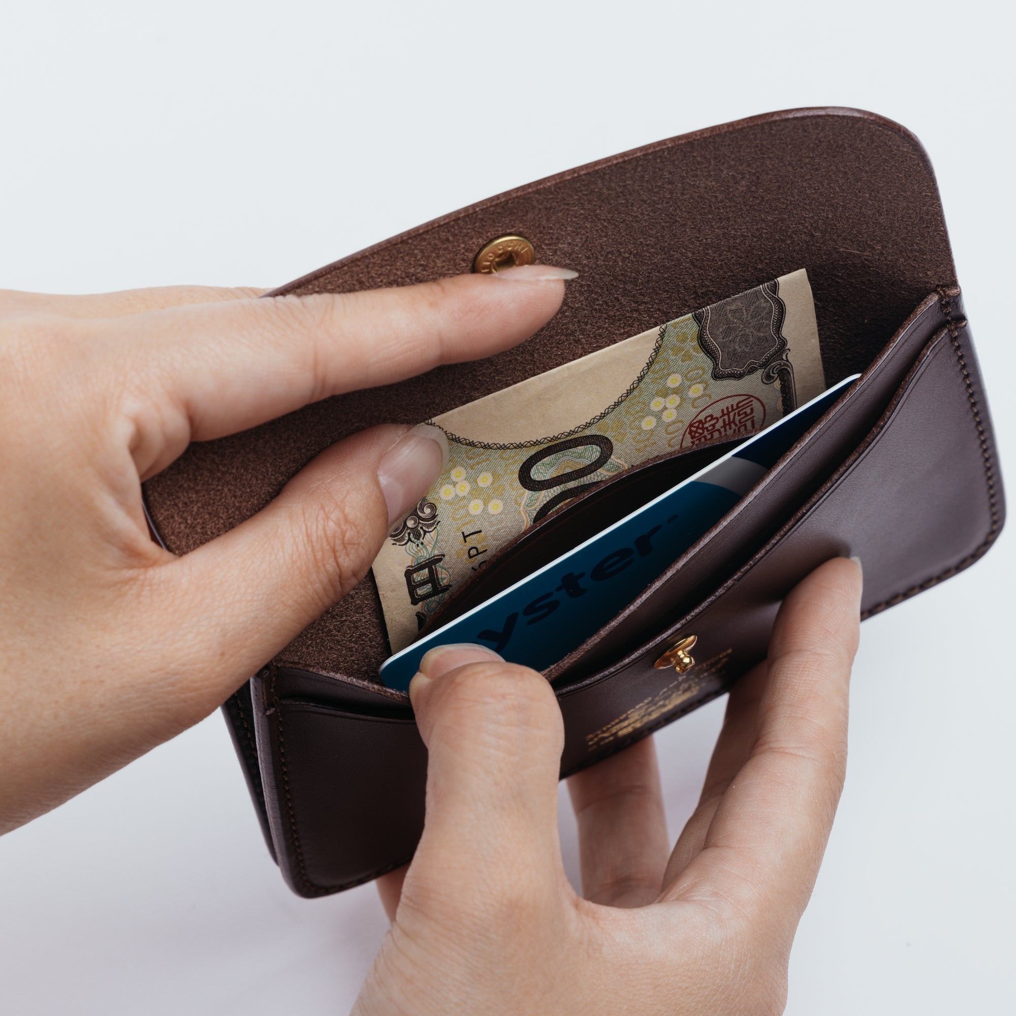 The pocket with two snaps is for coins, while the opposite side has two layers with a divider in the middle, allowing you to organize and store folded bills, receipts, cards, and more.