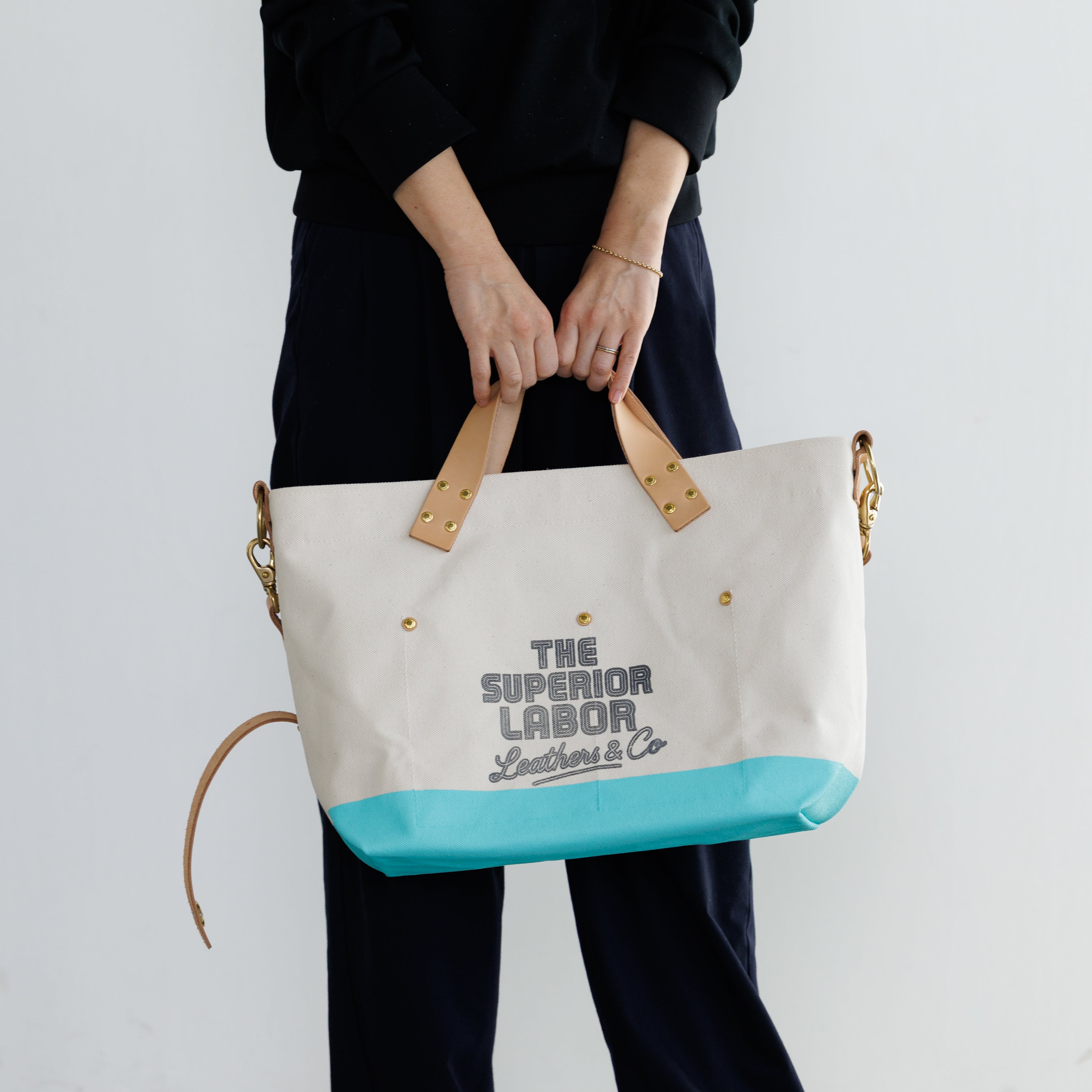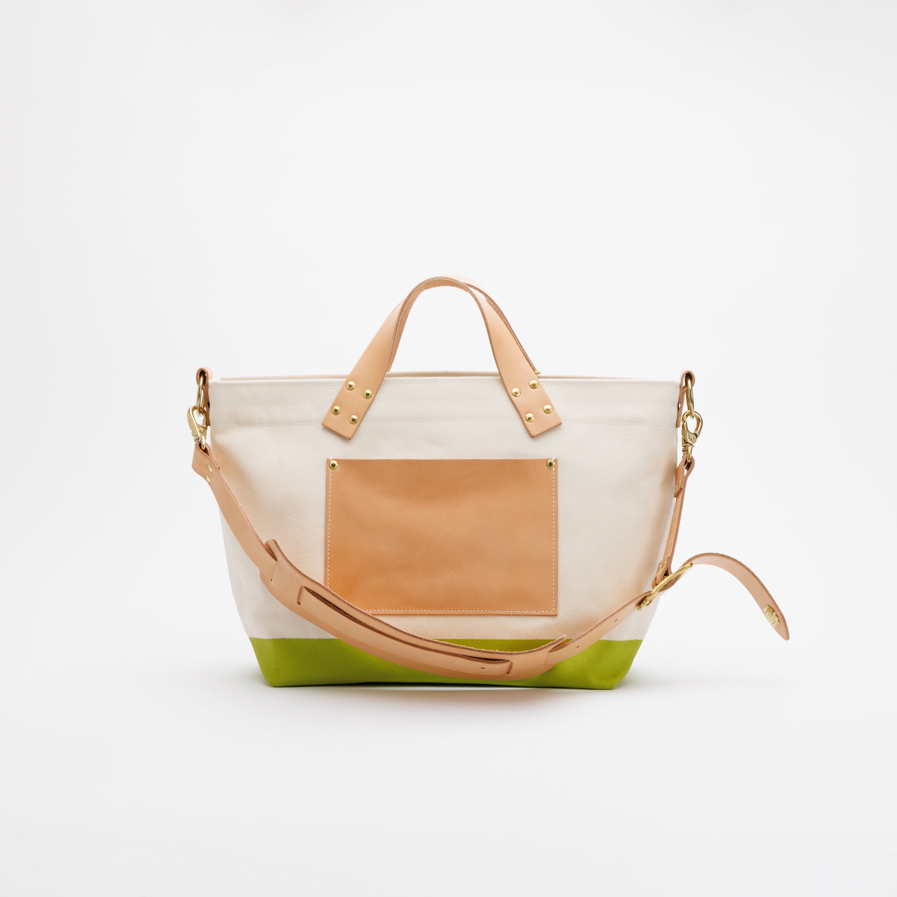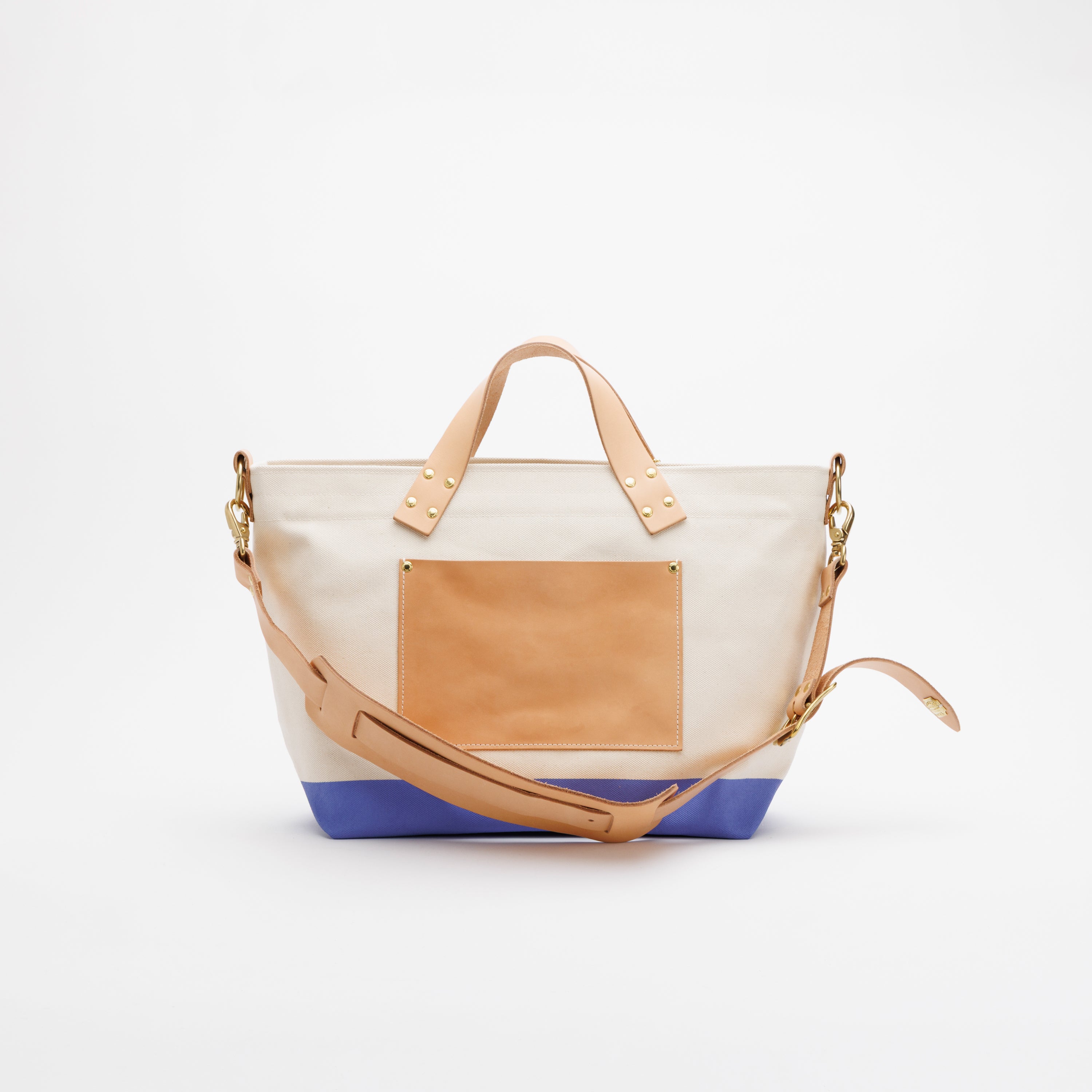 The bag is made using Kurashiki canvas, woven on shuttle looms that produce only two rolls per day, solid brass hardware cast in a traditional foundry in downtown Tokyo, and Japanese vegetable-tanned leather, tanned with tannins extracted from mimosa bark.
