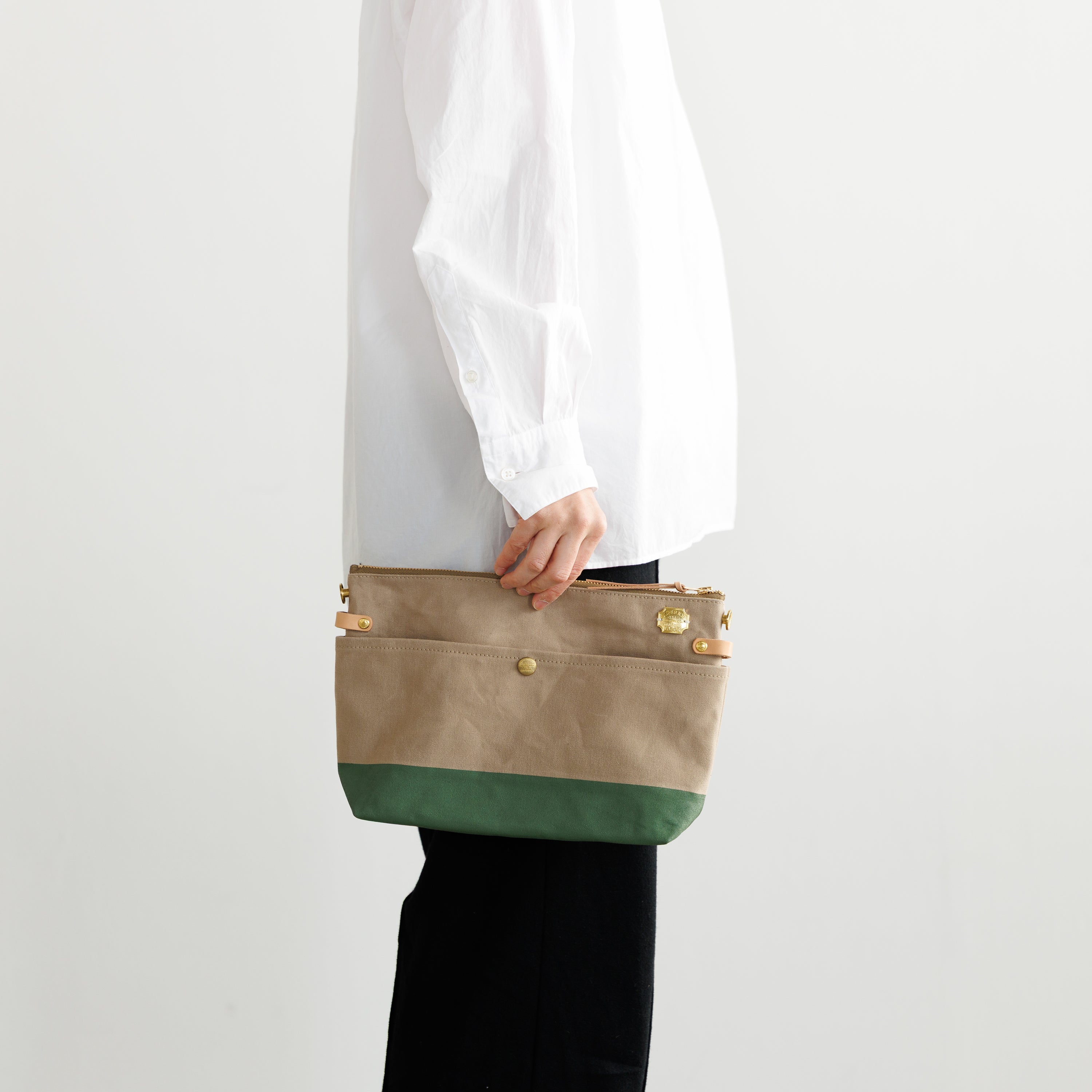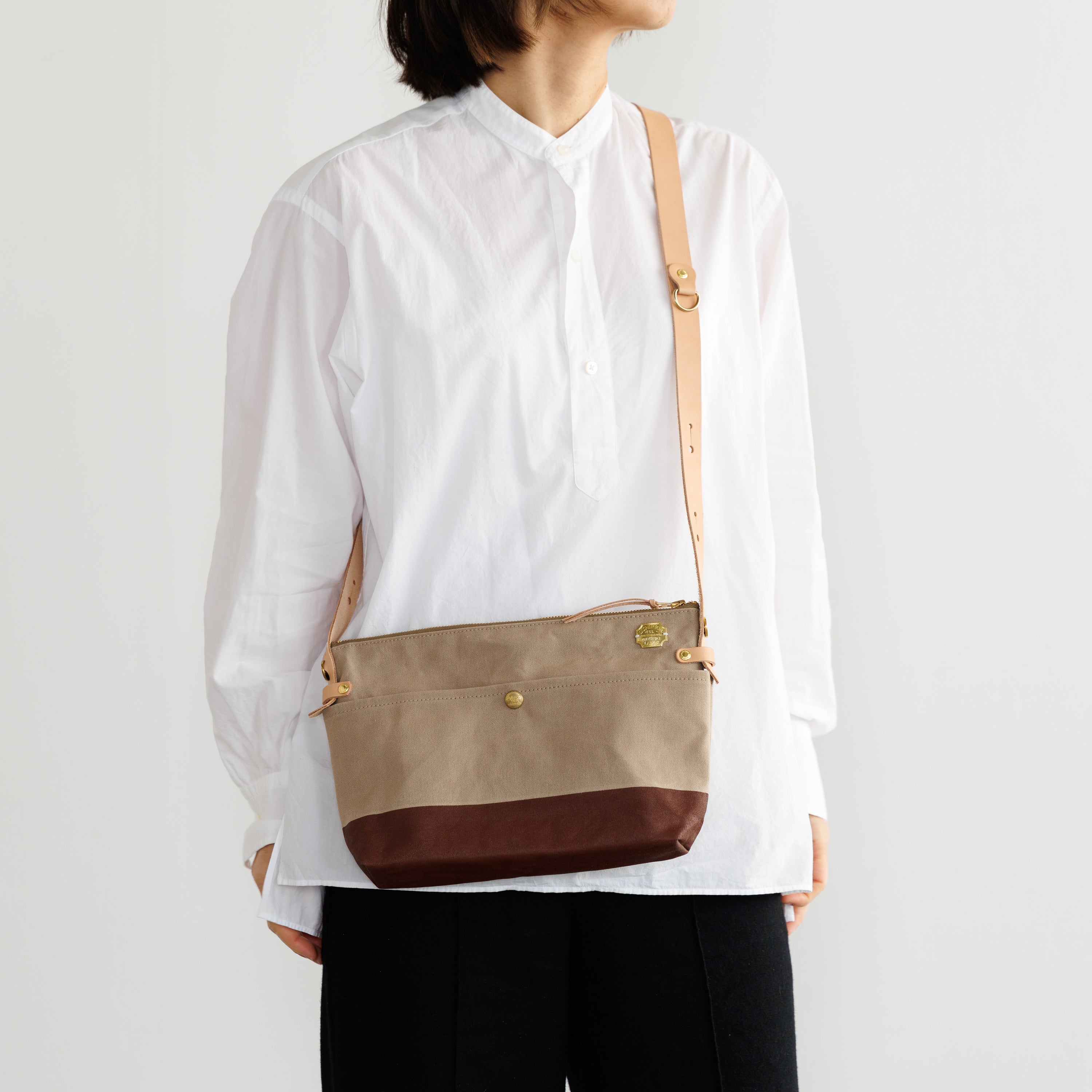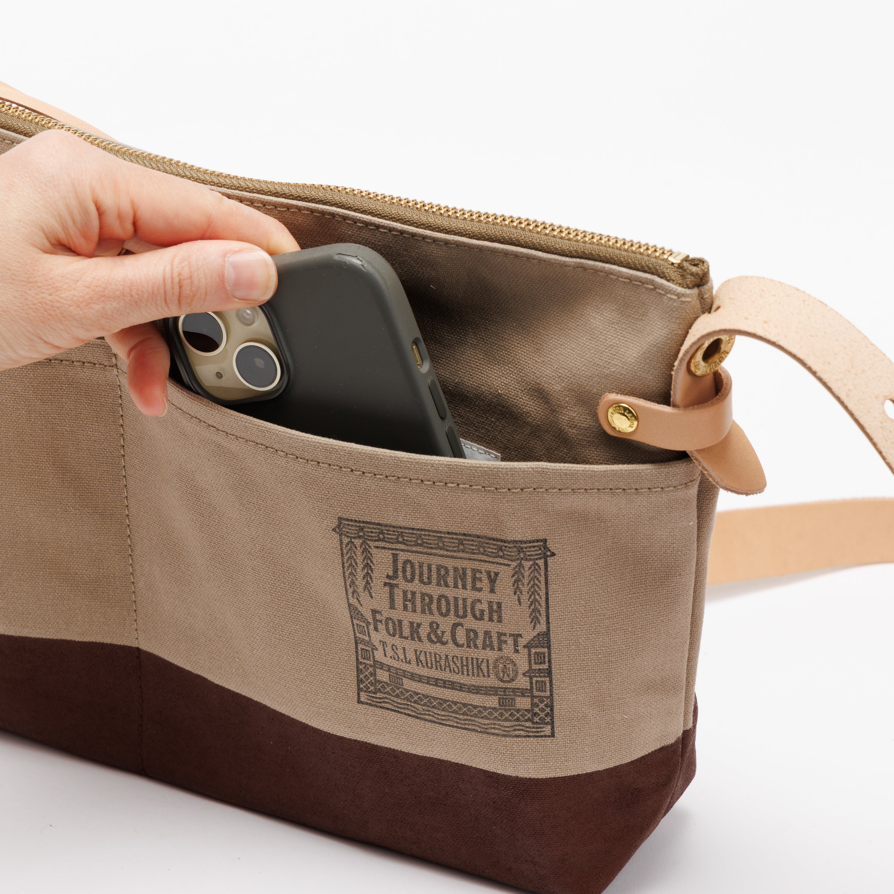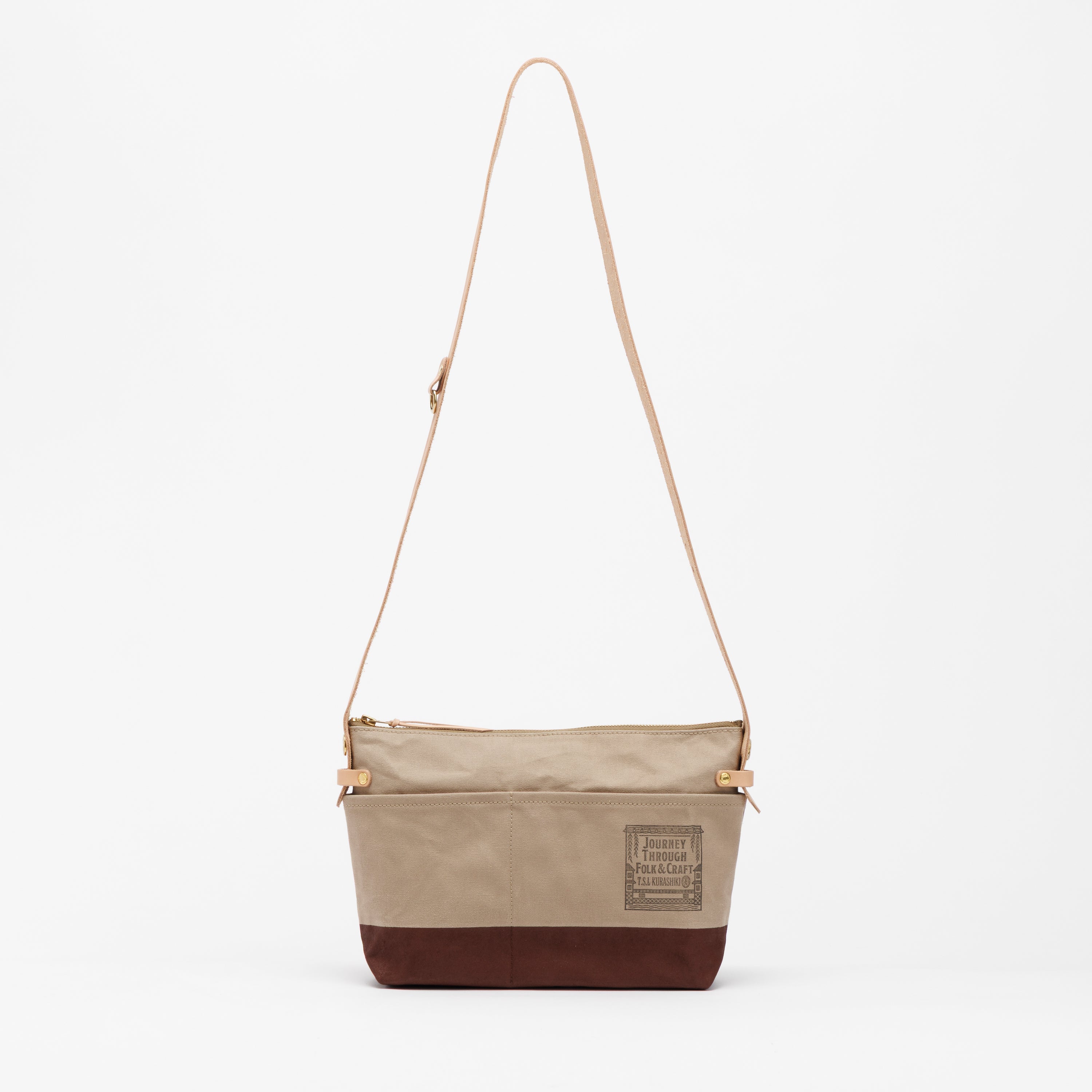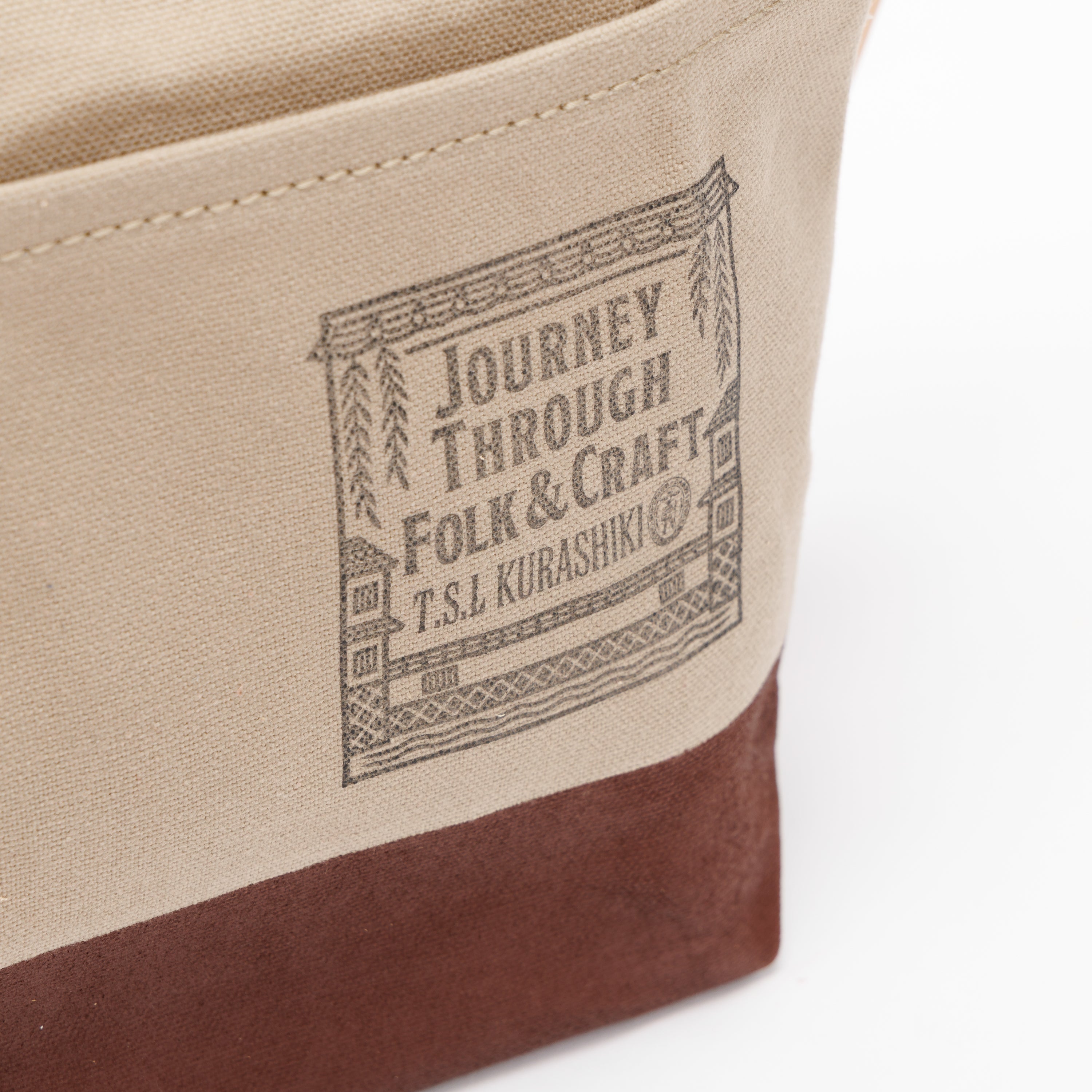 Outer pockets on both sides add storage, with a subtle stamp inspired by the streets of Kurashiki.