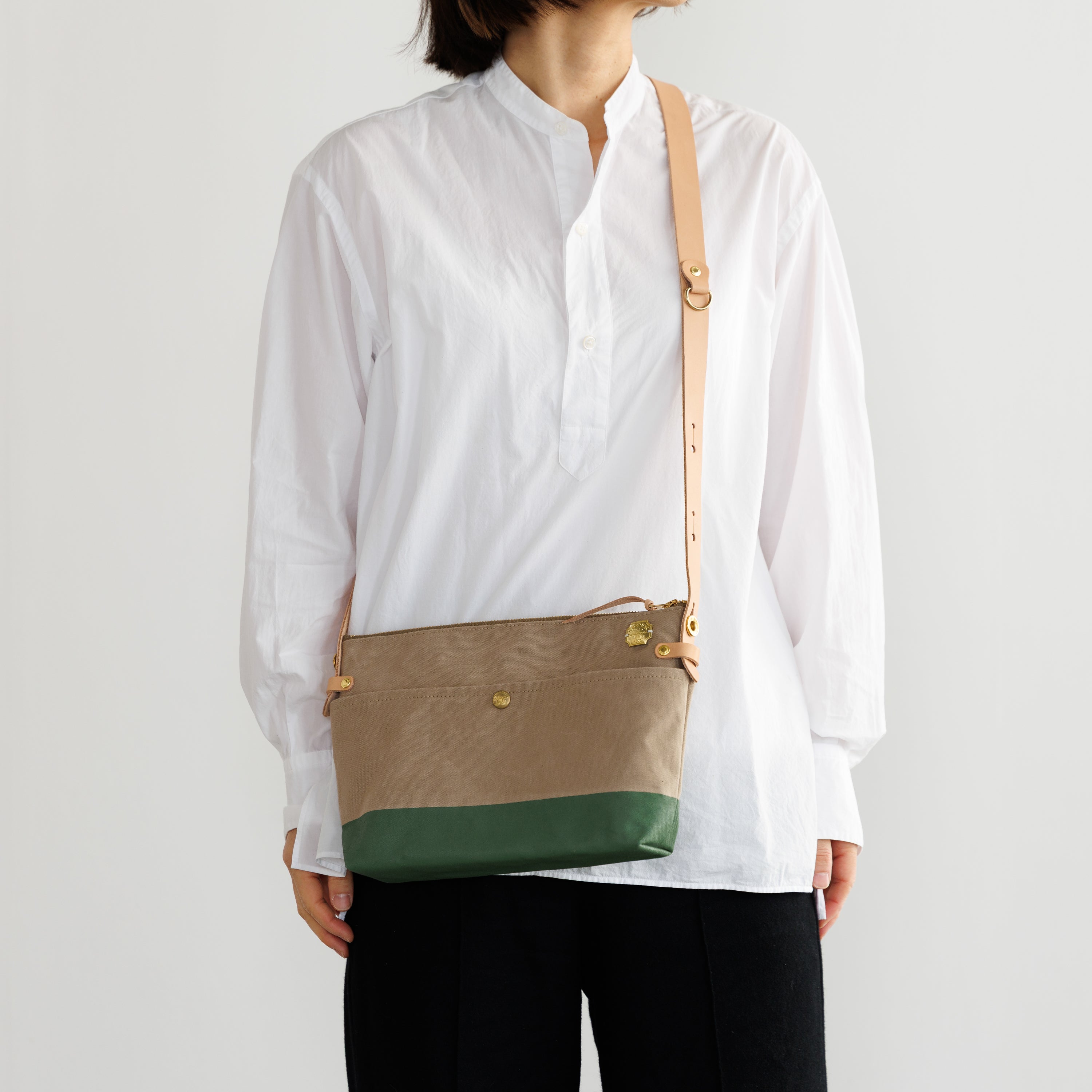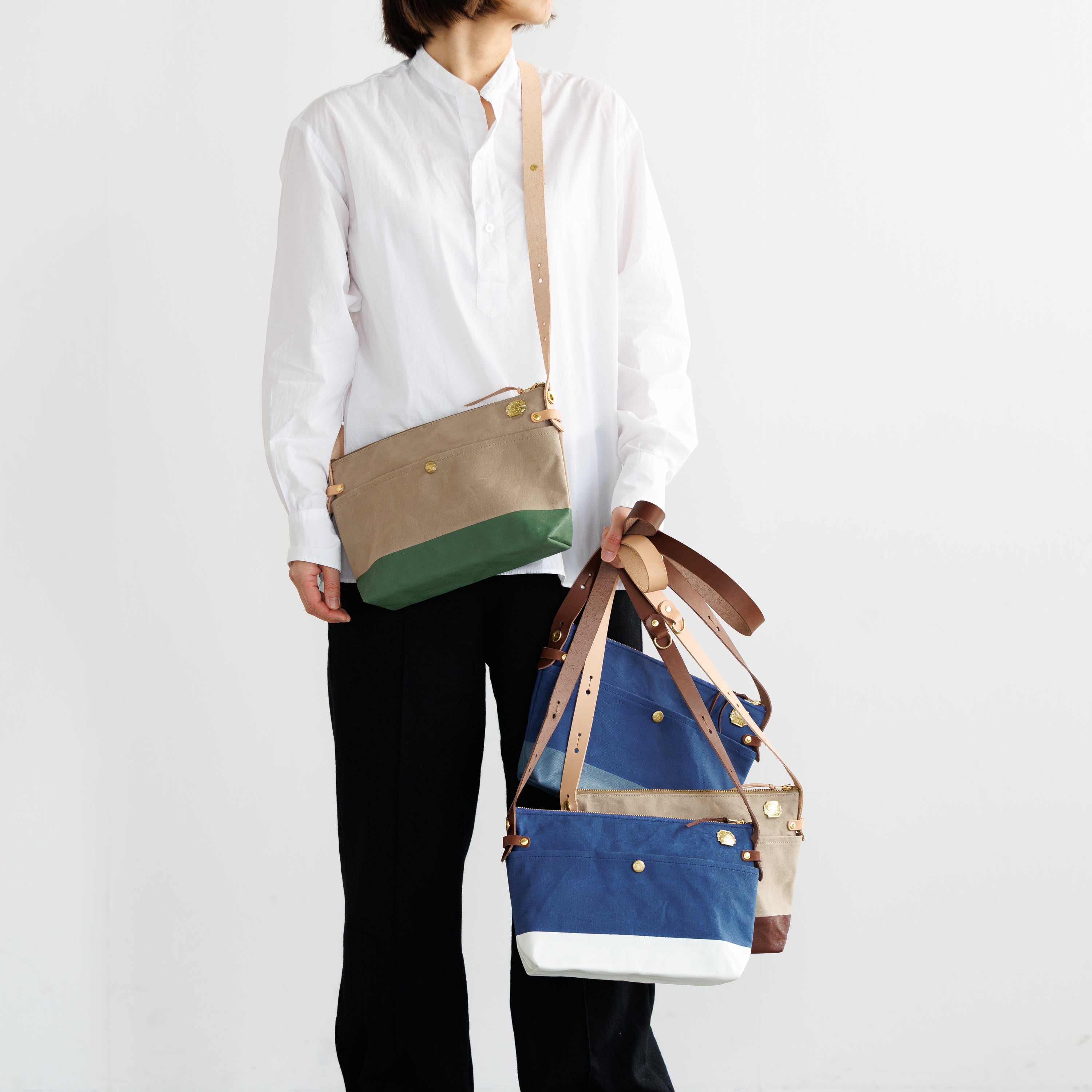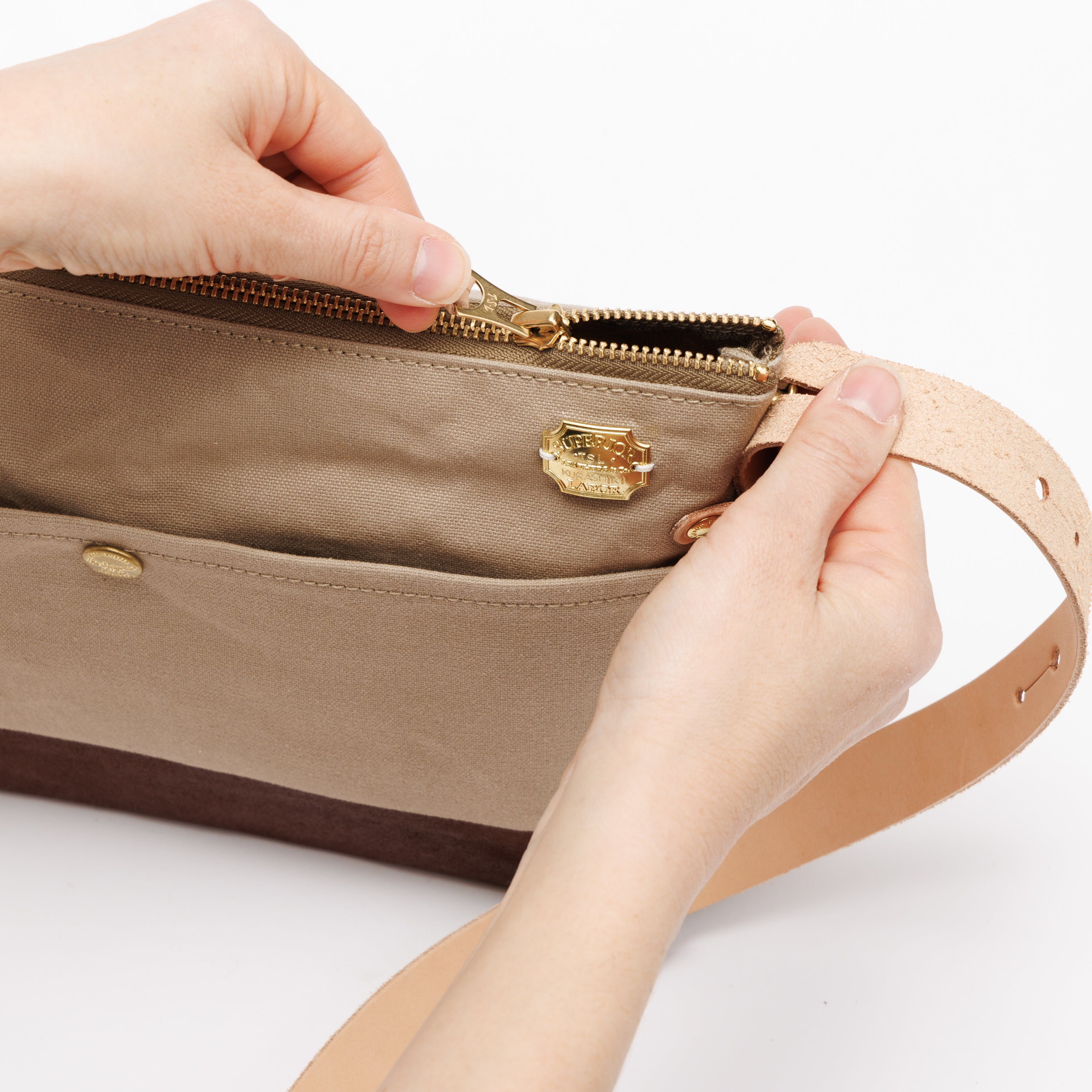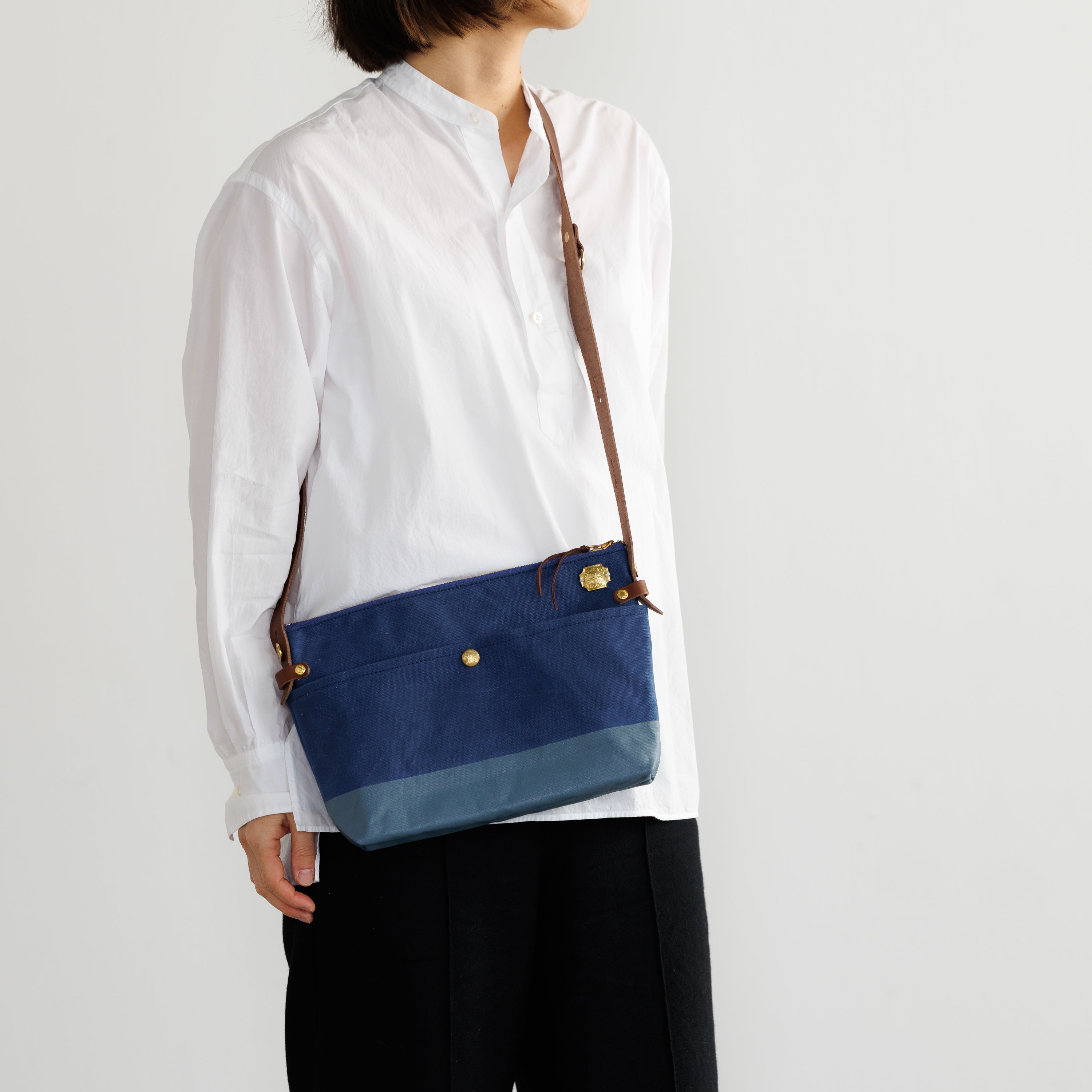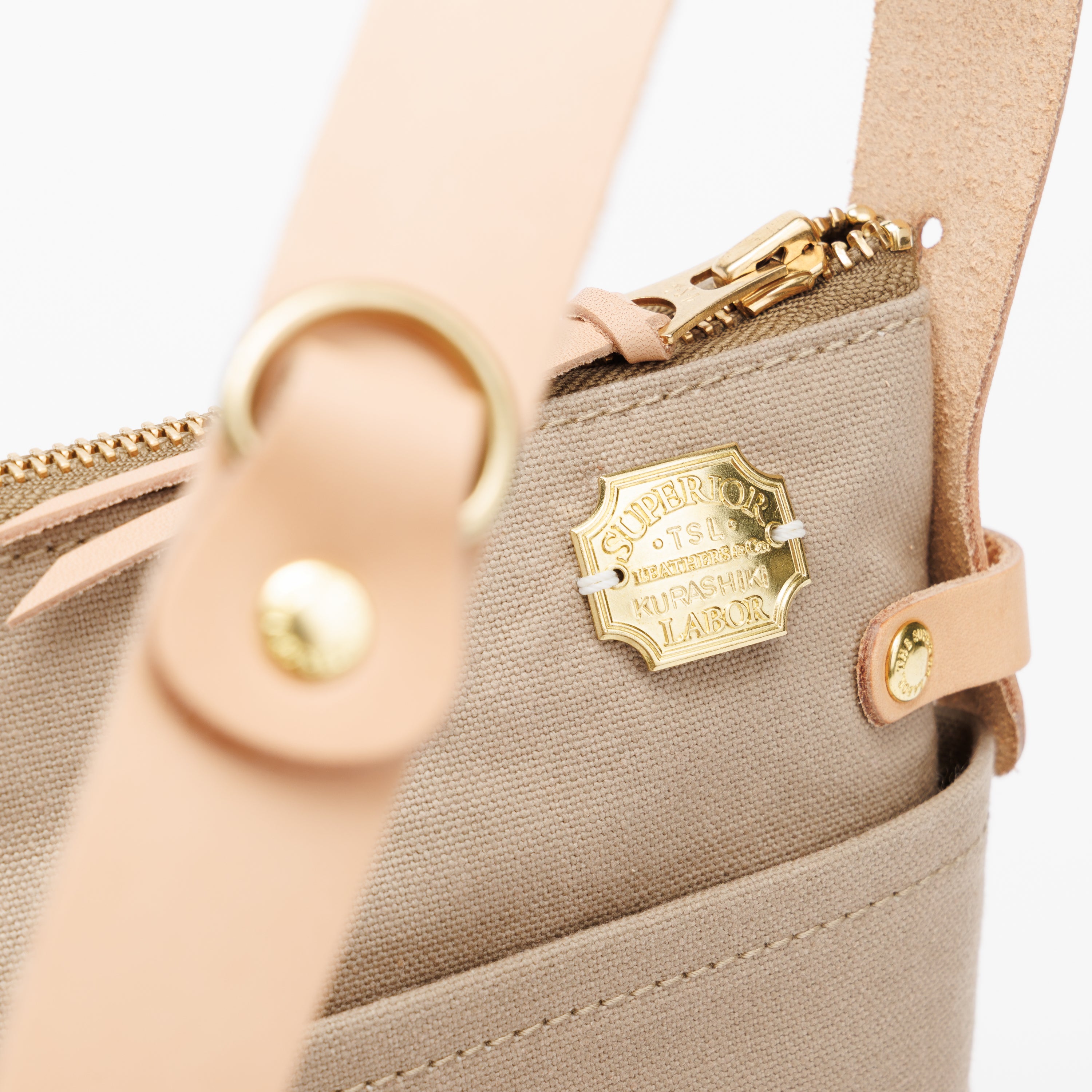Outer pockets on both sides add storage, with a subtle stamp inspired by the streets of Kurashiki.