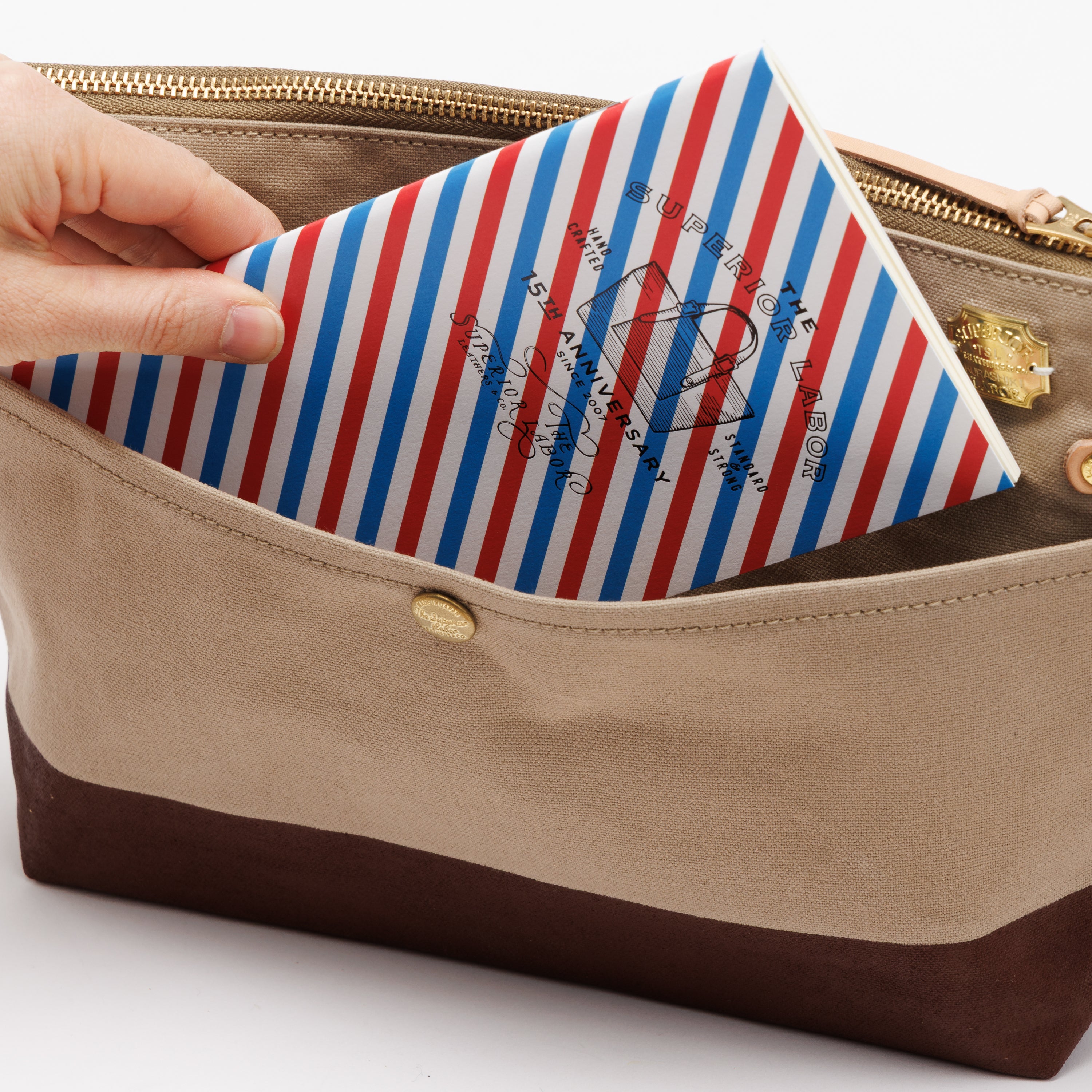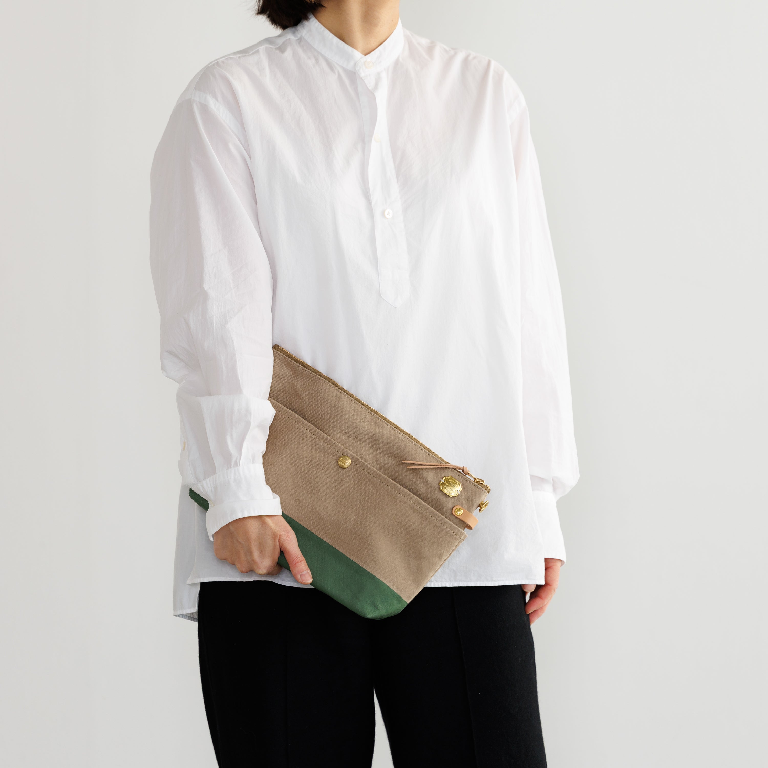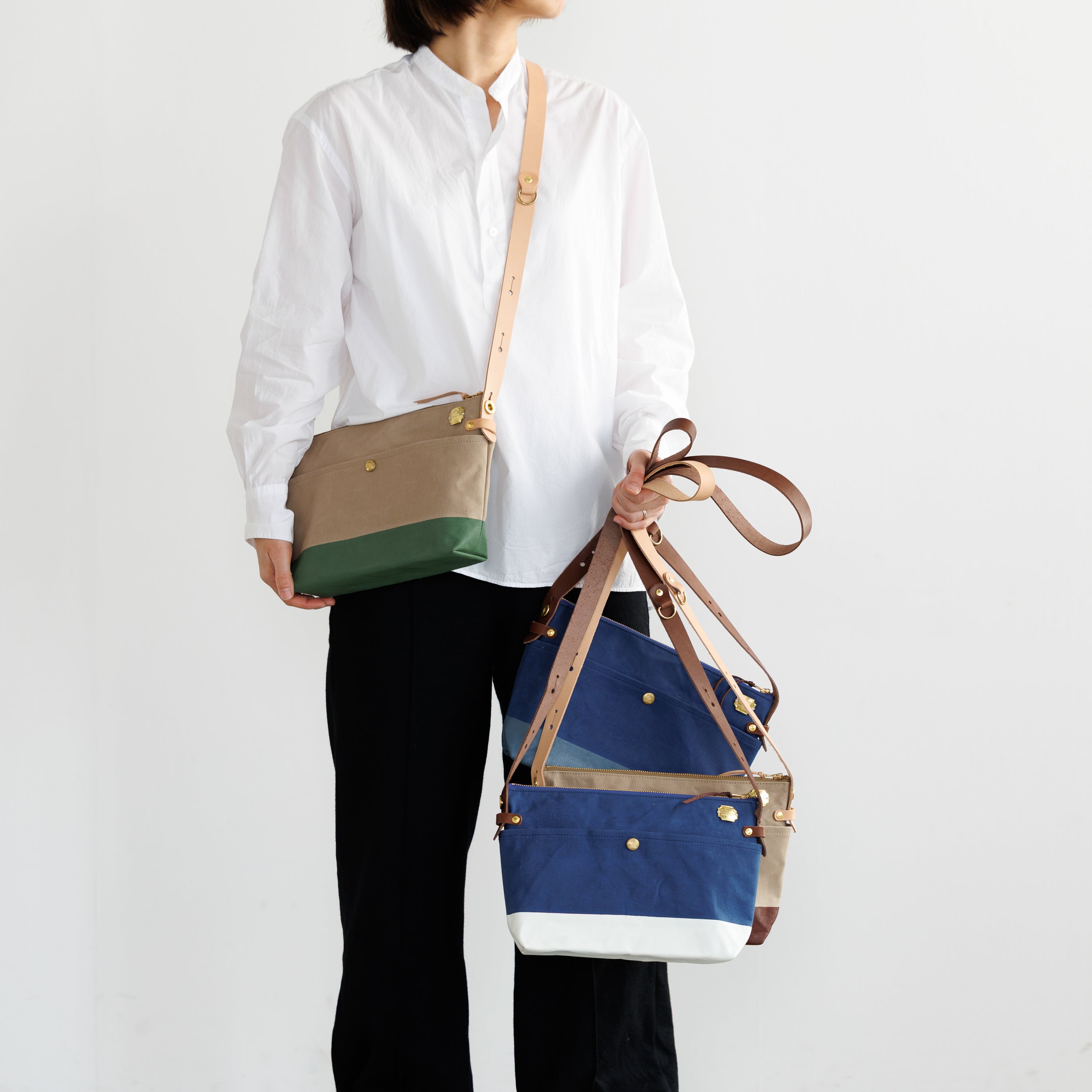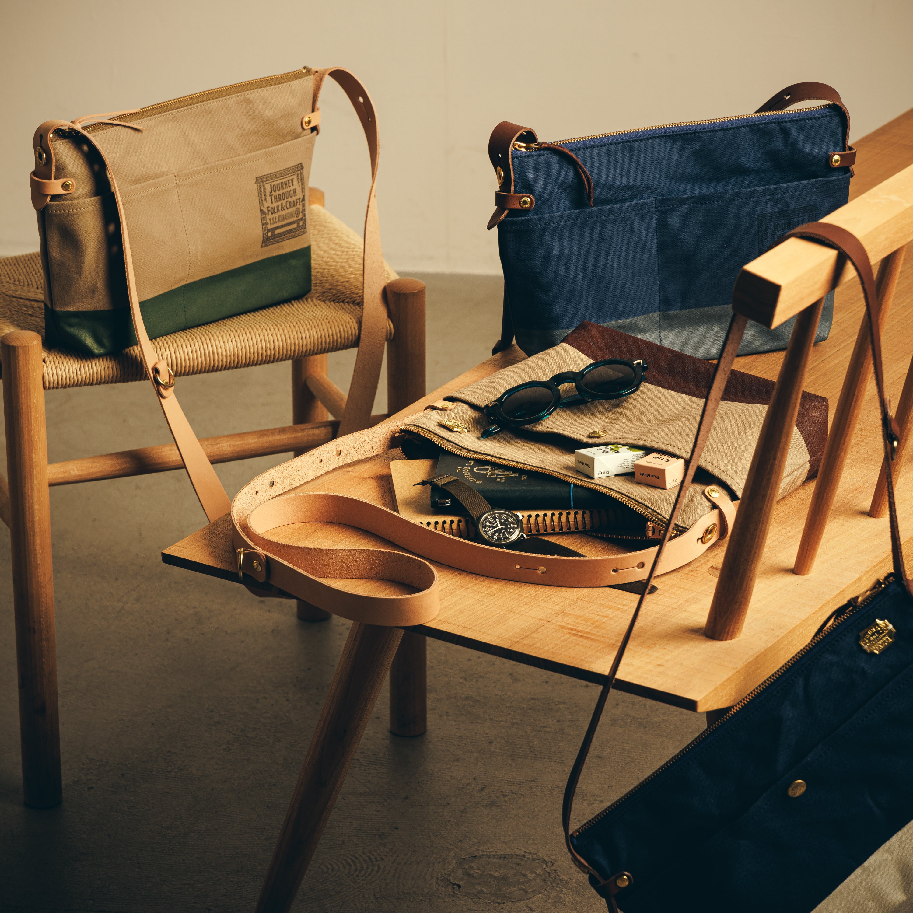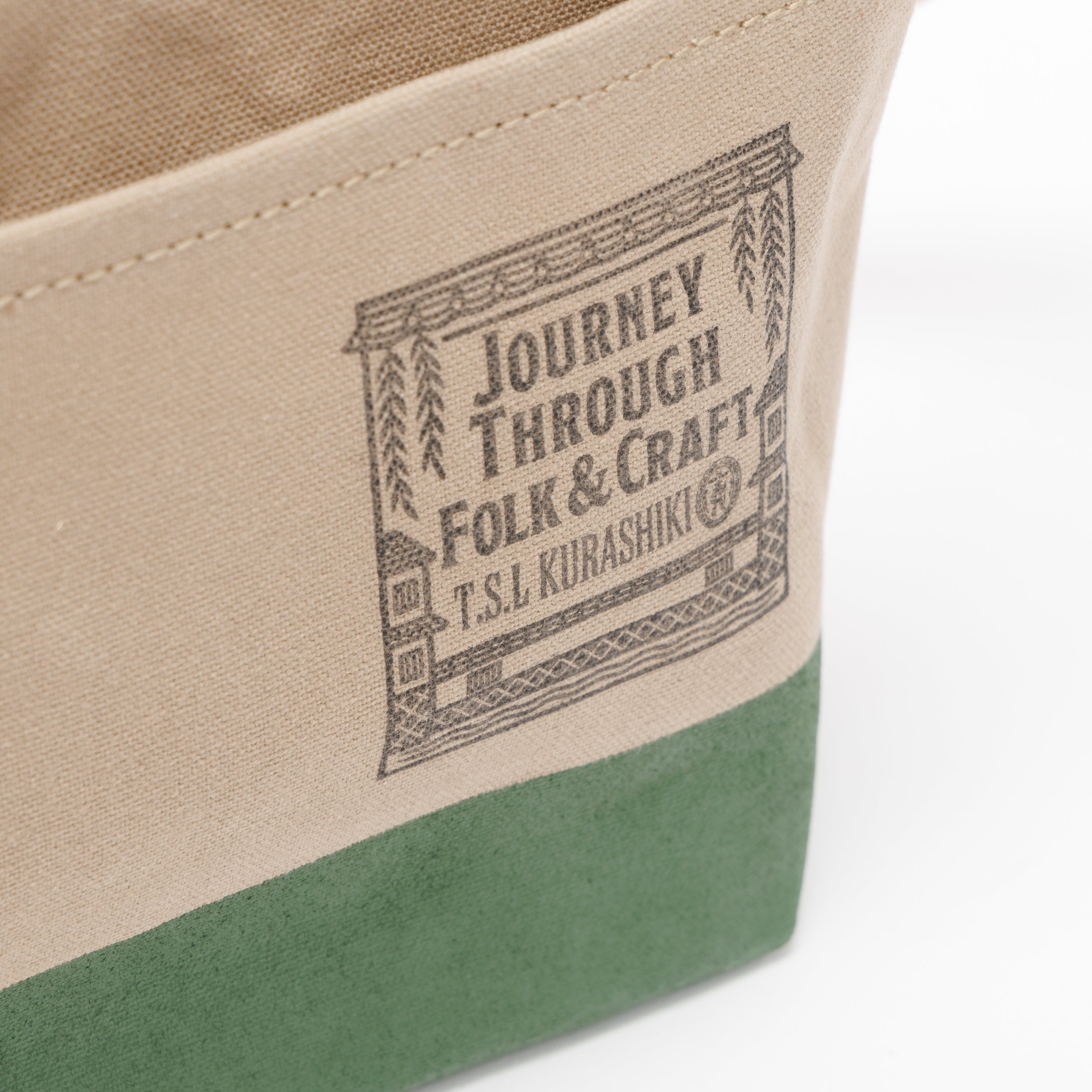 Outer pockets on both sides add storage, with a subtle stamp inspired by the streets of Kurashiki.
