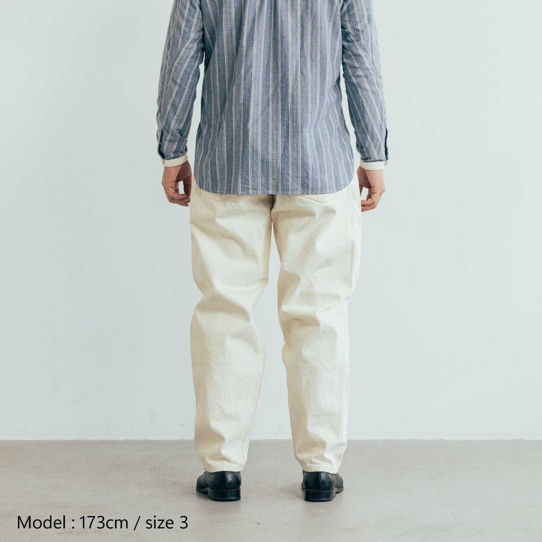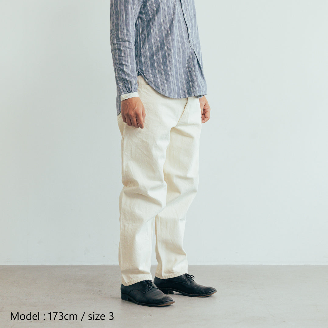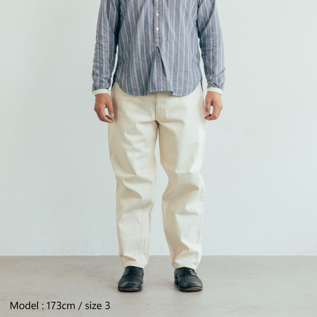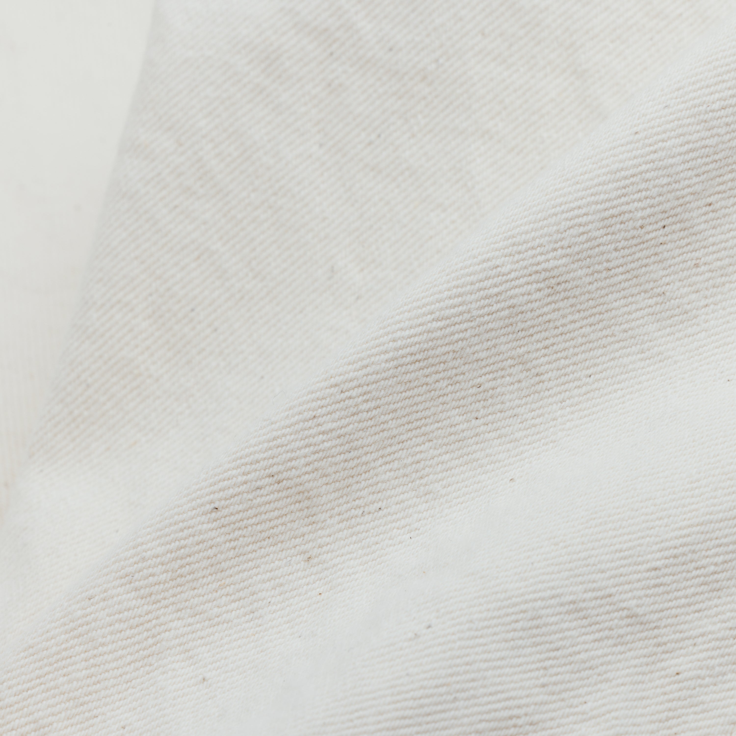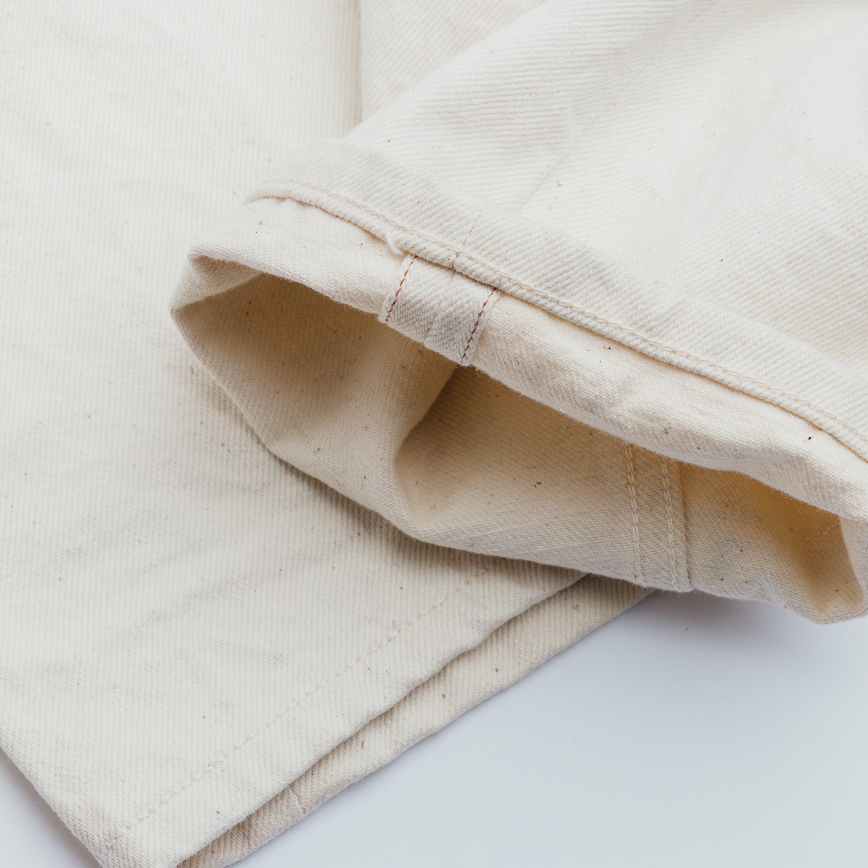 These bottoms are made from natural undyed selvedge denim fabric produced in Okayama, woven with raw yarns for both the warp and weft, leaving in natural cotton flecks.