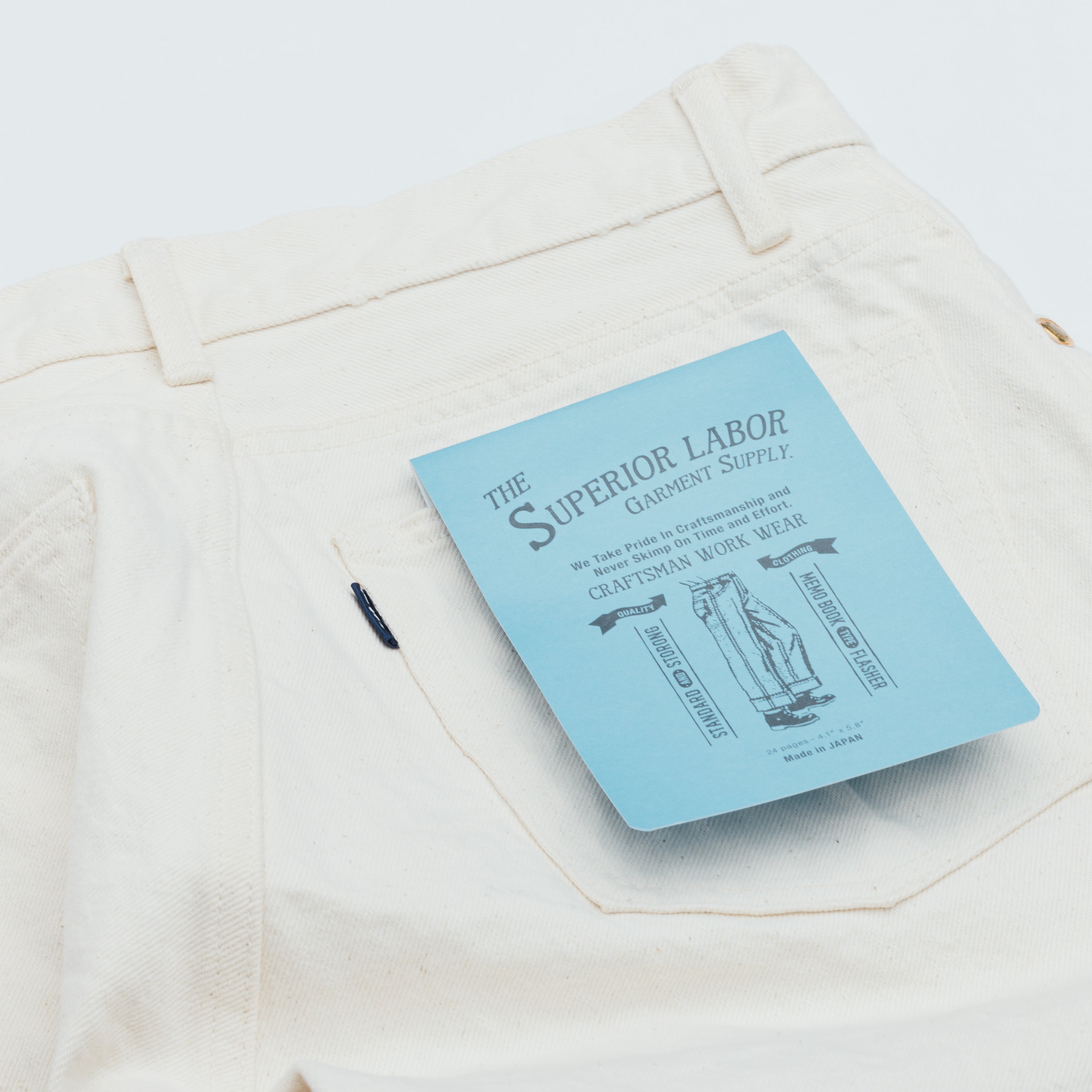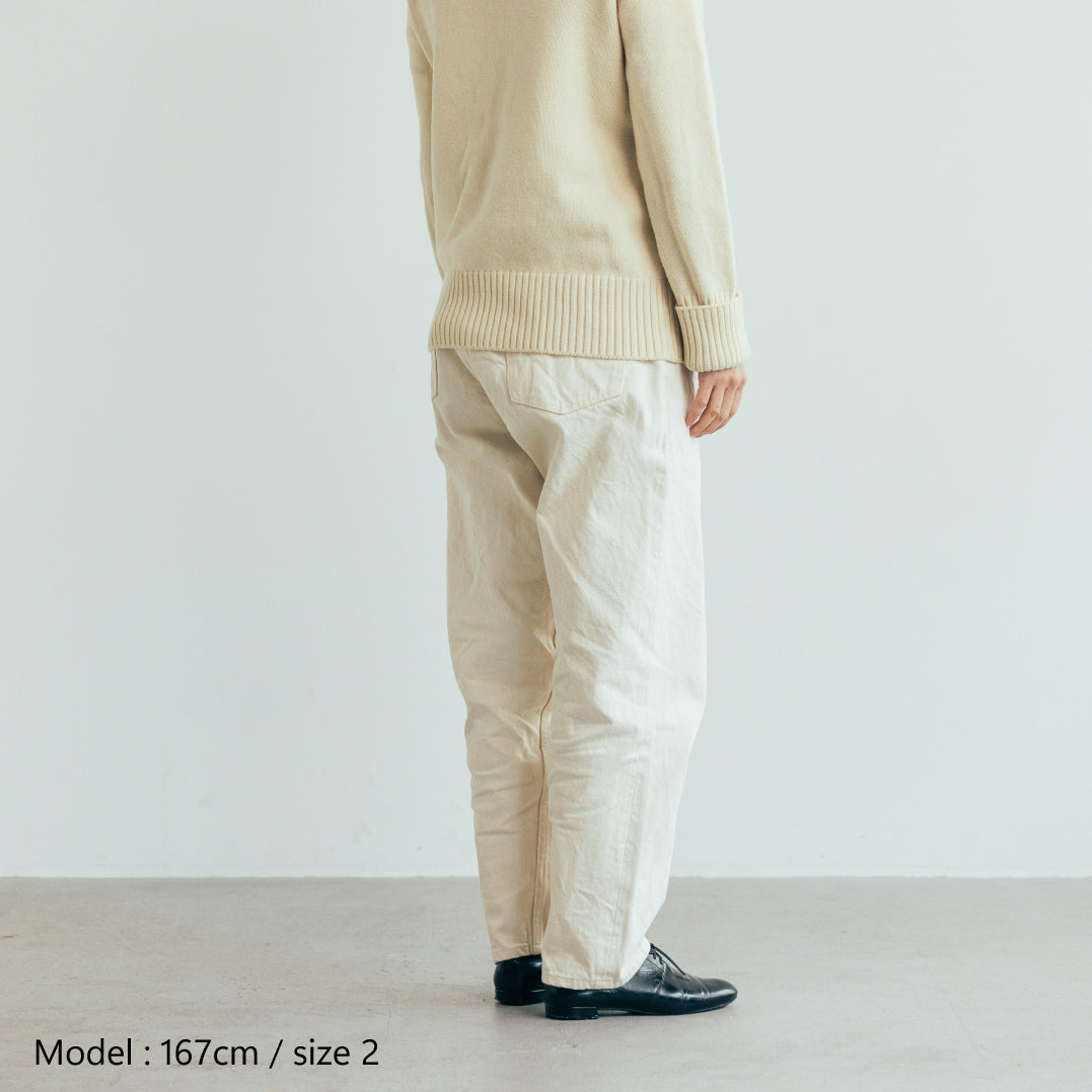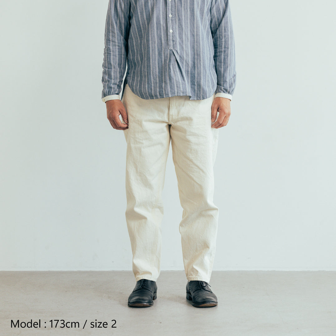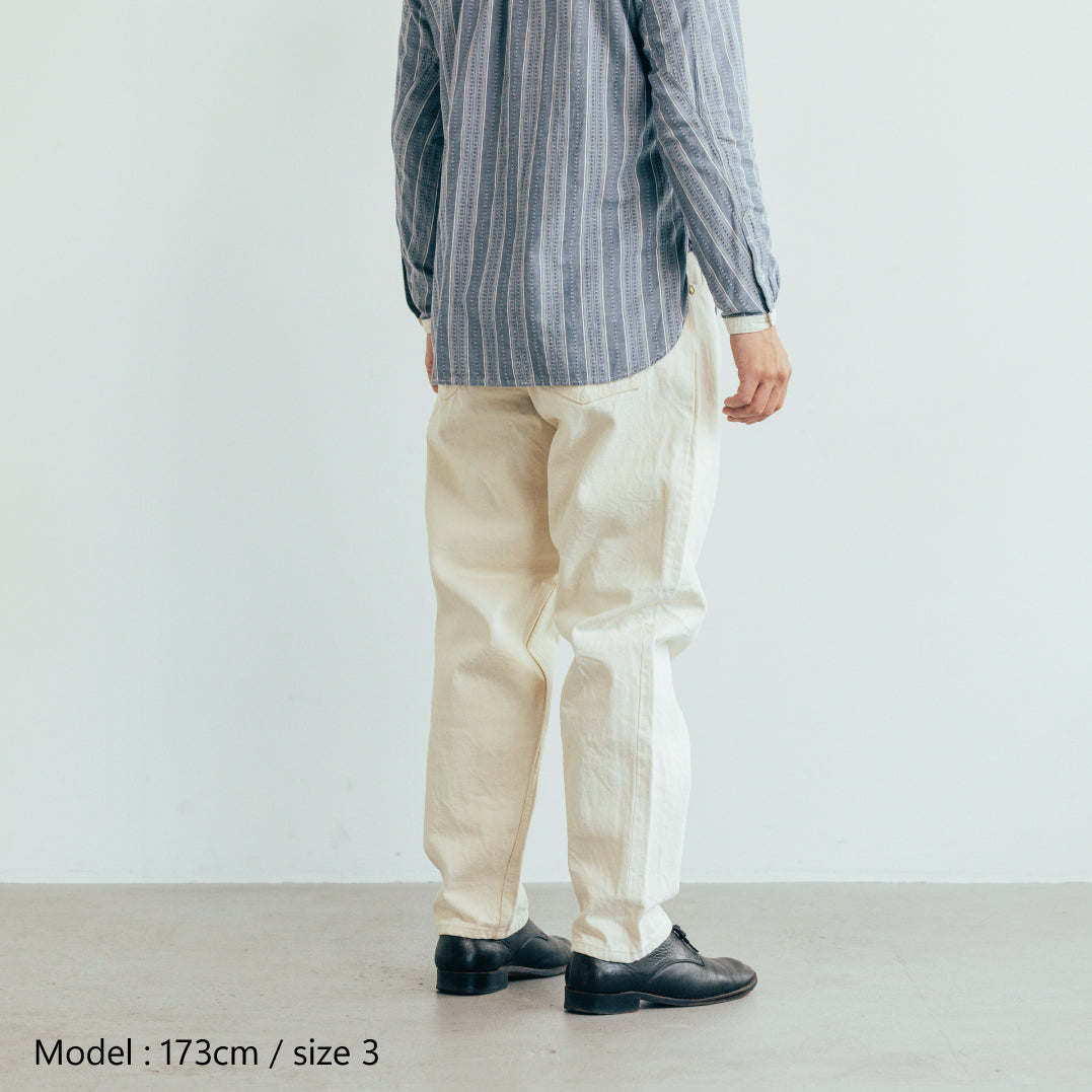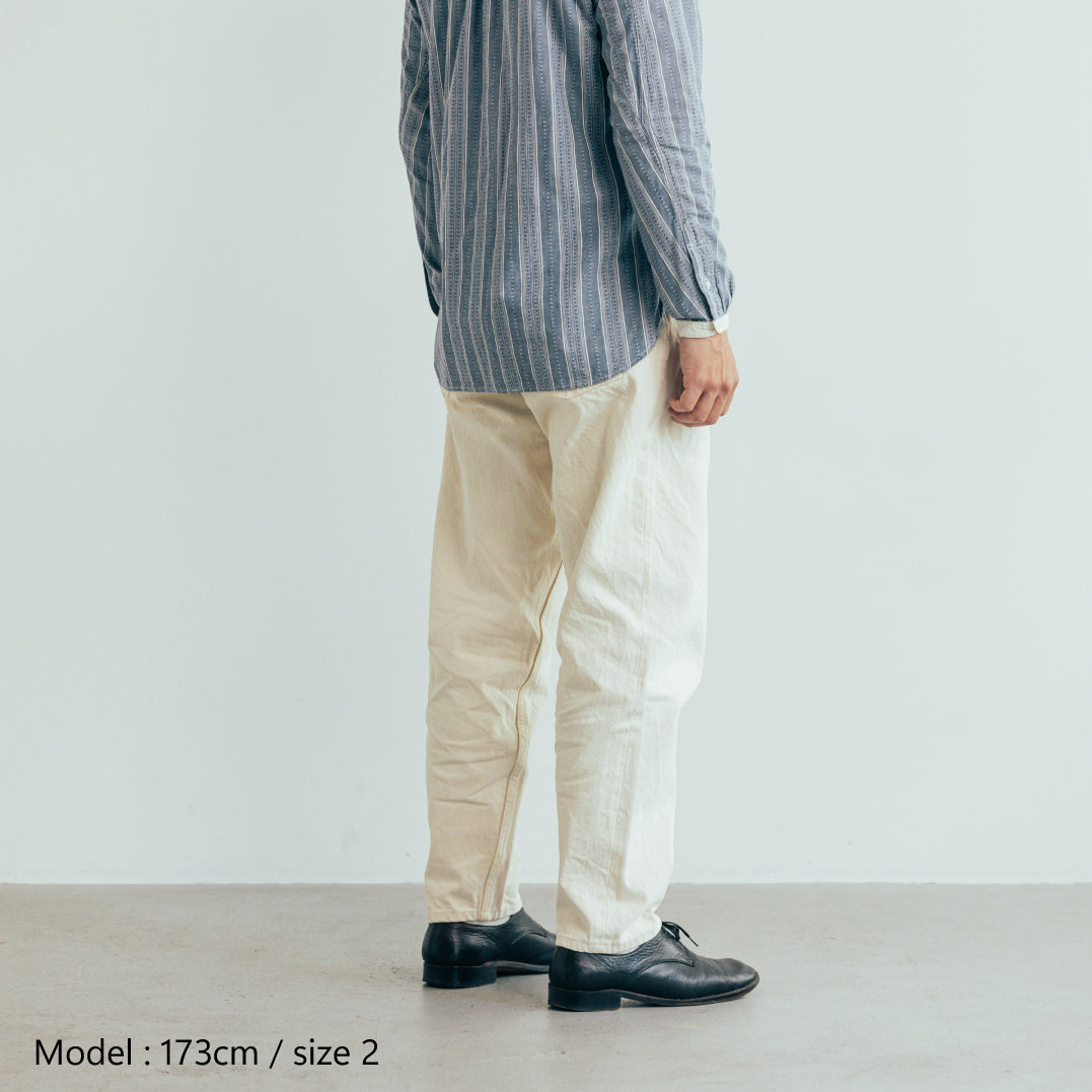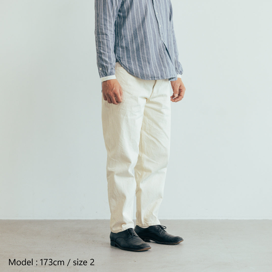These bottoms are made from natural undyed selvedge denim fabric produced in Okayama, woven with raw yarns for both the warp and weft, leaving in natural cotton flecks.