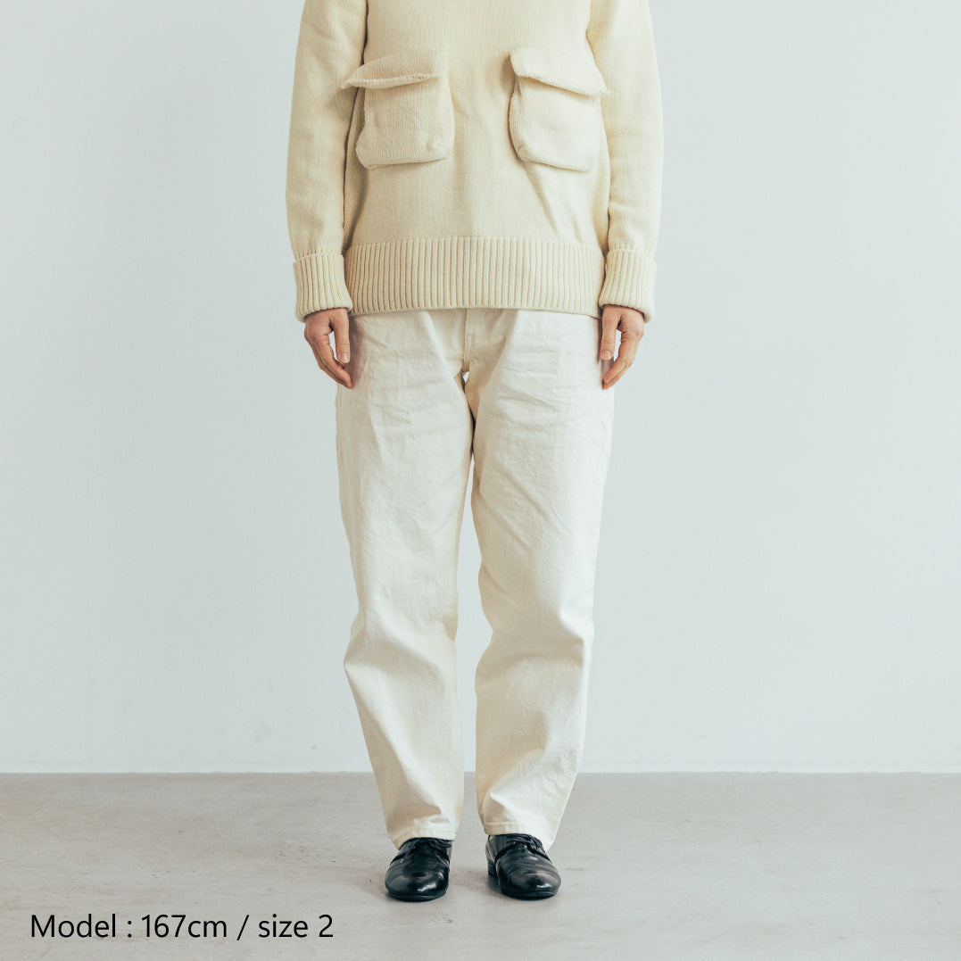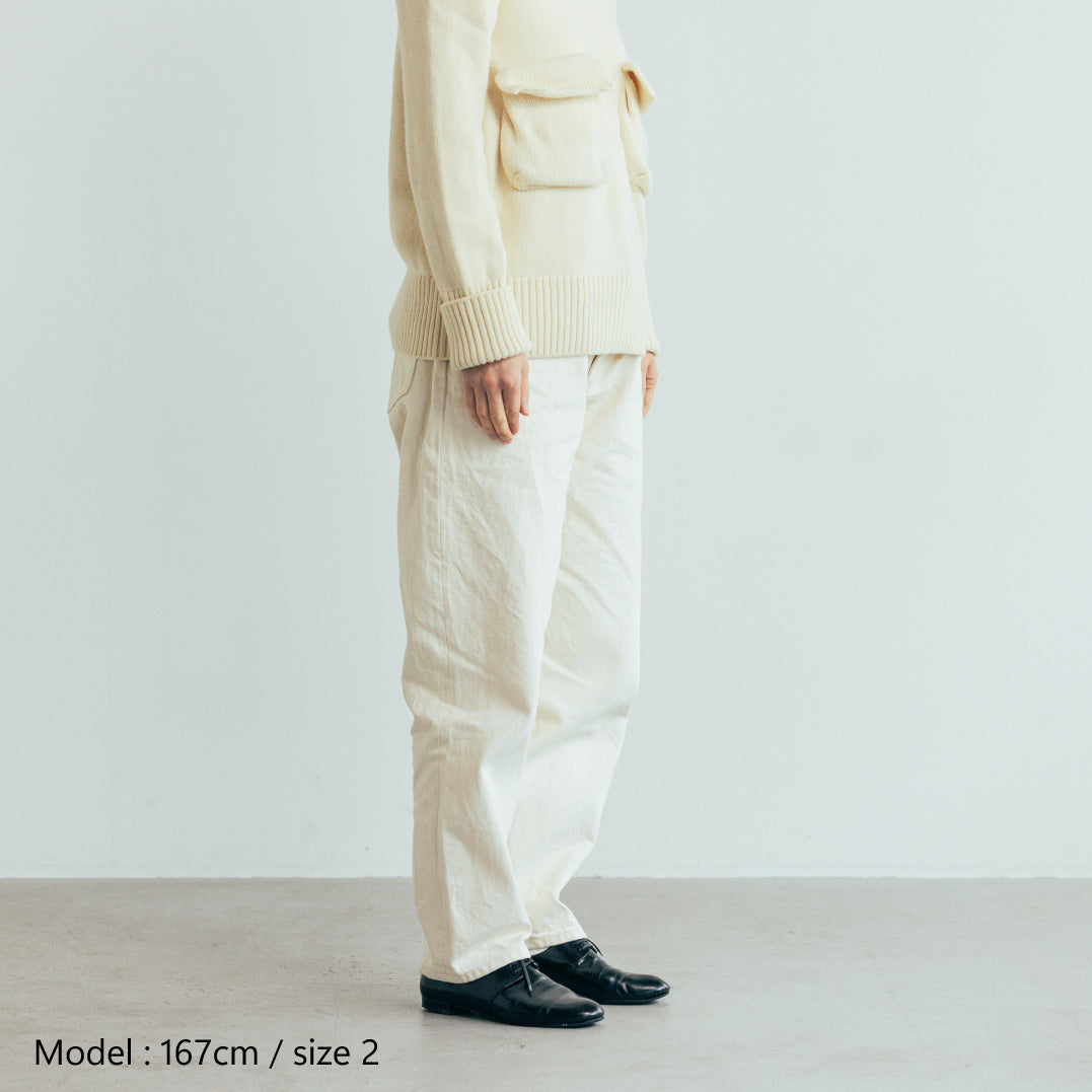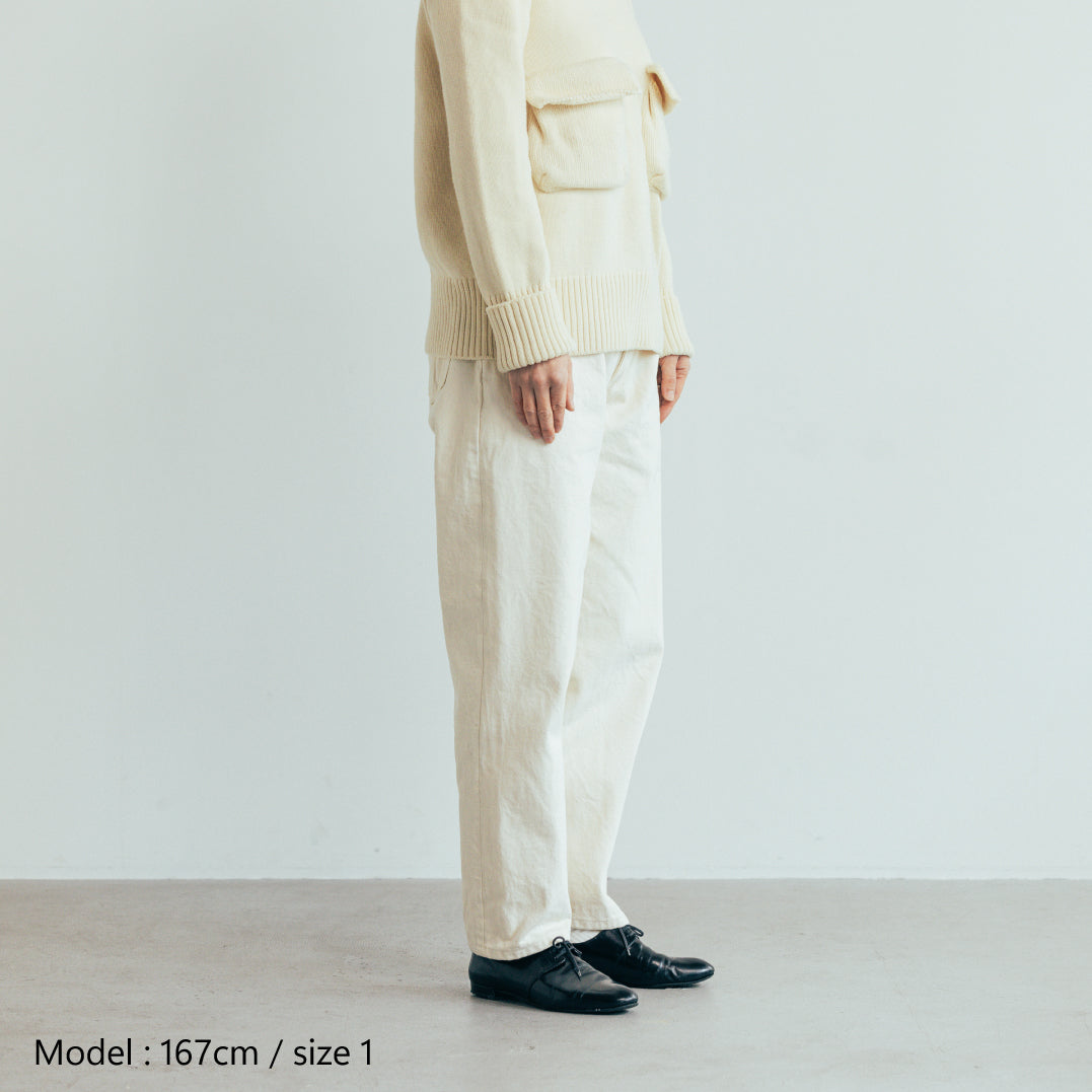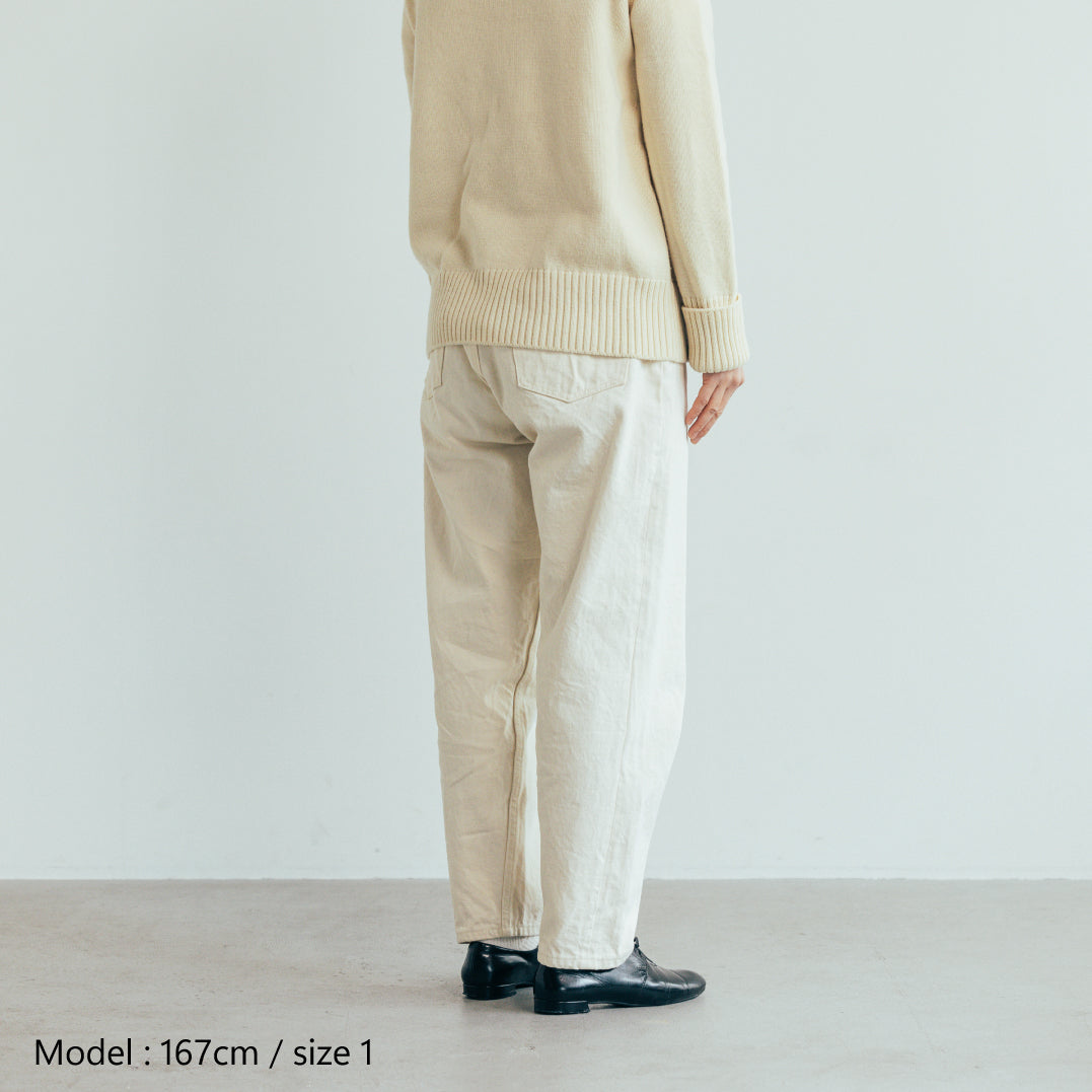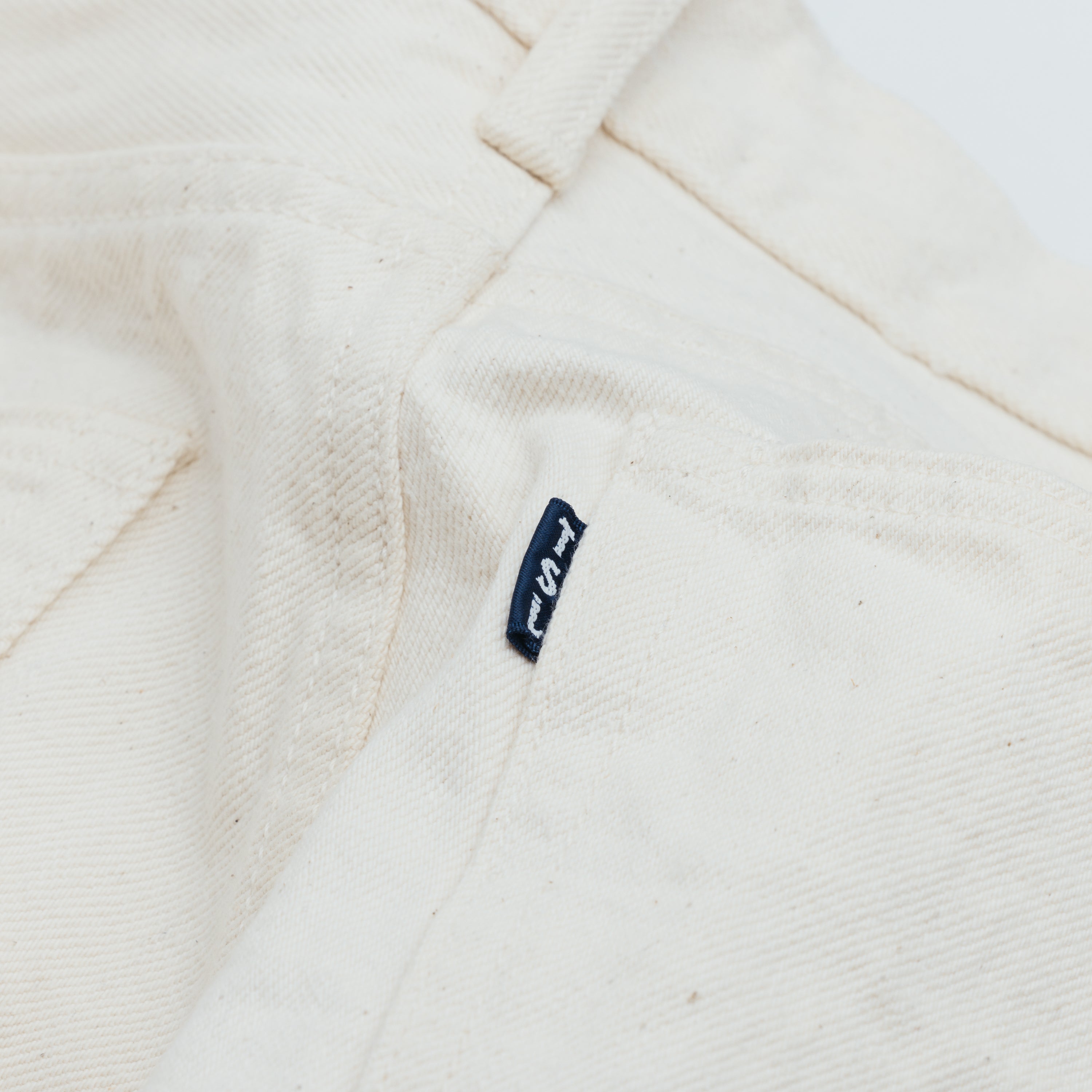 These bottoms are made from natural undyed selvedge denim fabric produced in Okayama, woven with raw yarns for both the warp and weft, leaving in natural cotton flecks.