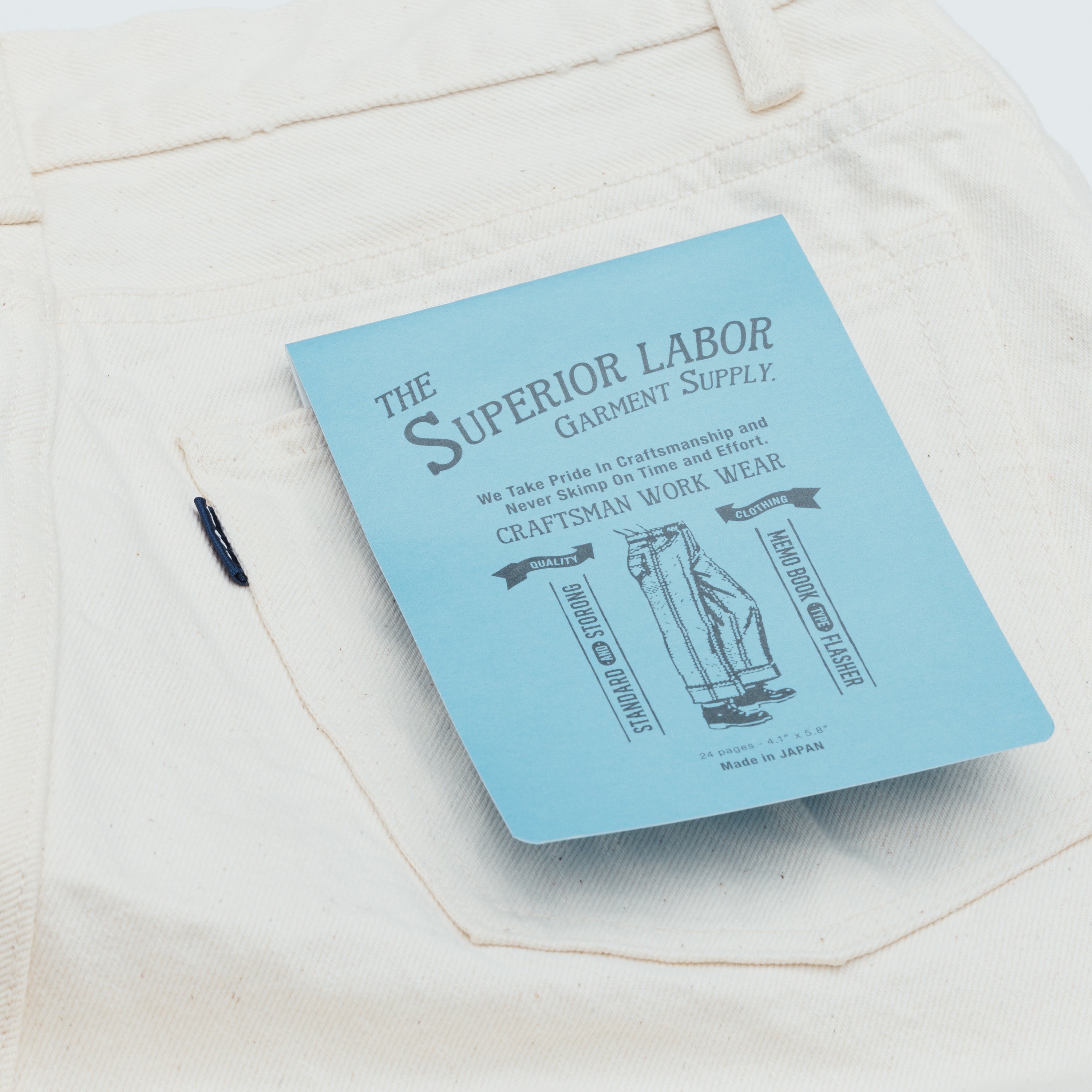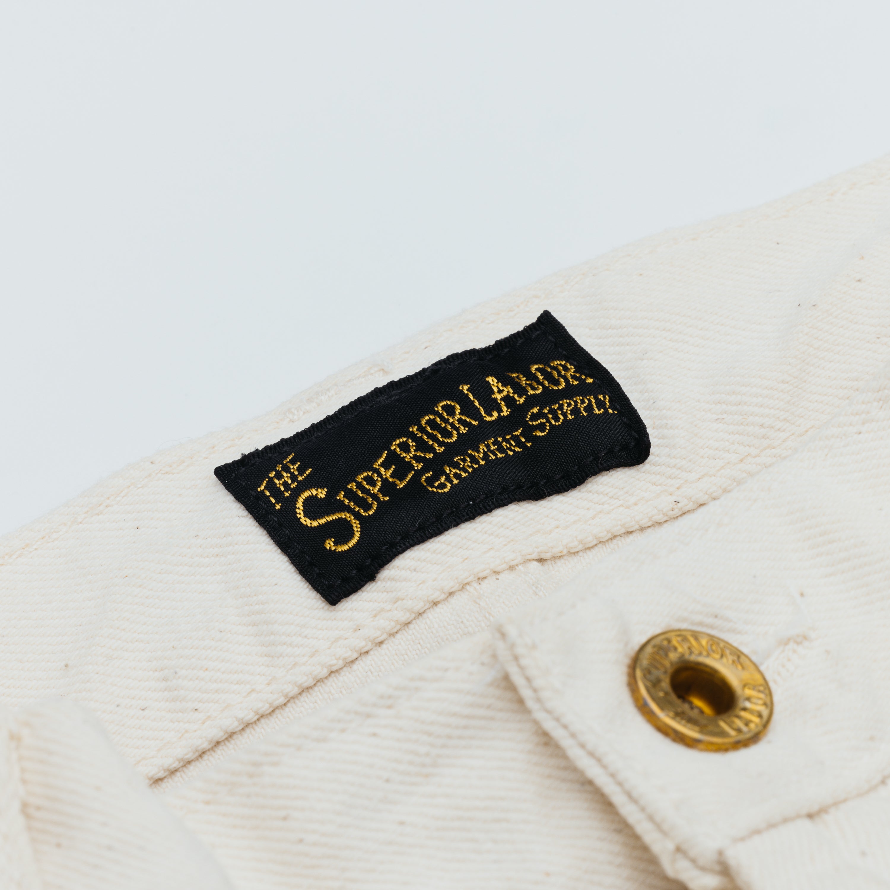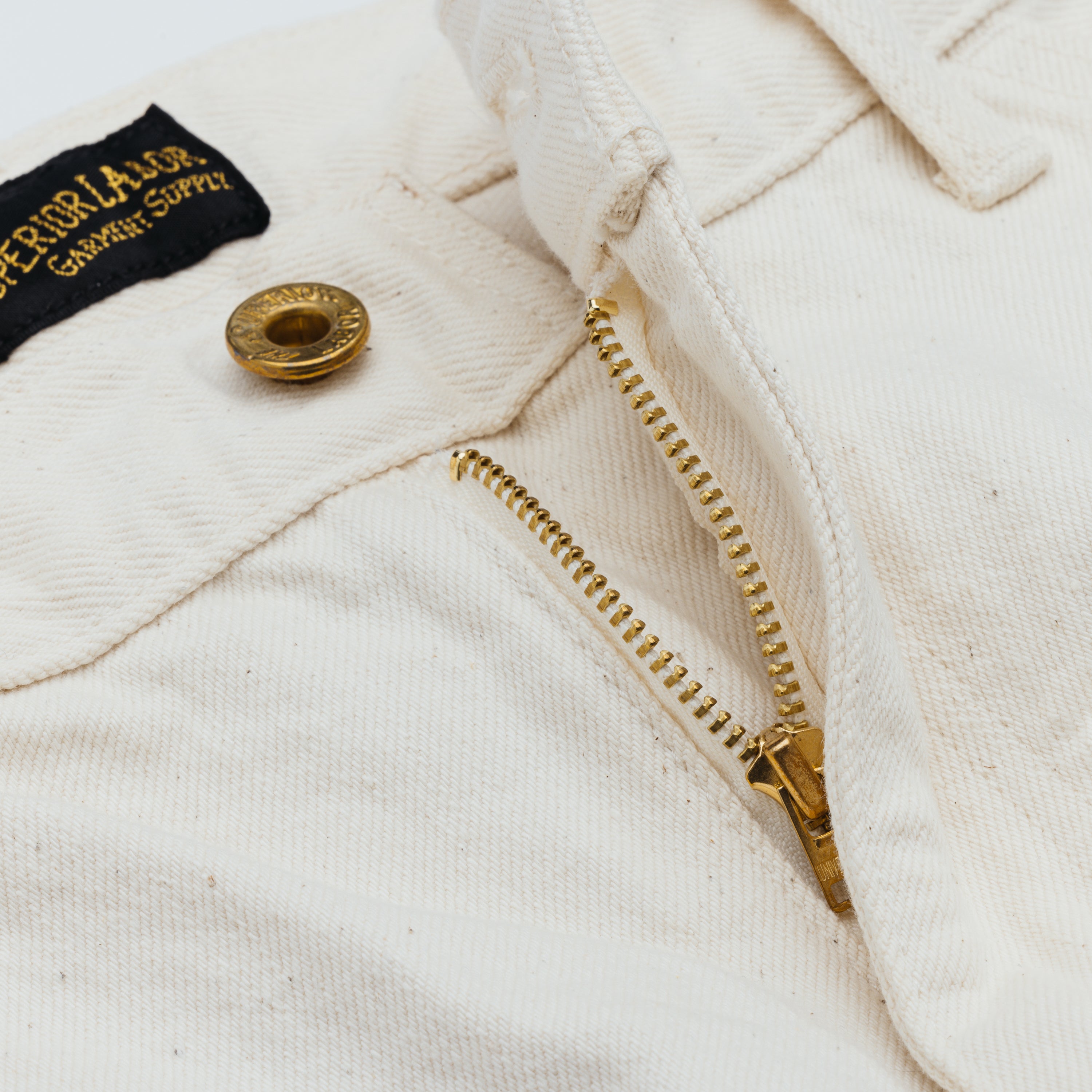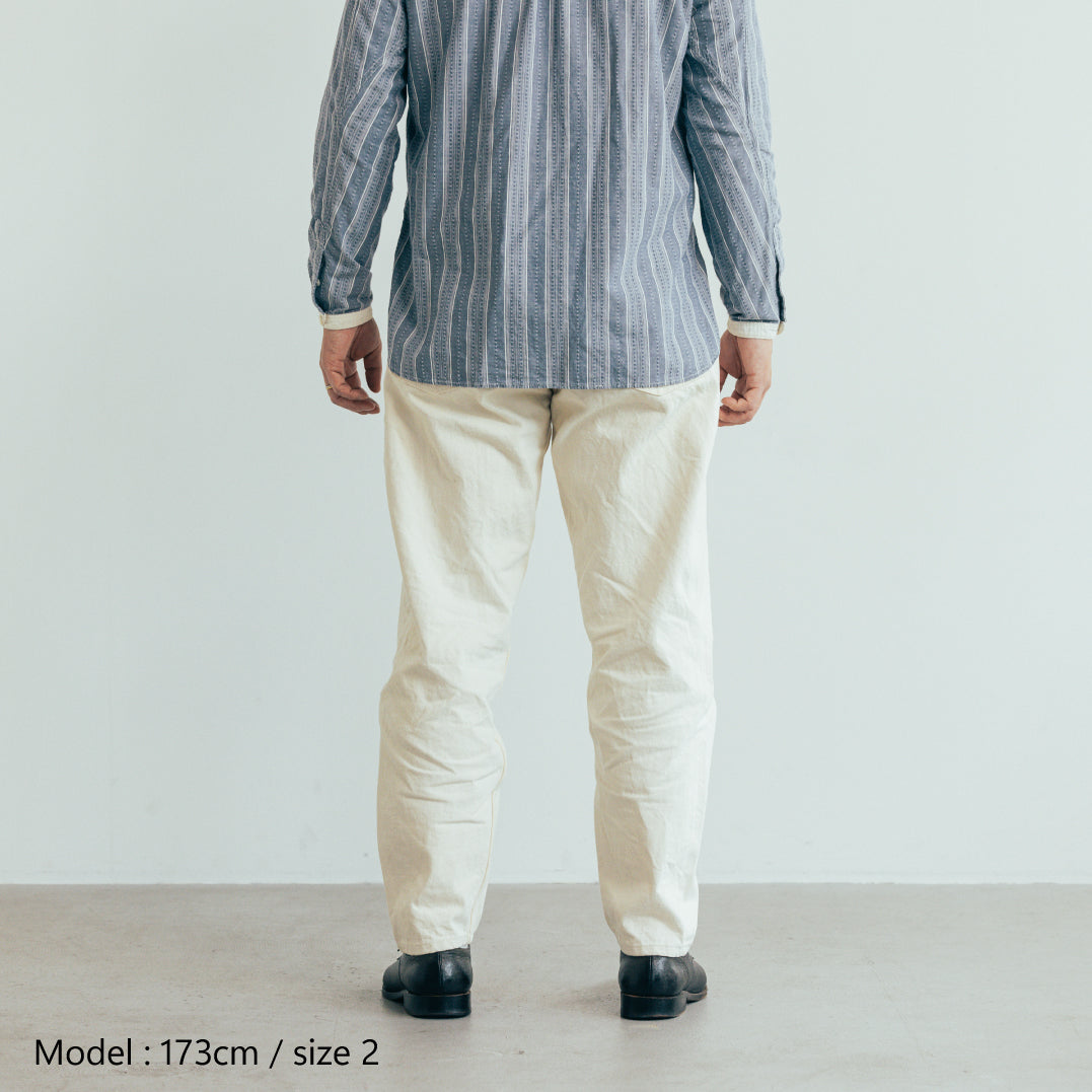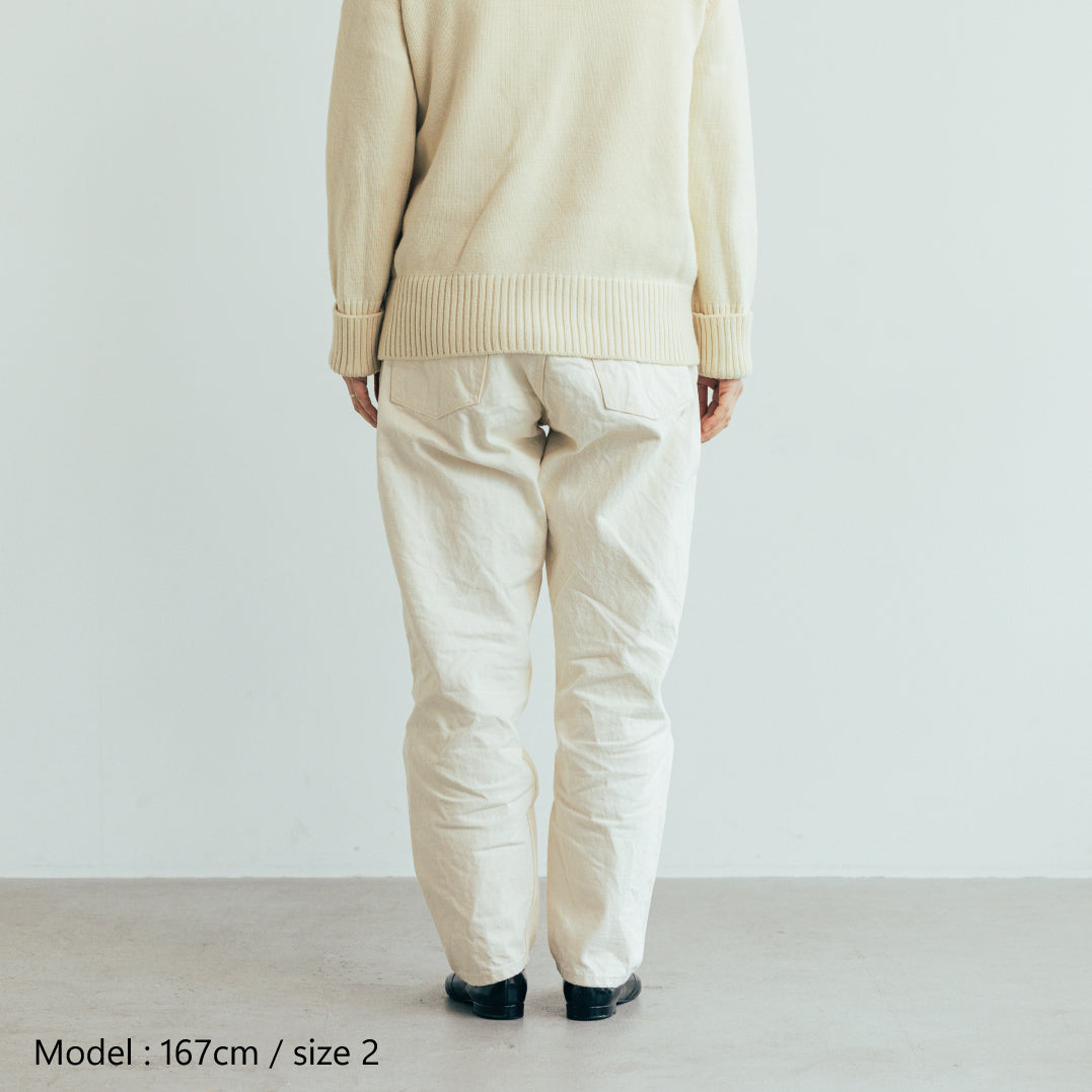 These bottoms are made from natural undyed selvedge denim fabric produced in Okayama, woven with raw yarns for both the warp and weft, leaving in natural cotton flecks.