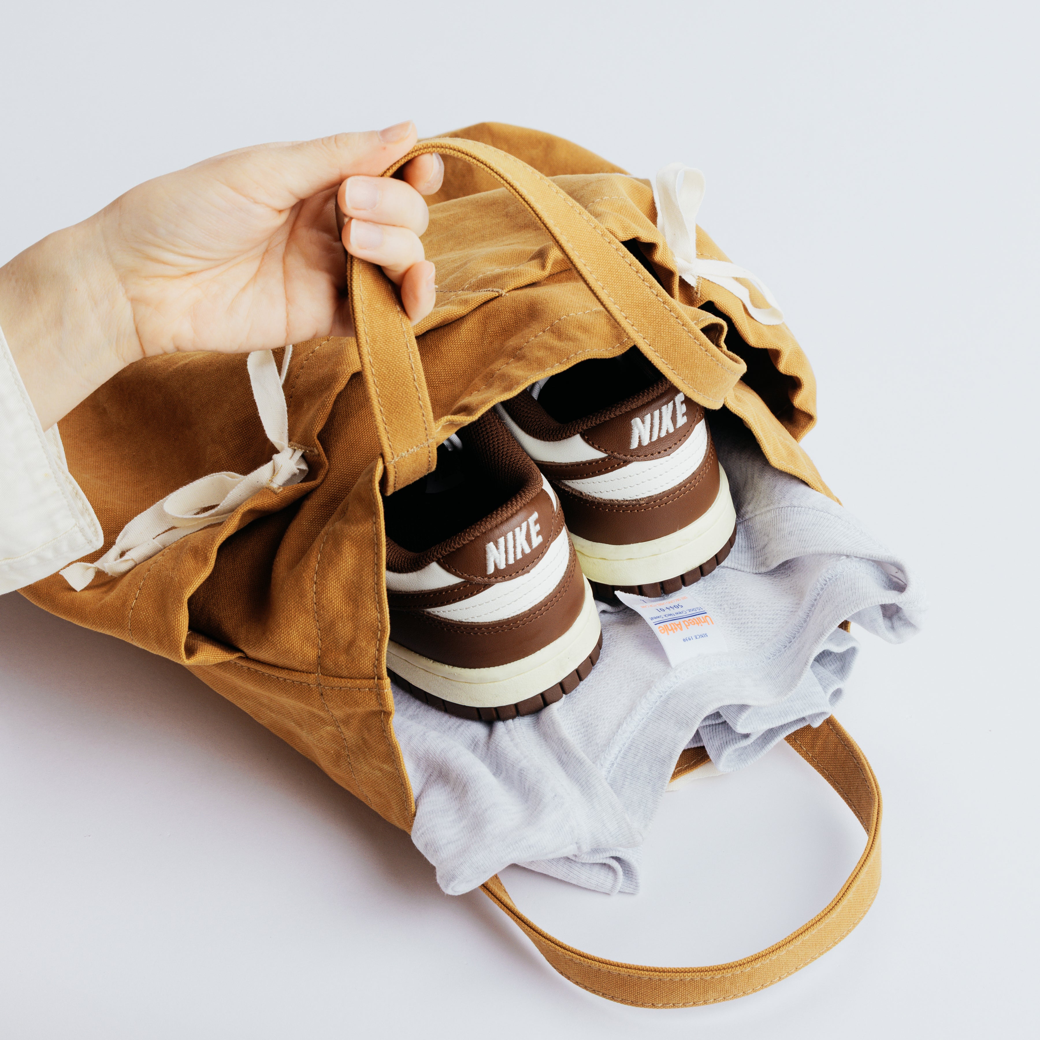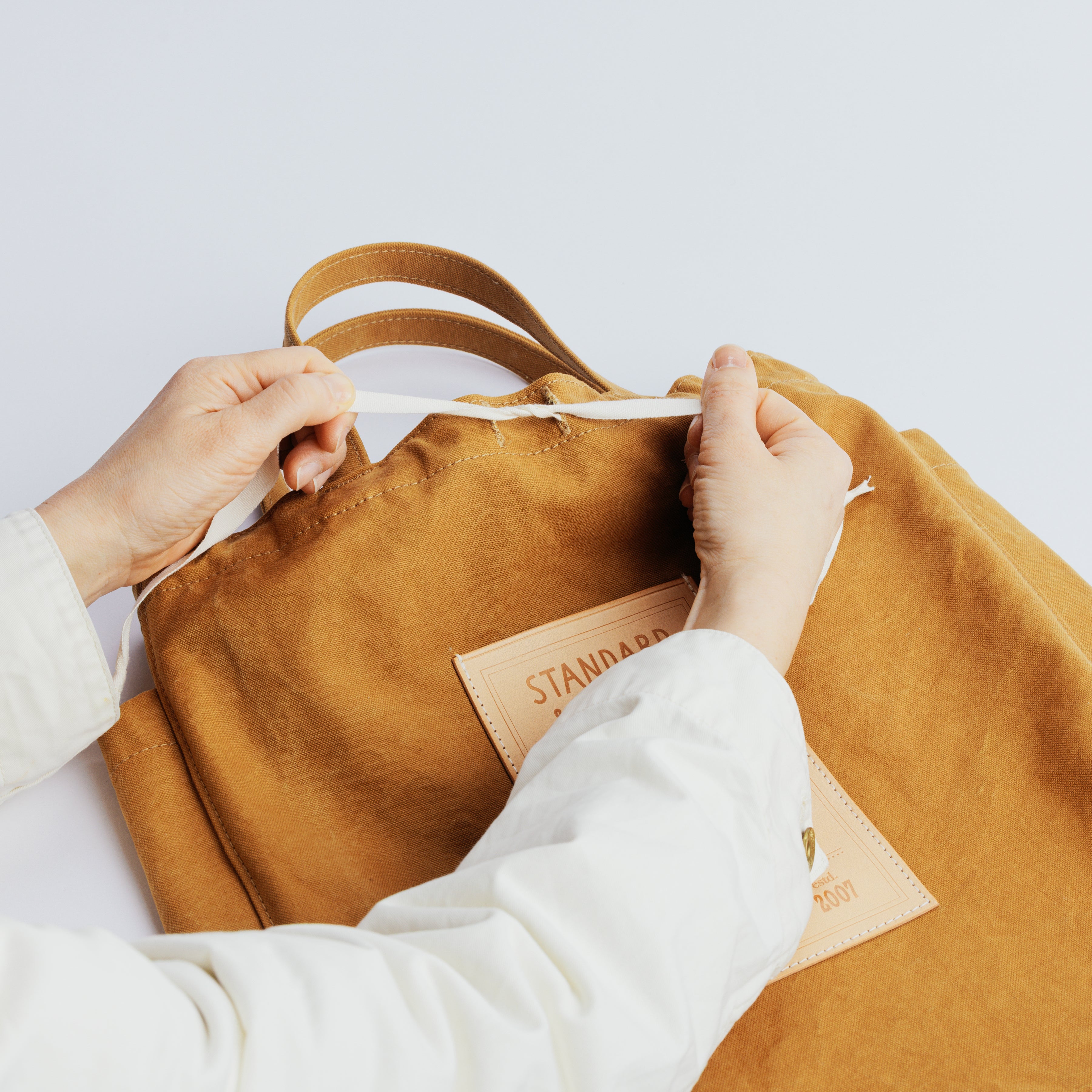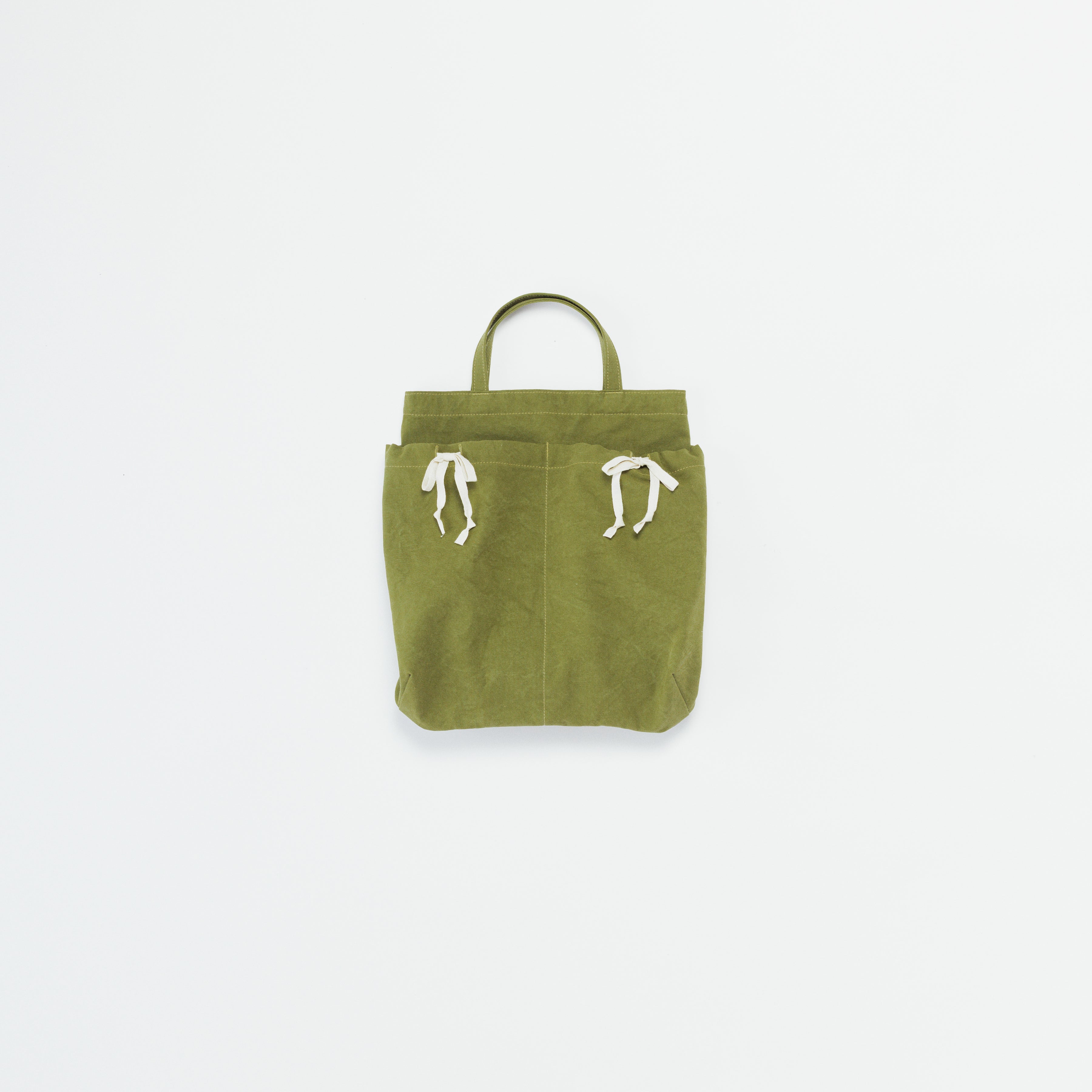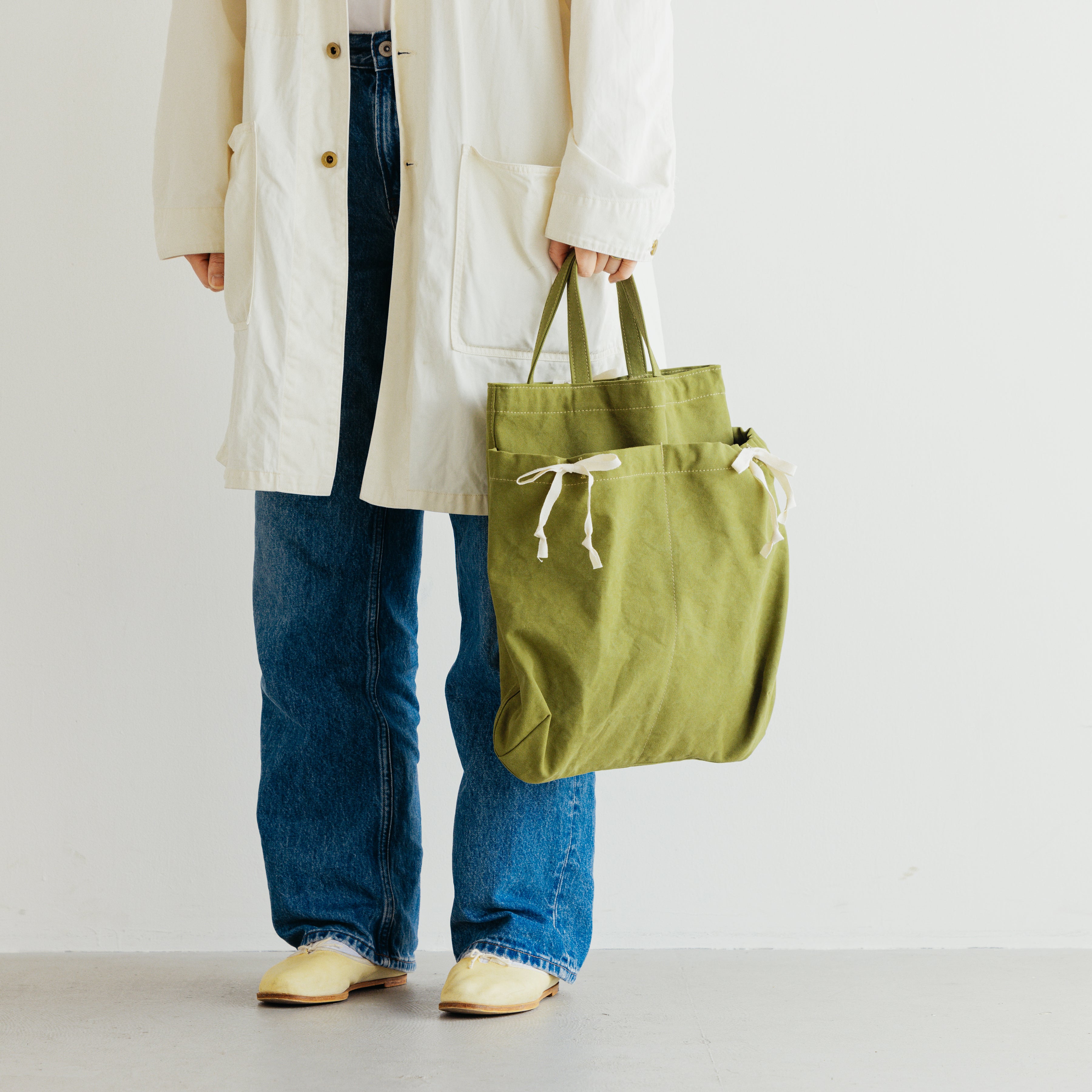 Its flat, gusset-free shape keeps things simple, while the top can be lightly cinched with a white ribbon for a relaxed, informal closure.