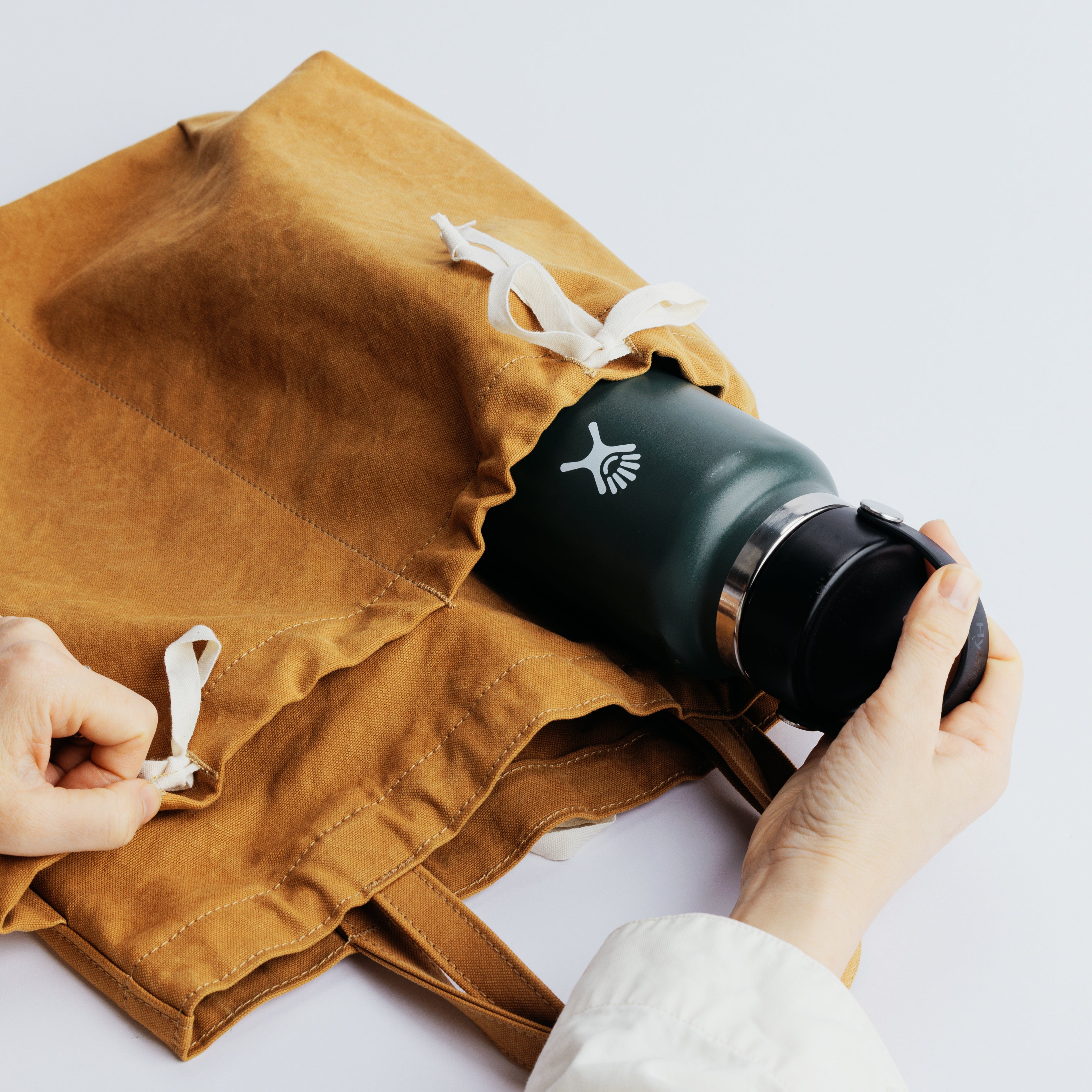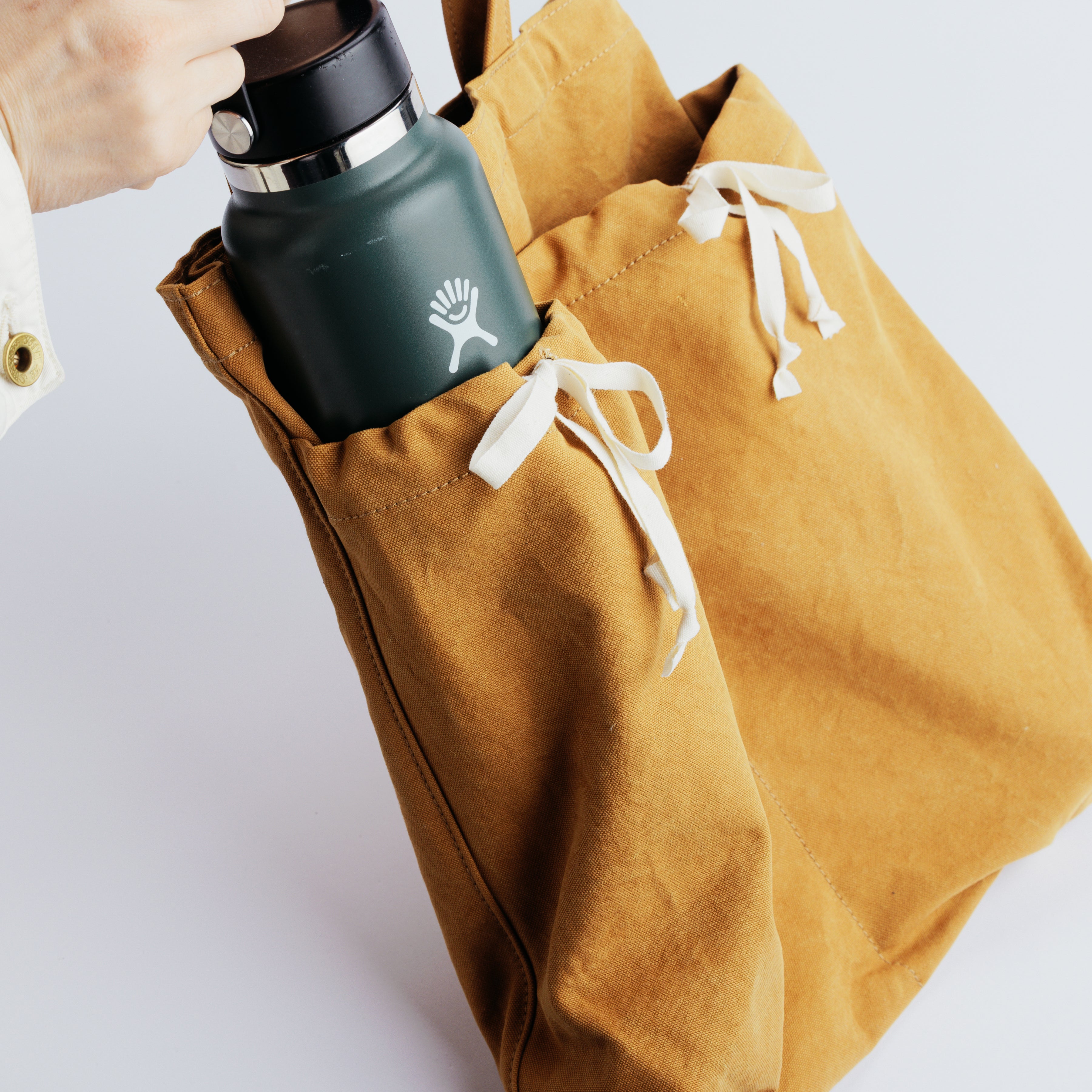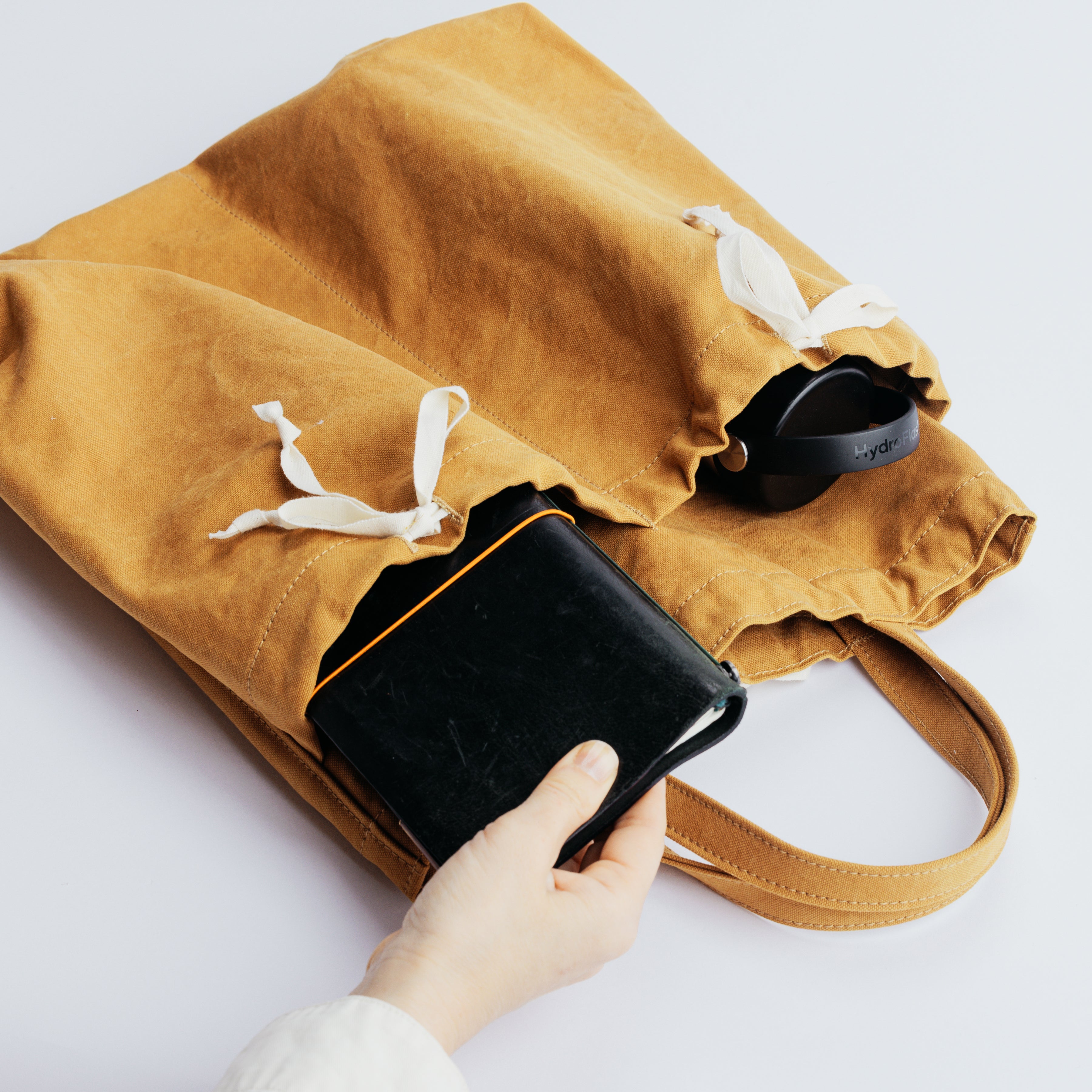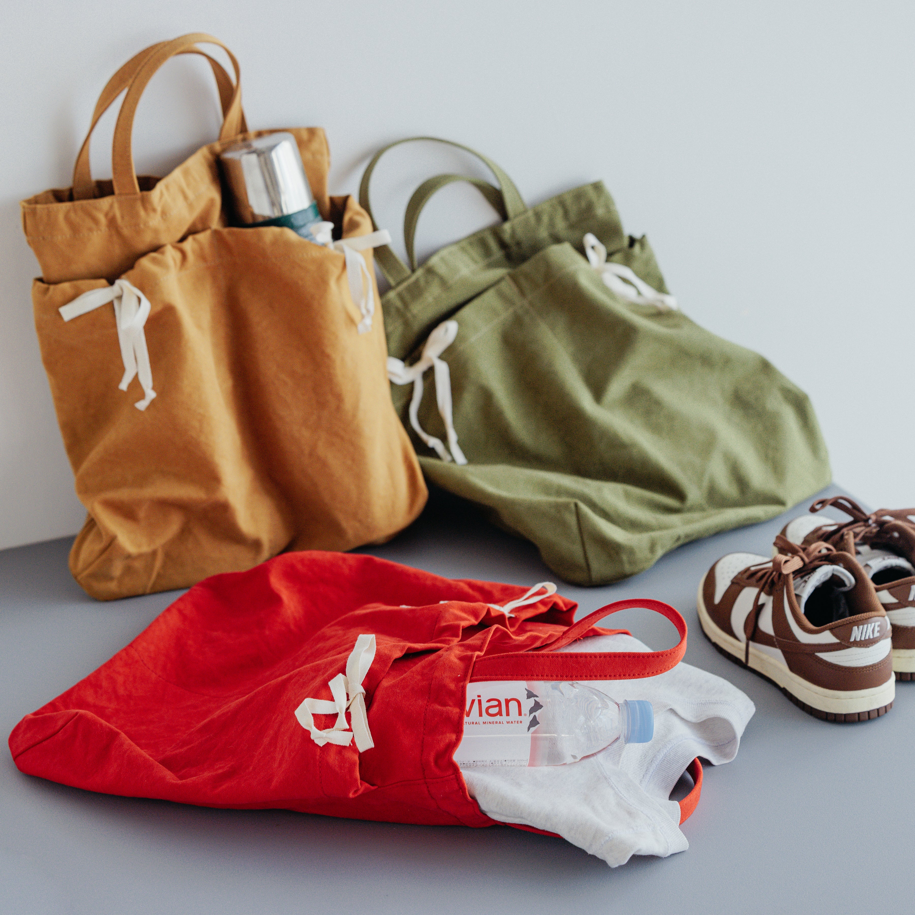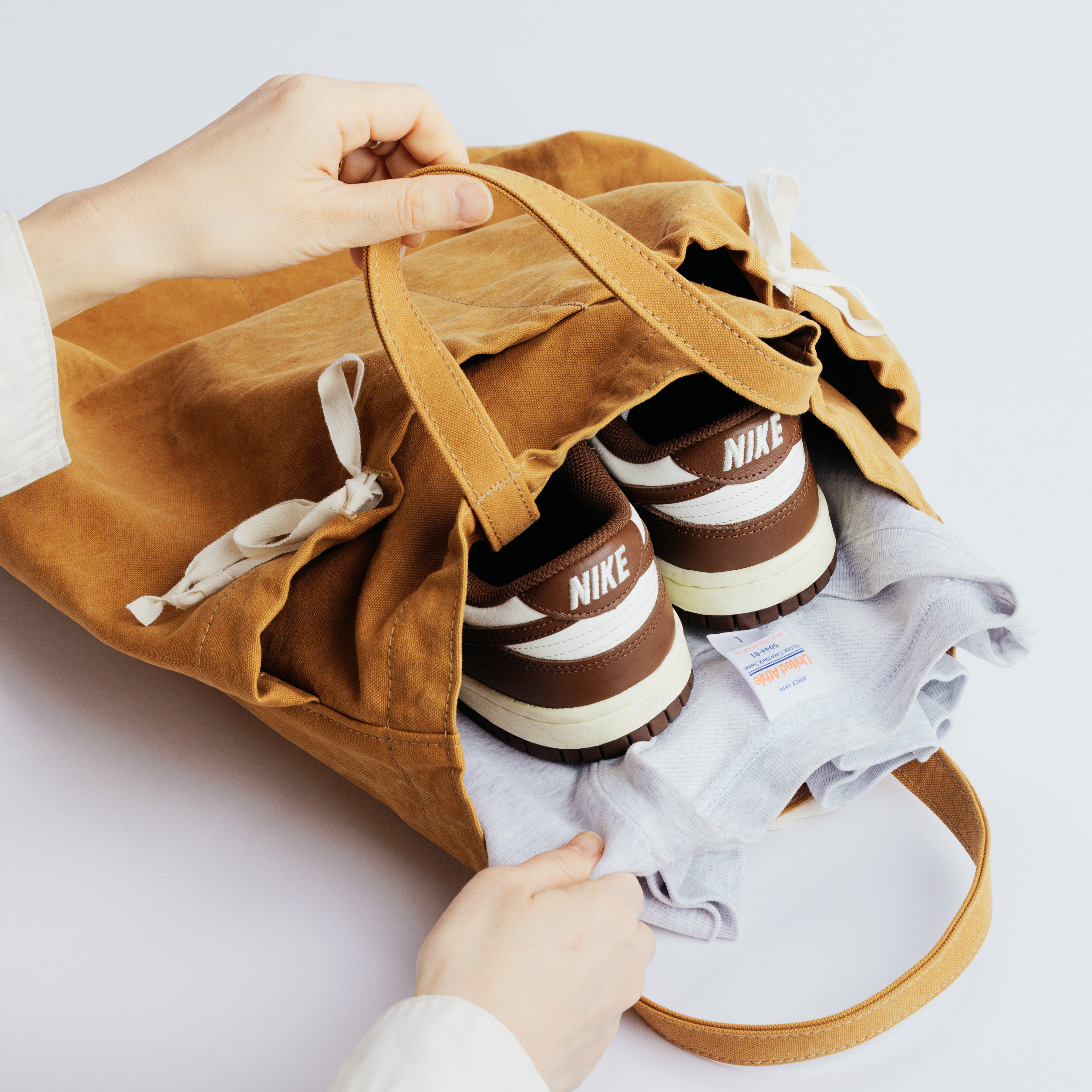 Its flat, gusset-free shape keeps things simple, while the top can be lightly cinched with a white ribbon for a relaxed, informal closure.