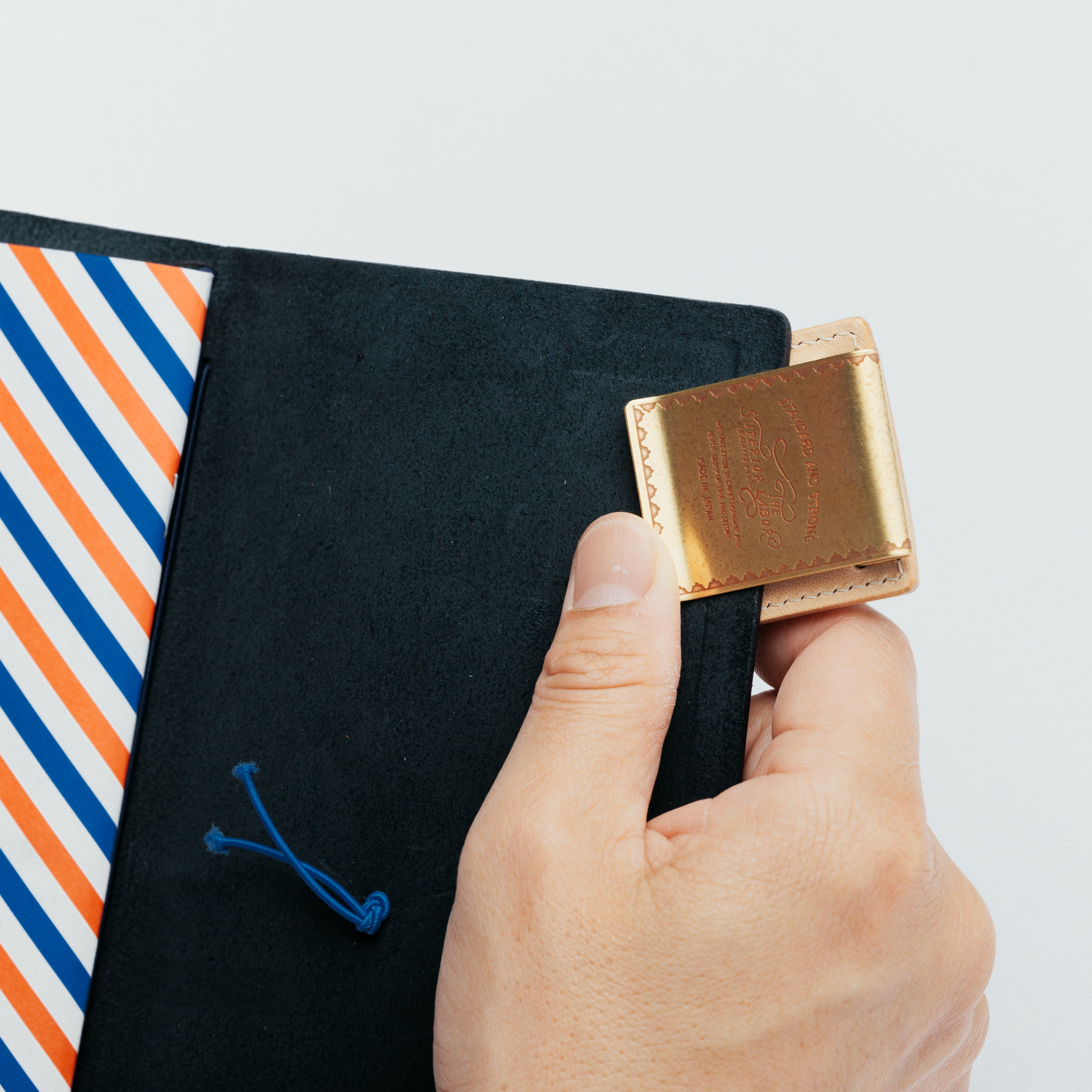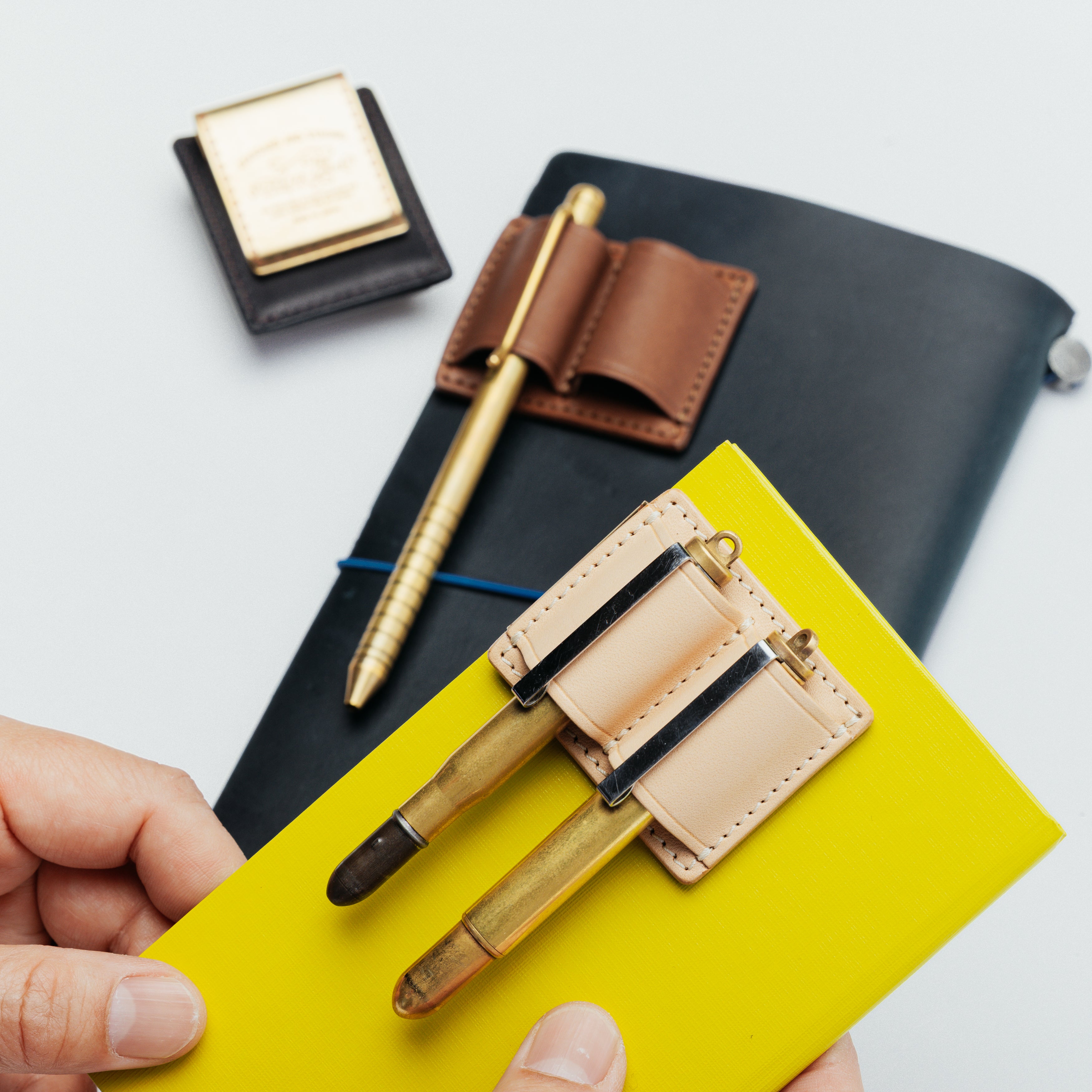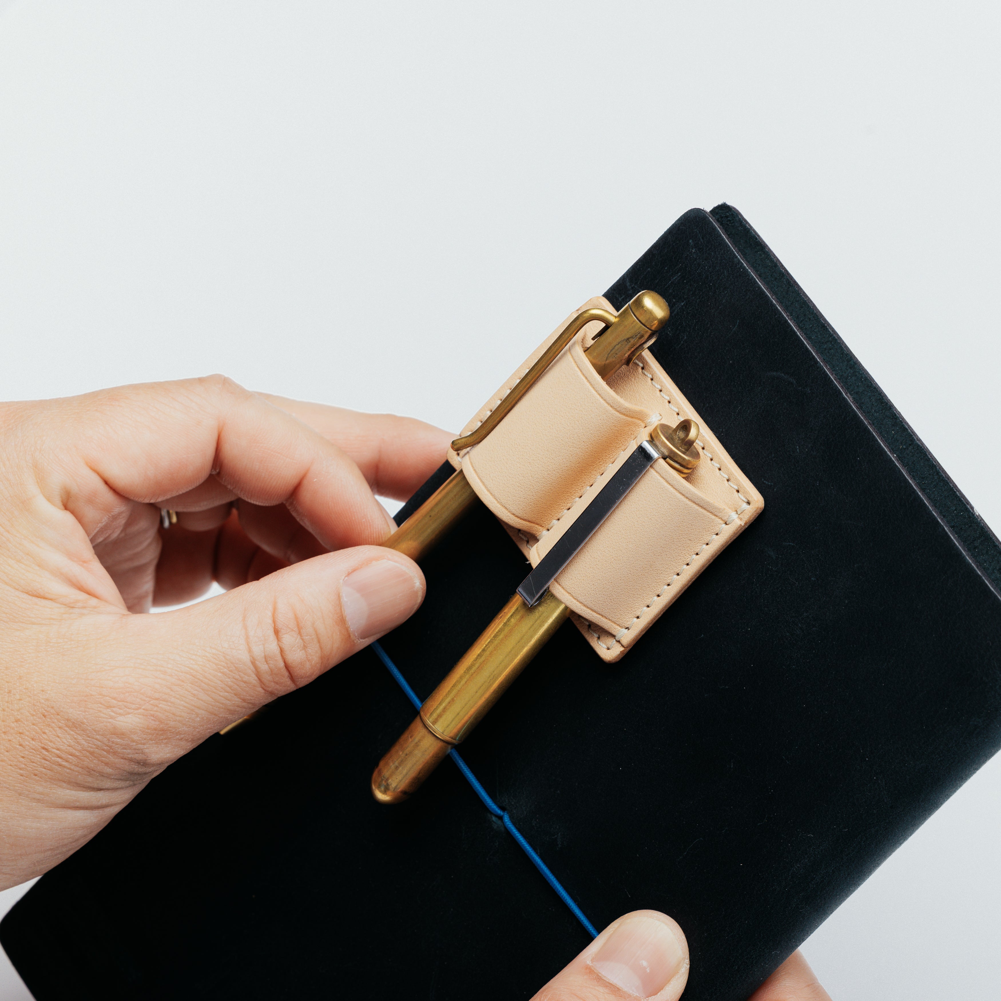 This pen holder clips onto the cover of your notebook or planner using the brass clip on the back.