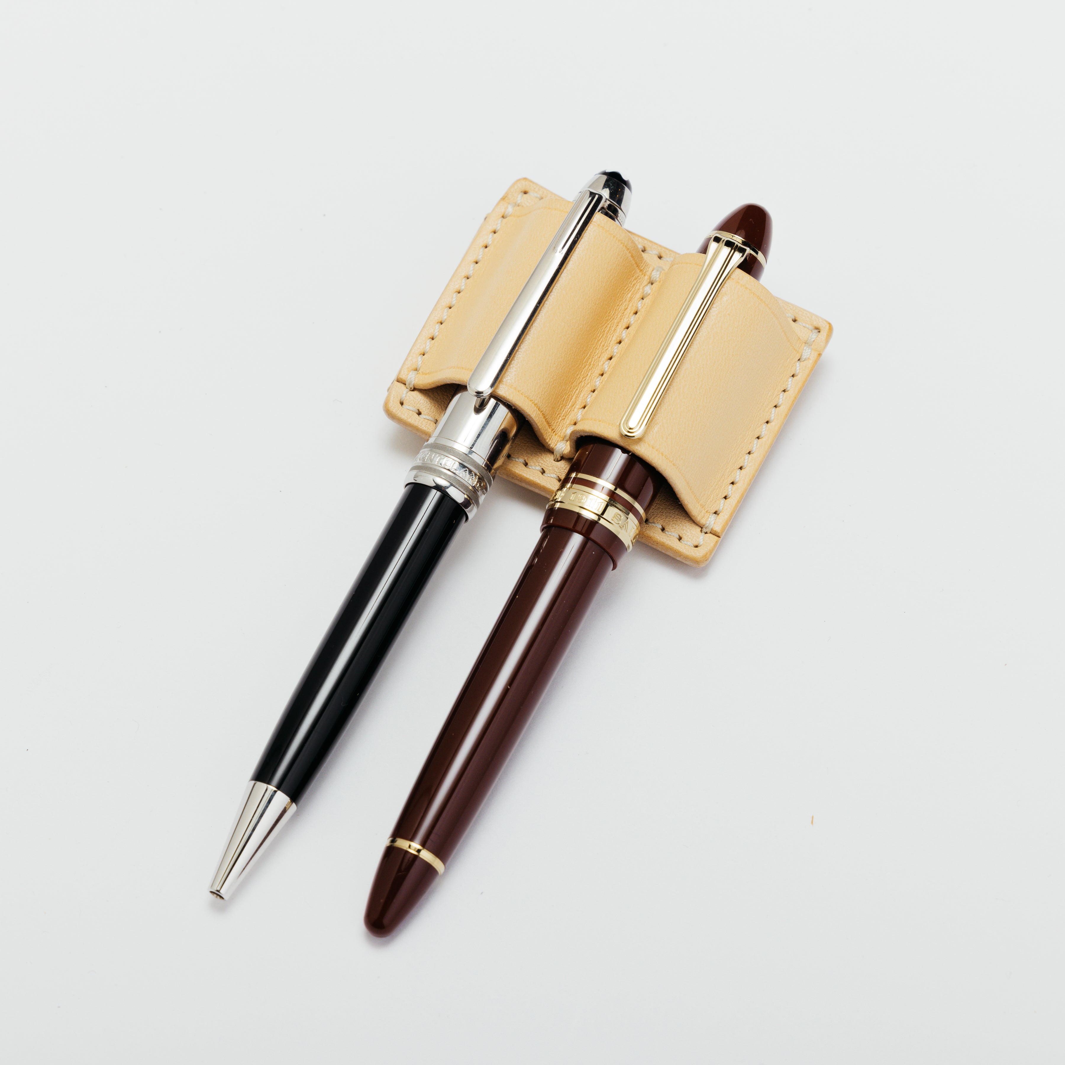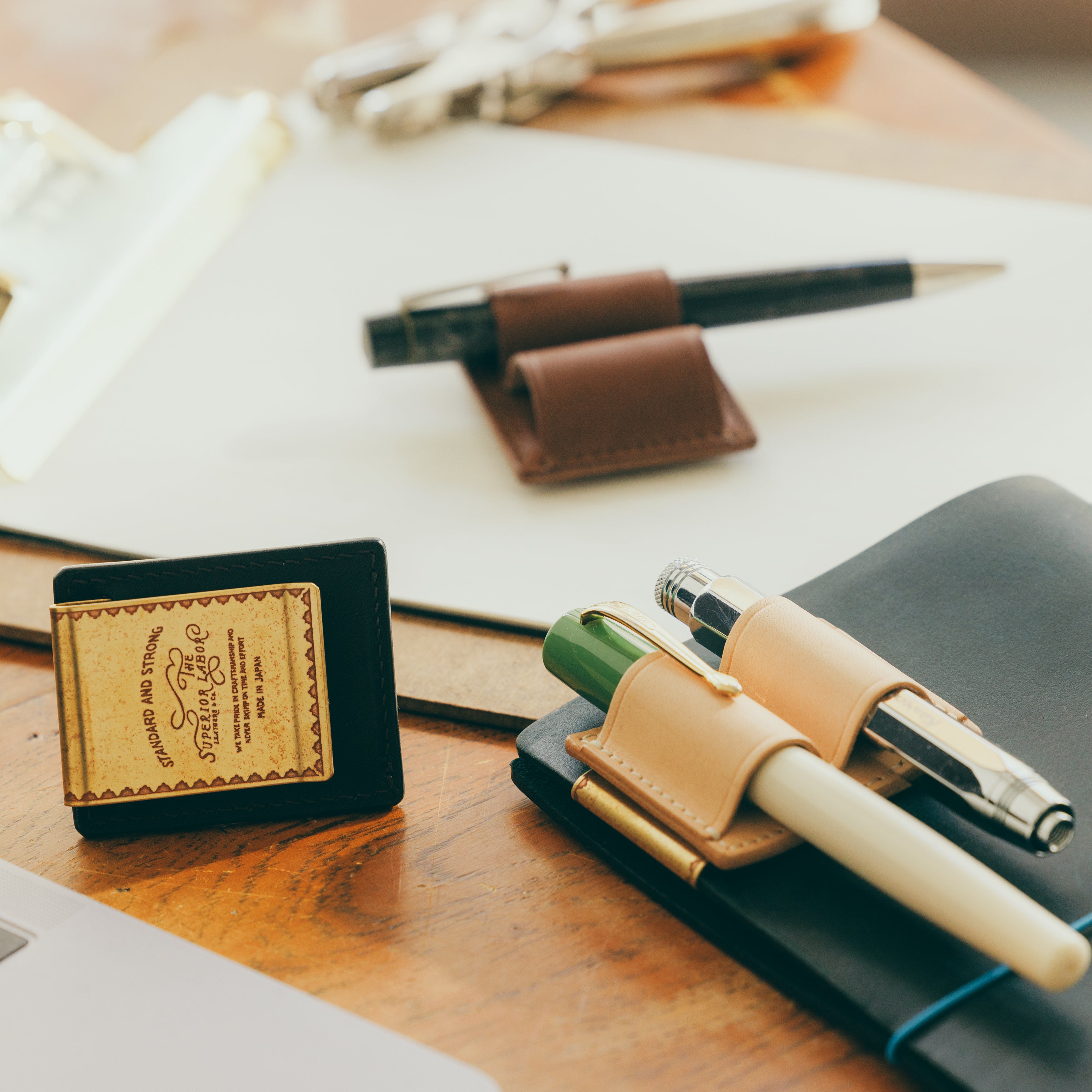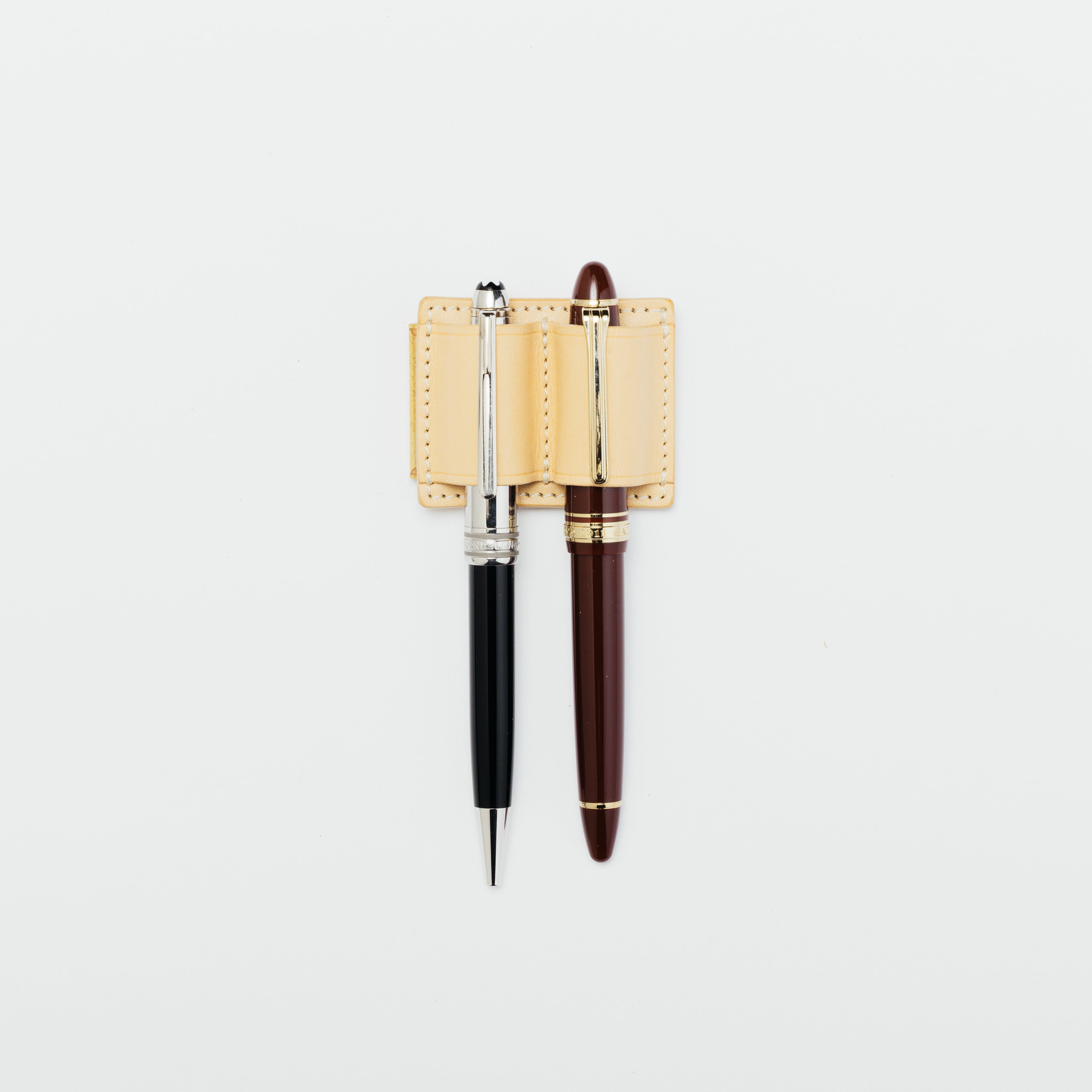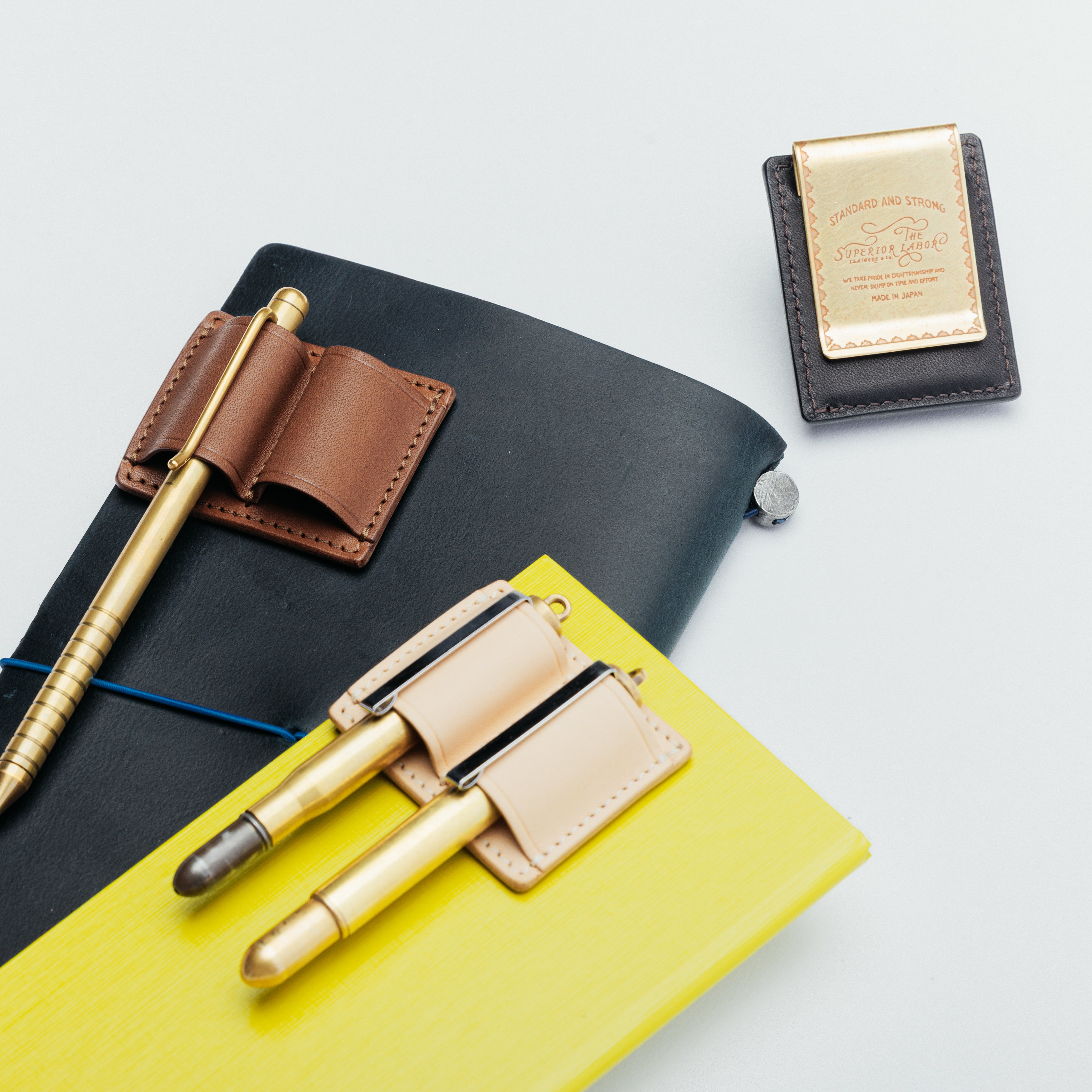 This pen holder clips onto the cover of your notebook or planner using the brass clip on the back.