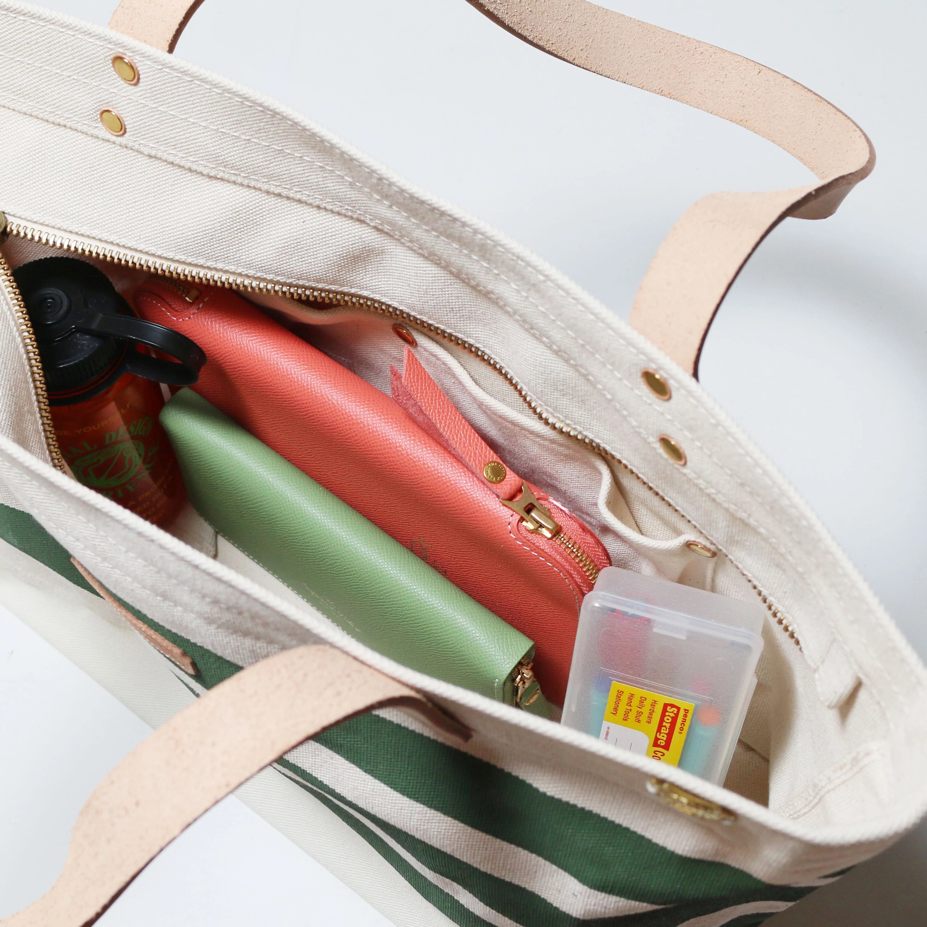 The solid leather handle and zippered opening make it easy to use and durable.