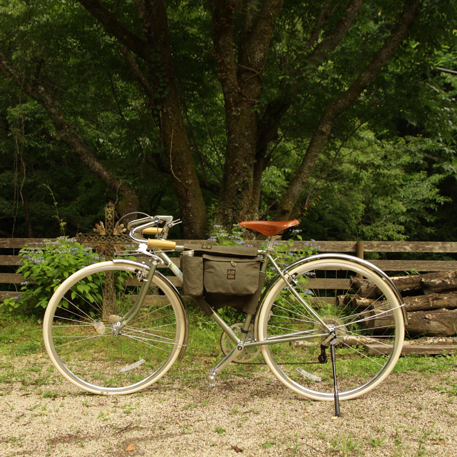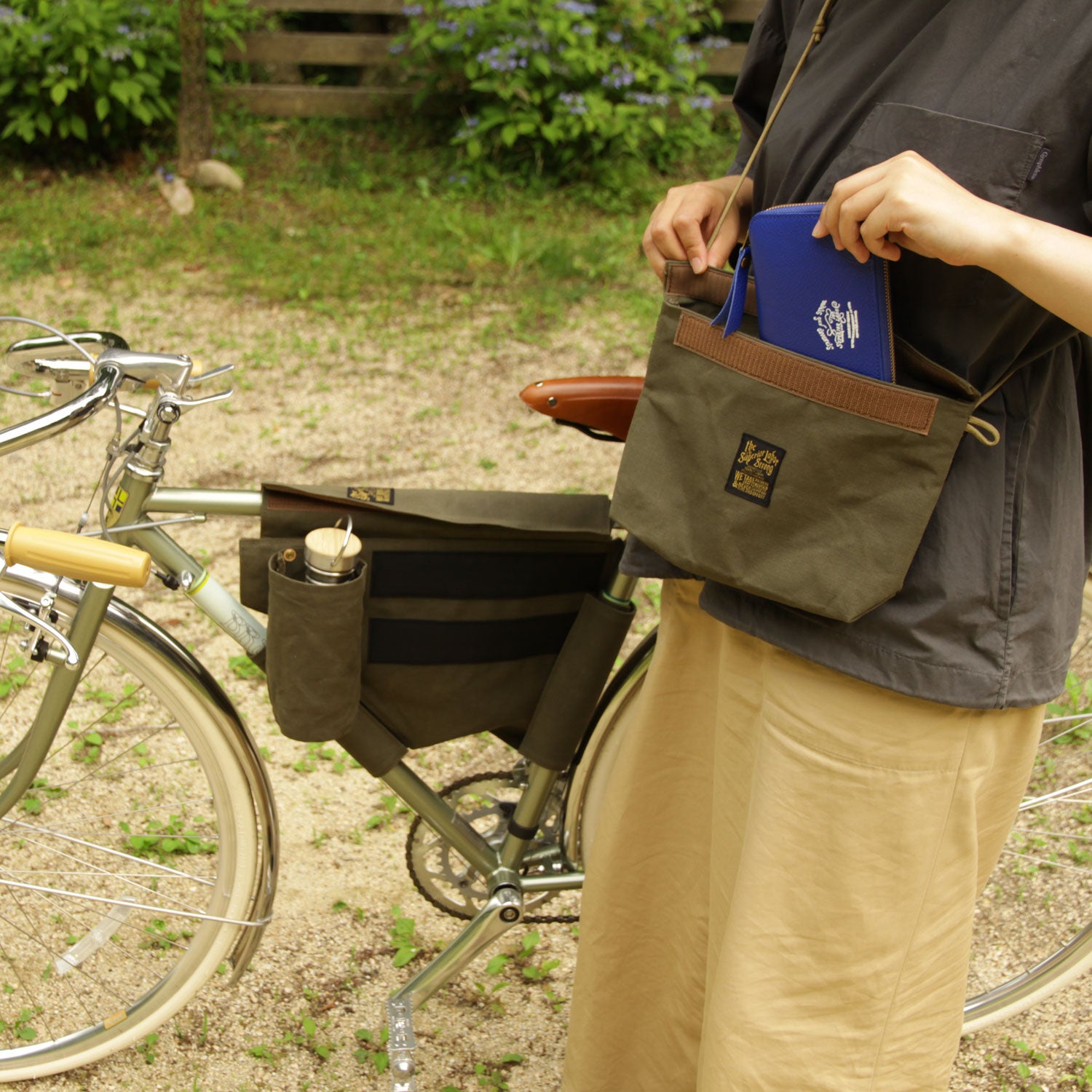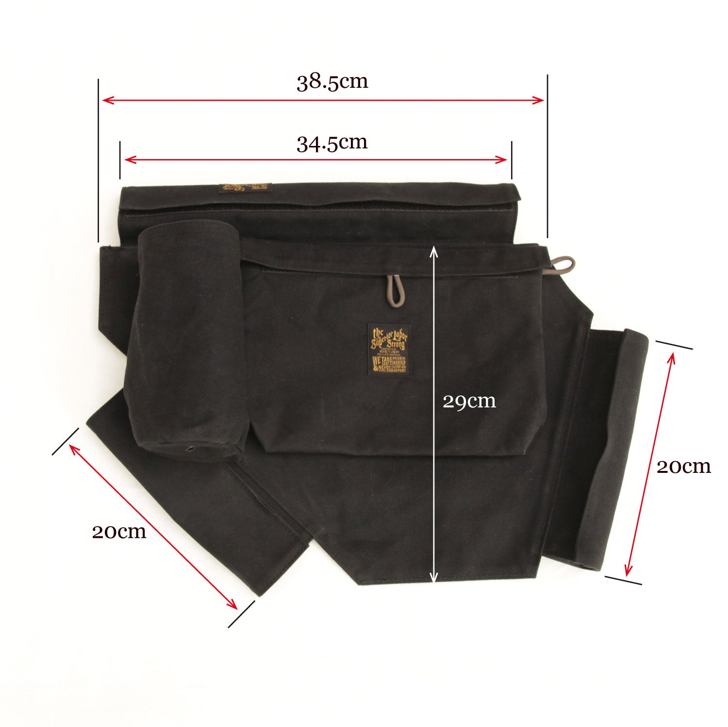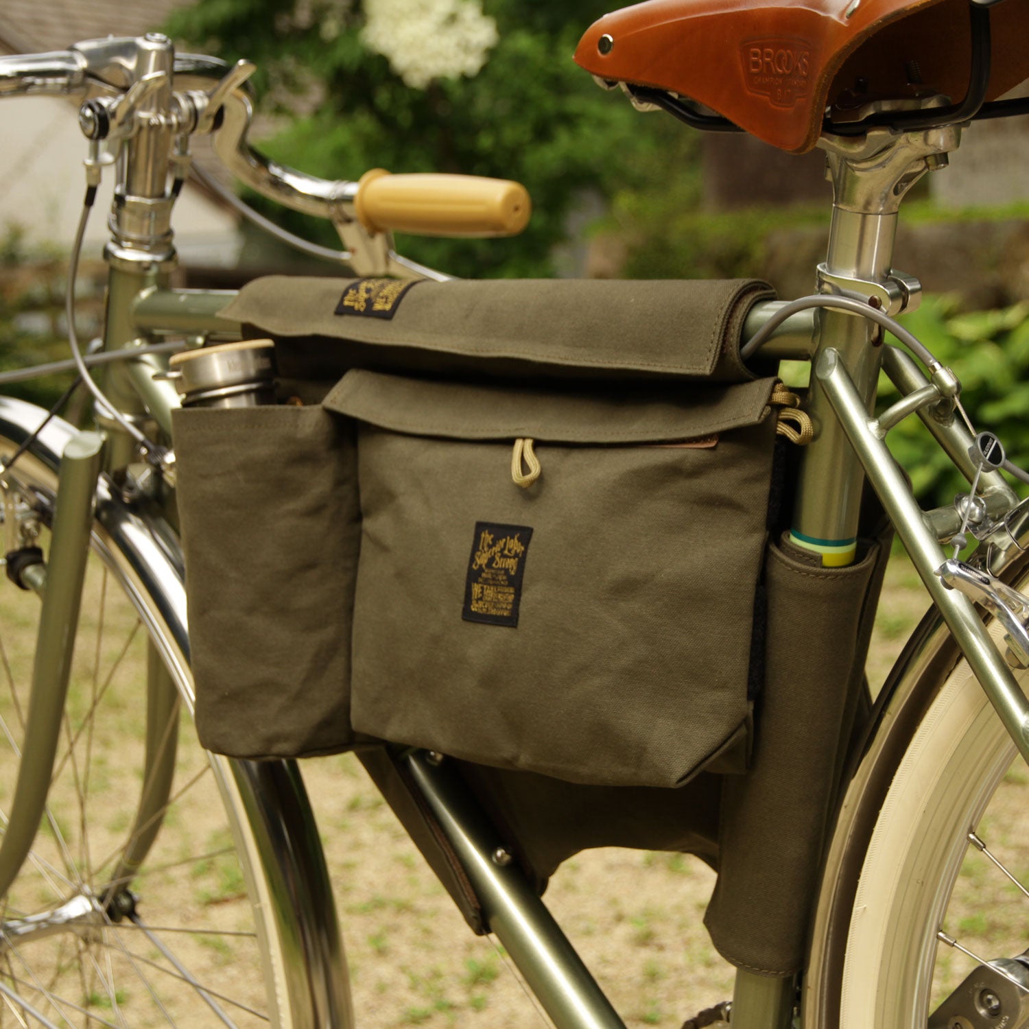 Made of paraffin canvas, it comes with a sakosh-type bag on the left and right sides and a bottle holder on the left side. The left side bag can be detached for carrying.