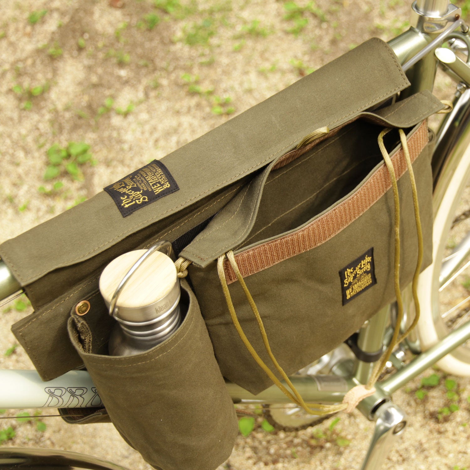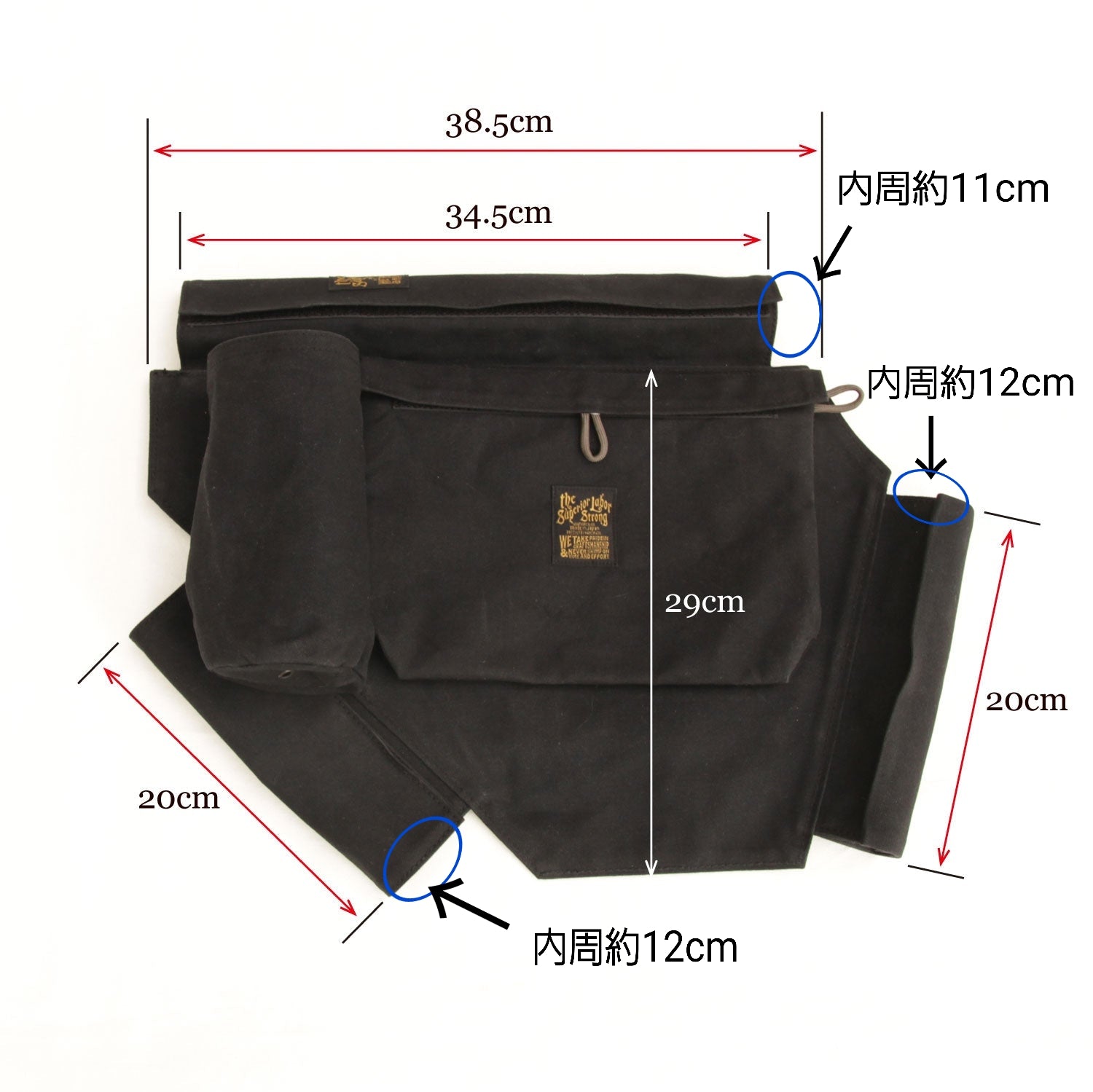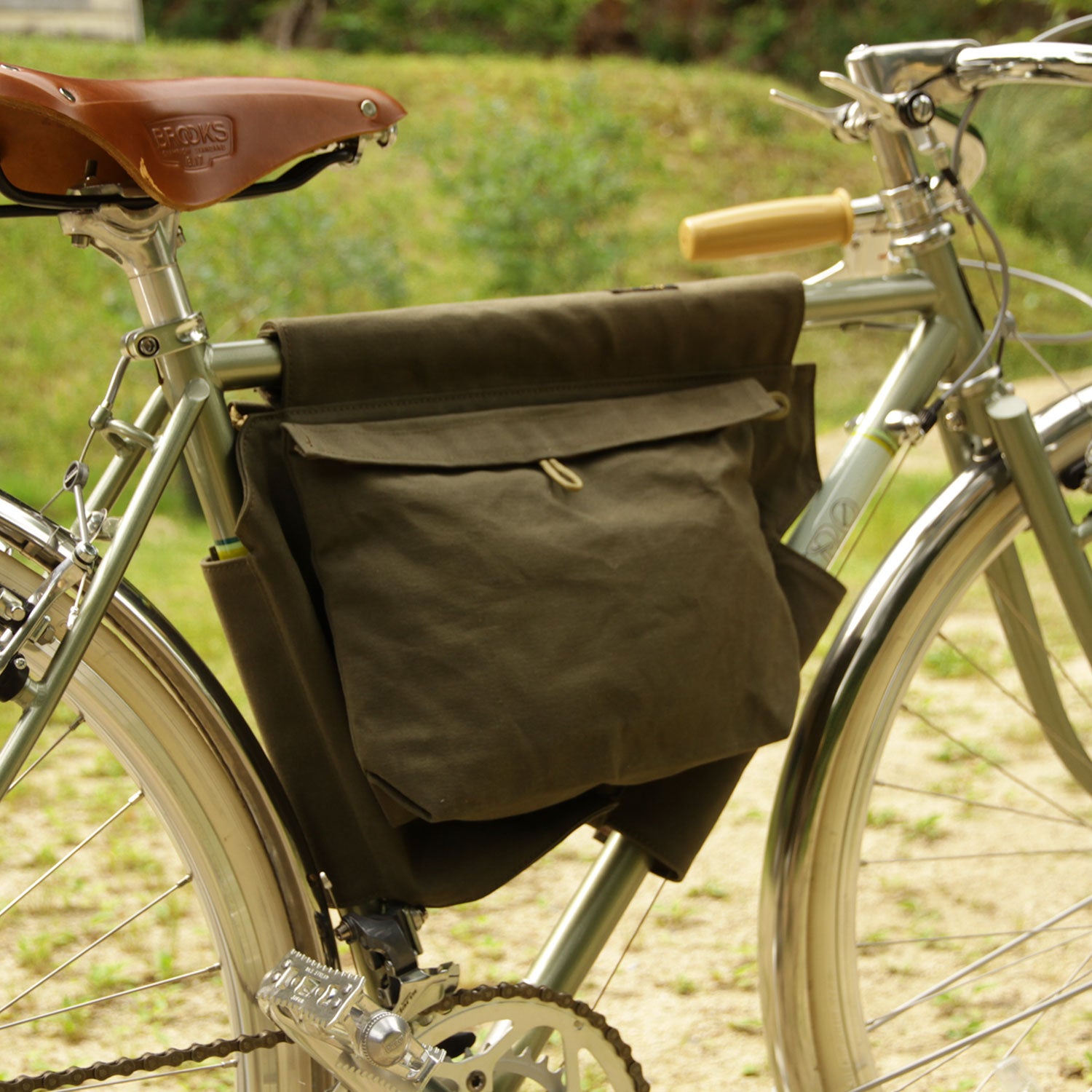 Made of paraffin canvas, it comes with a sakosh-type bag on the left and right sides and a bottle holder on the left side. The left side bag can be detached for carrying.