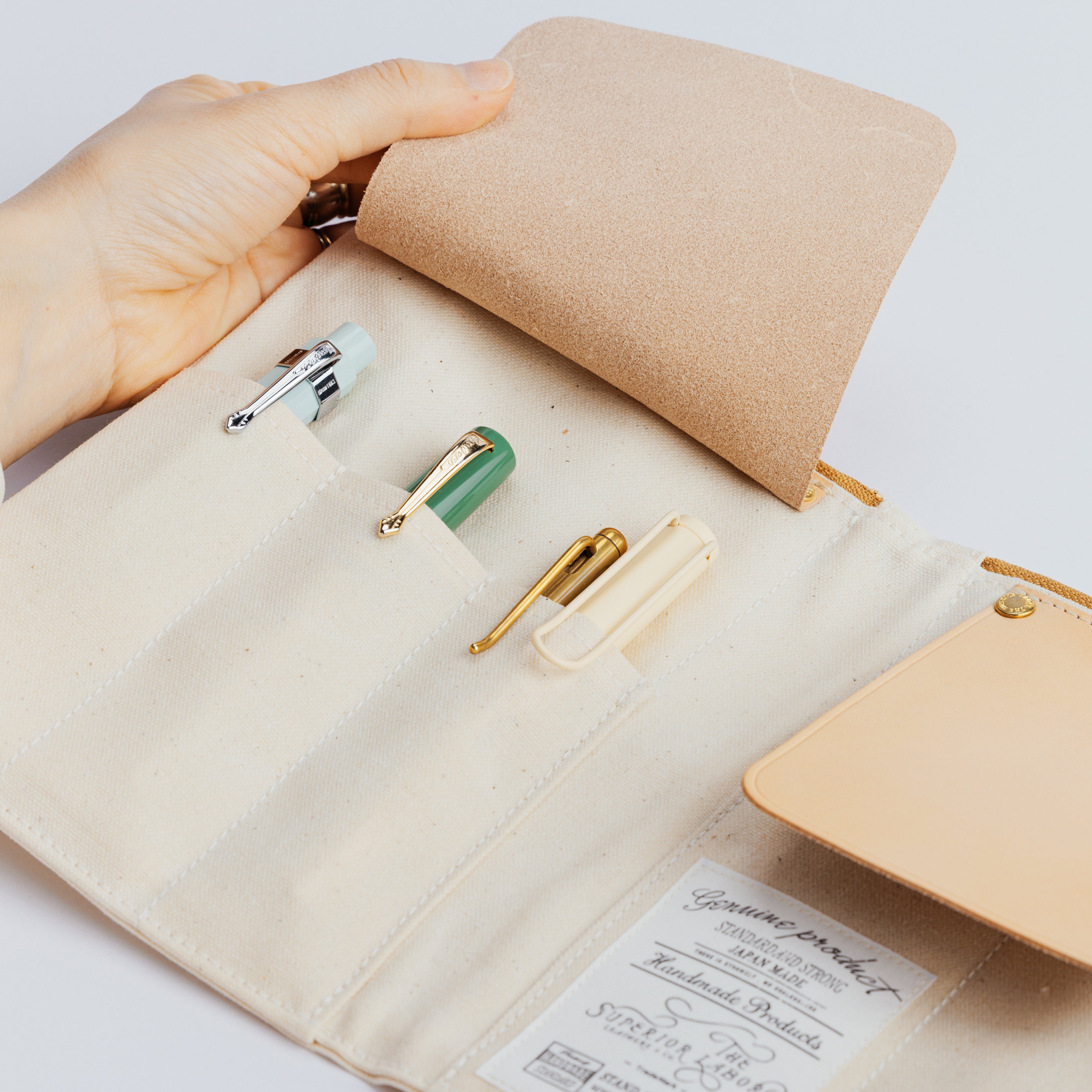 Crafted from lightweight yet durable paraffin canvas, the case includes an interior pocket with a leather flap—perfect for safely storing fountain pens and other delicate tools.