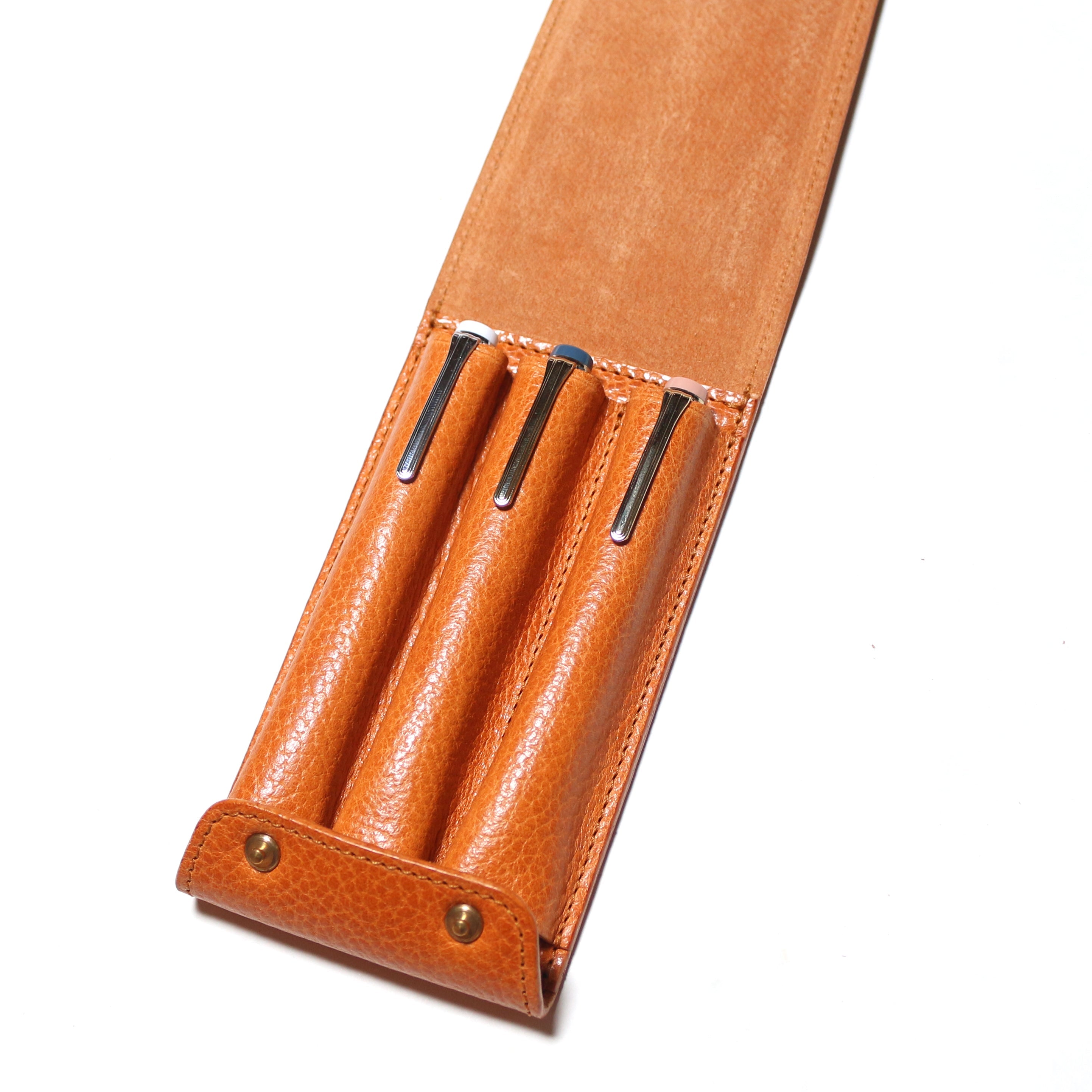 フラップ部分にあたる本体はピッグスエードを裏張りした高級感のある作りで、大切なペンをしっかりと保護して持ち運ぶことができます。