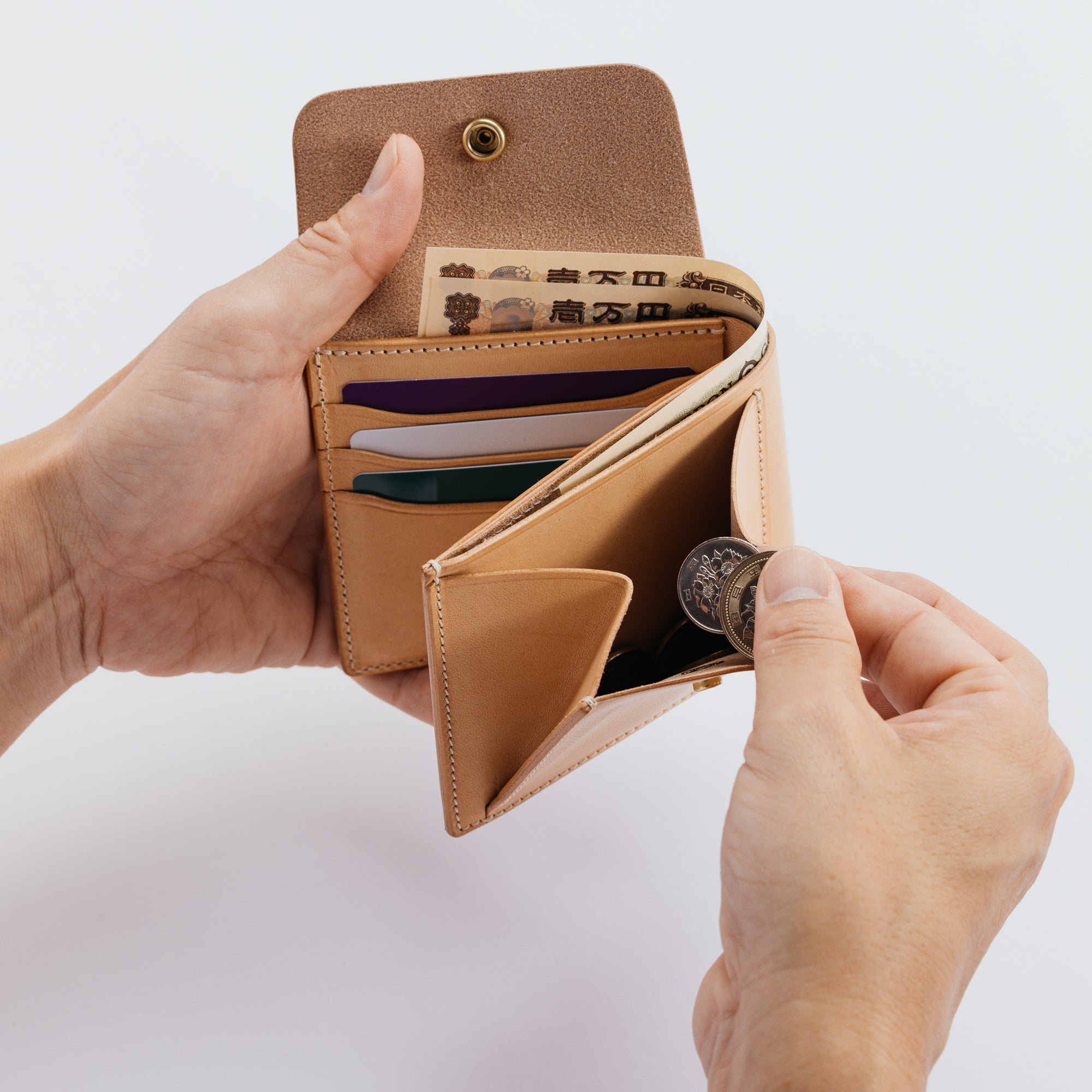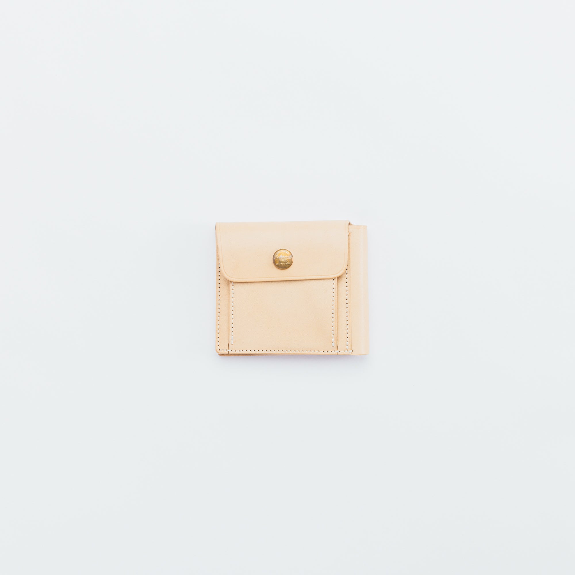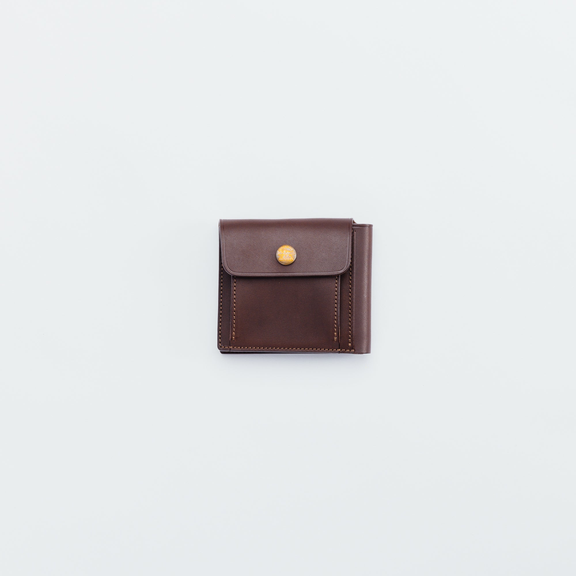 外側にコインポケットを付けた2つ折りの仕様になっています。本体とコインポケットをフラップでまとめて留める仕様なので、二つ折りならではの手間が省略された機能的なウォレットです。