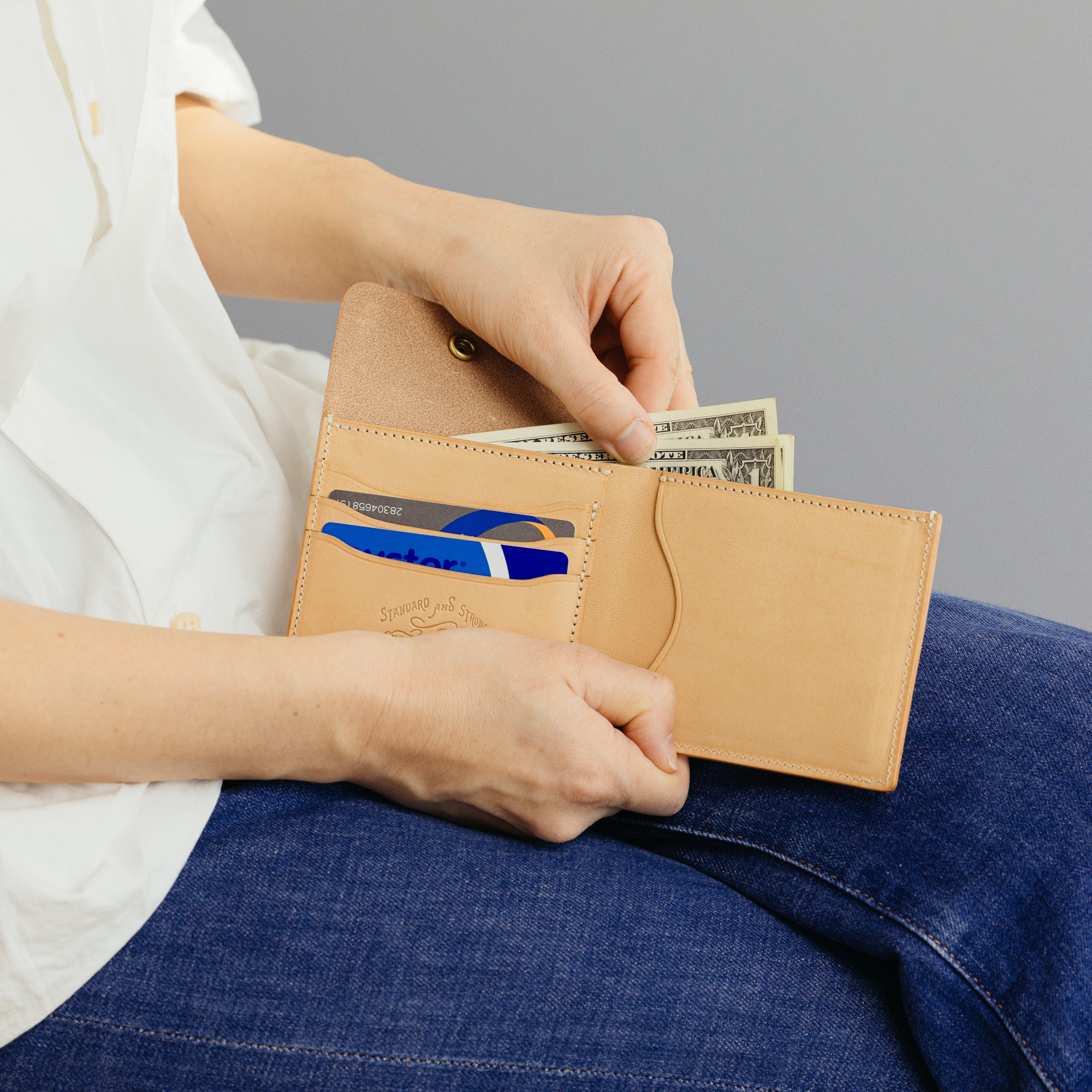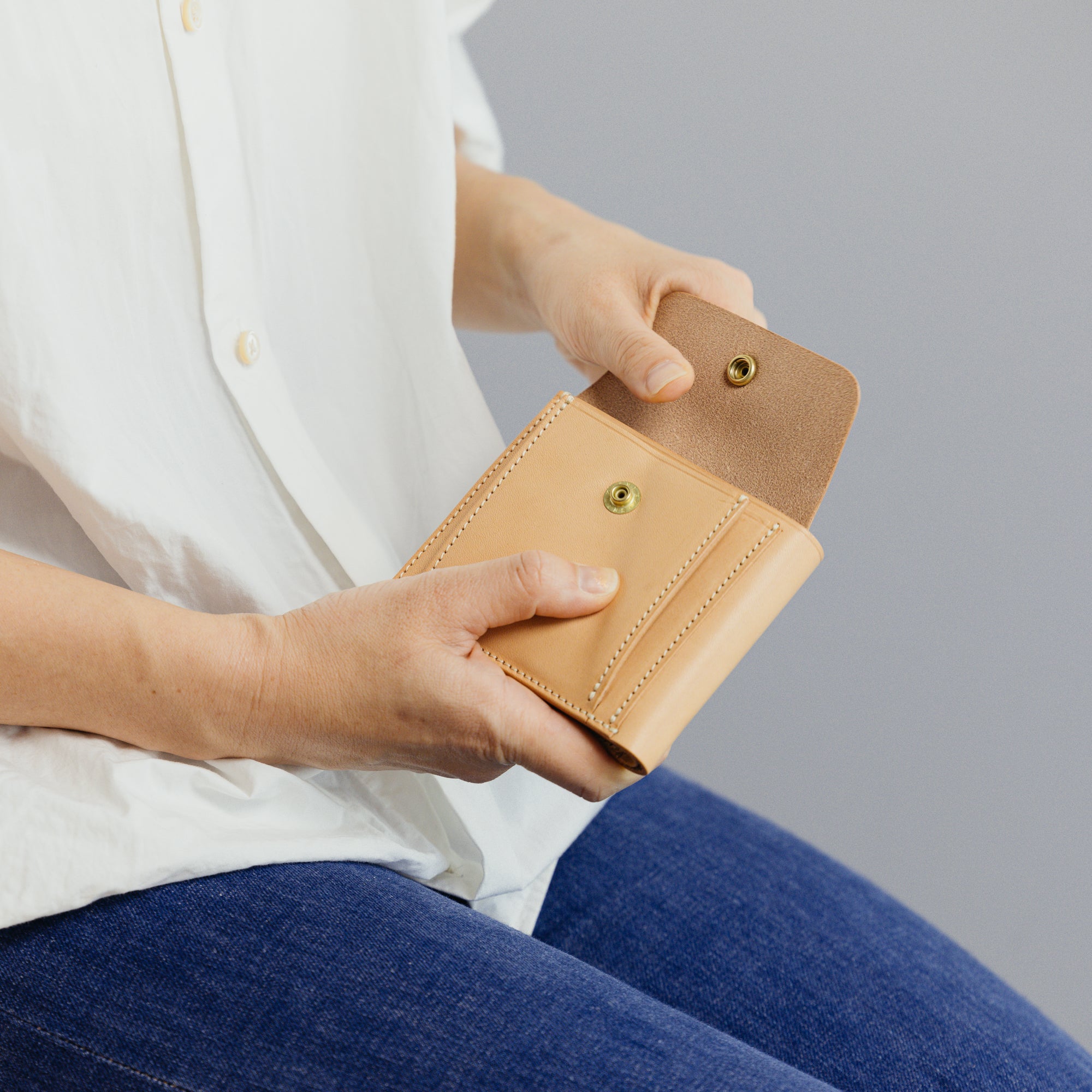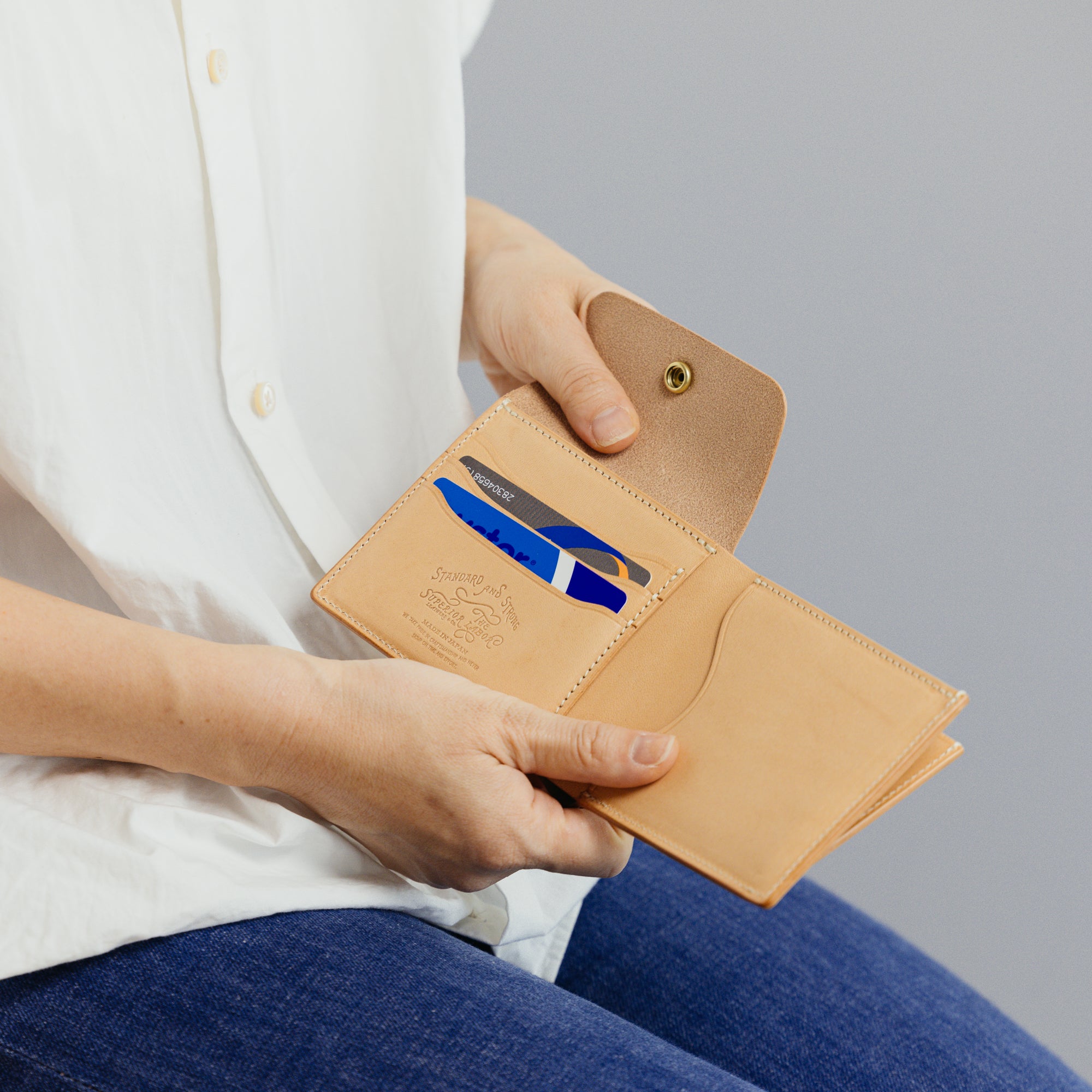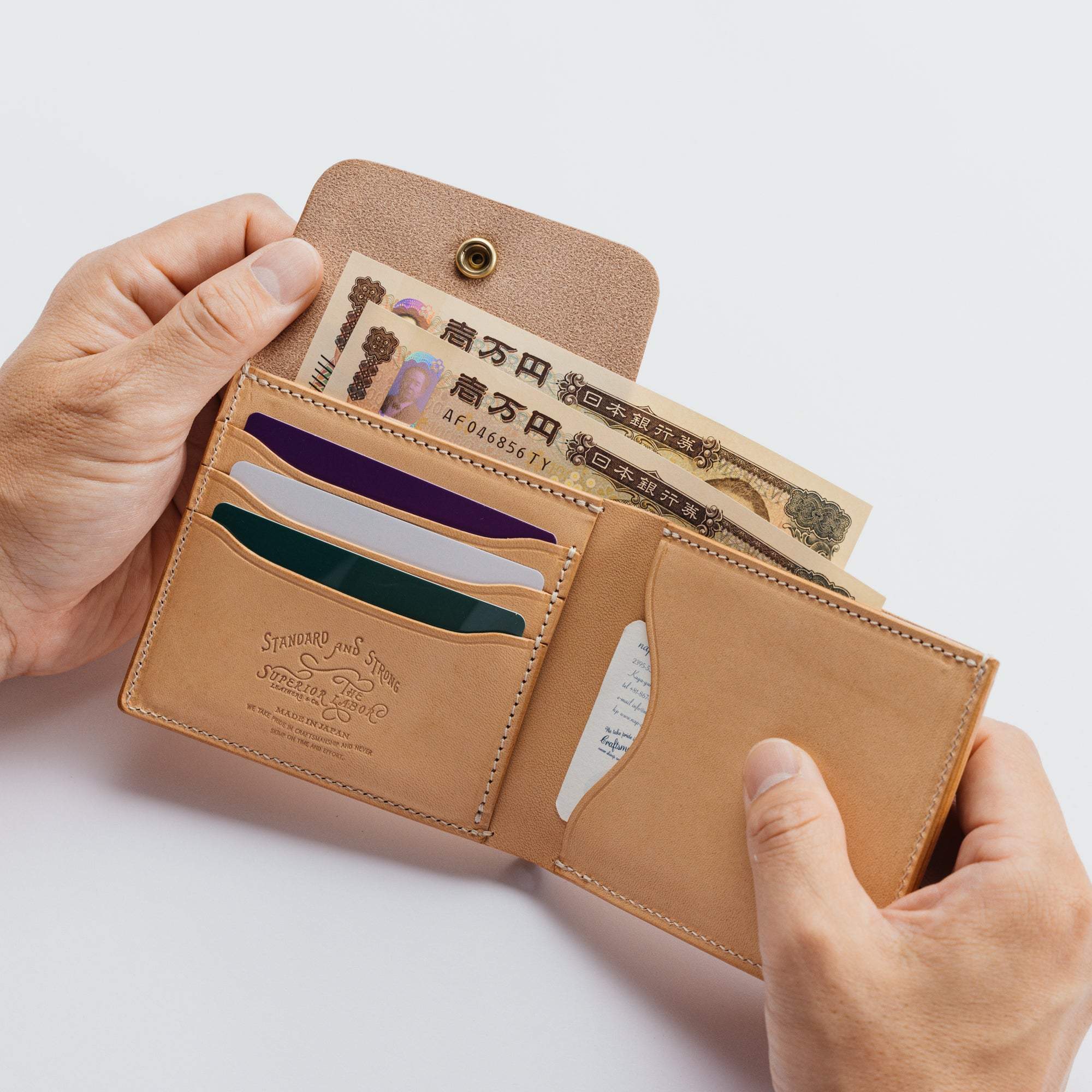 外側にコインポケットを付けた2つ折りの仕様になっています。本体とコインポケットをフラップでまとめて留める仕様なので、二つ折りならではの手間が省略された機能的なウォレットです。