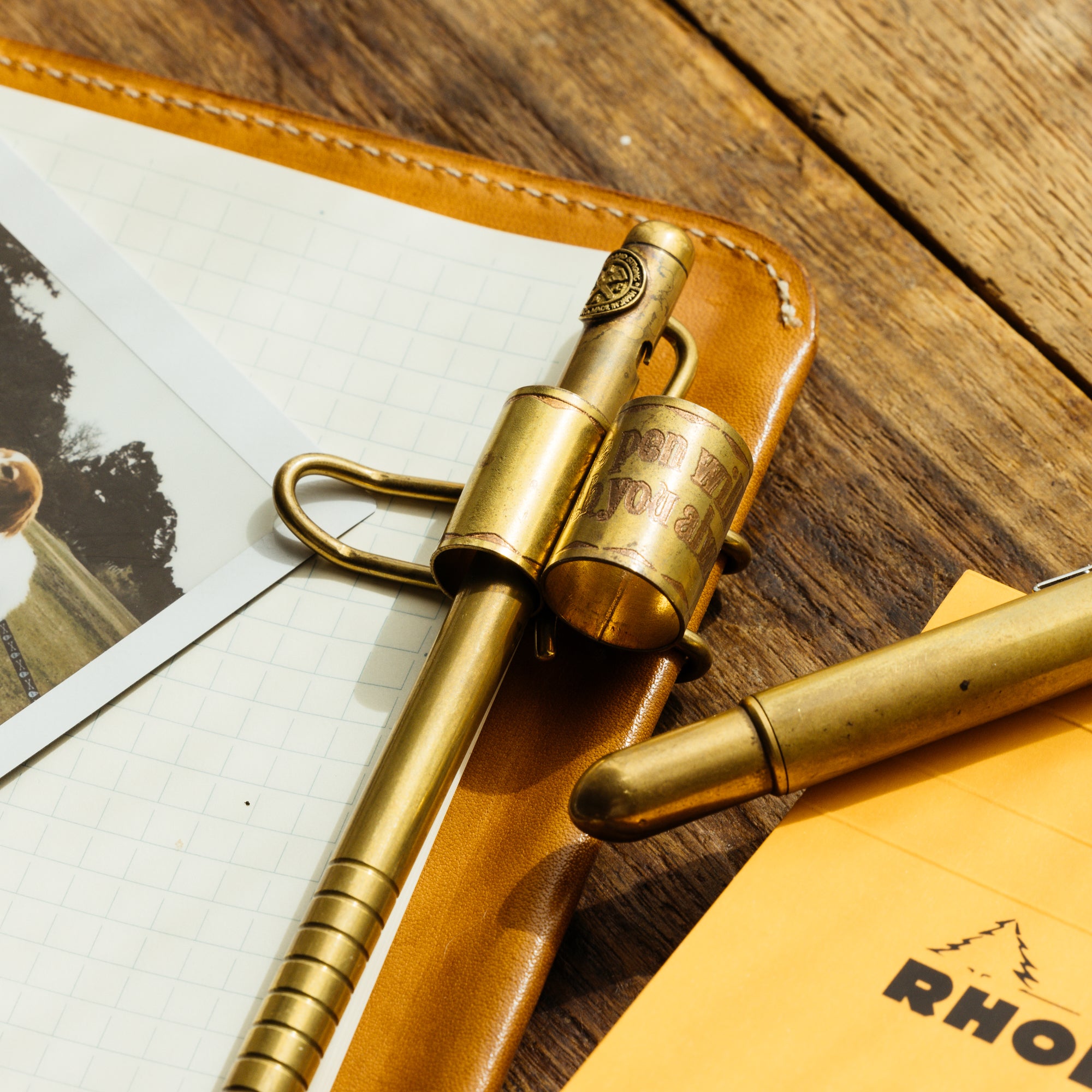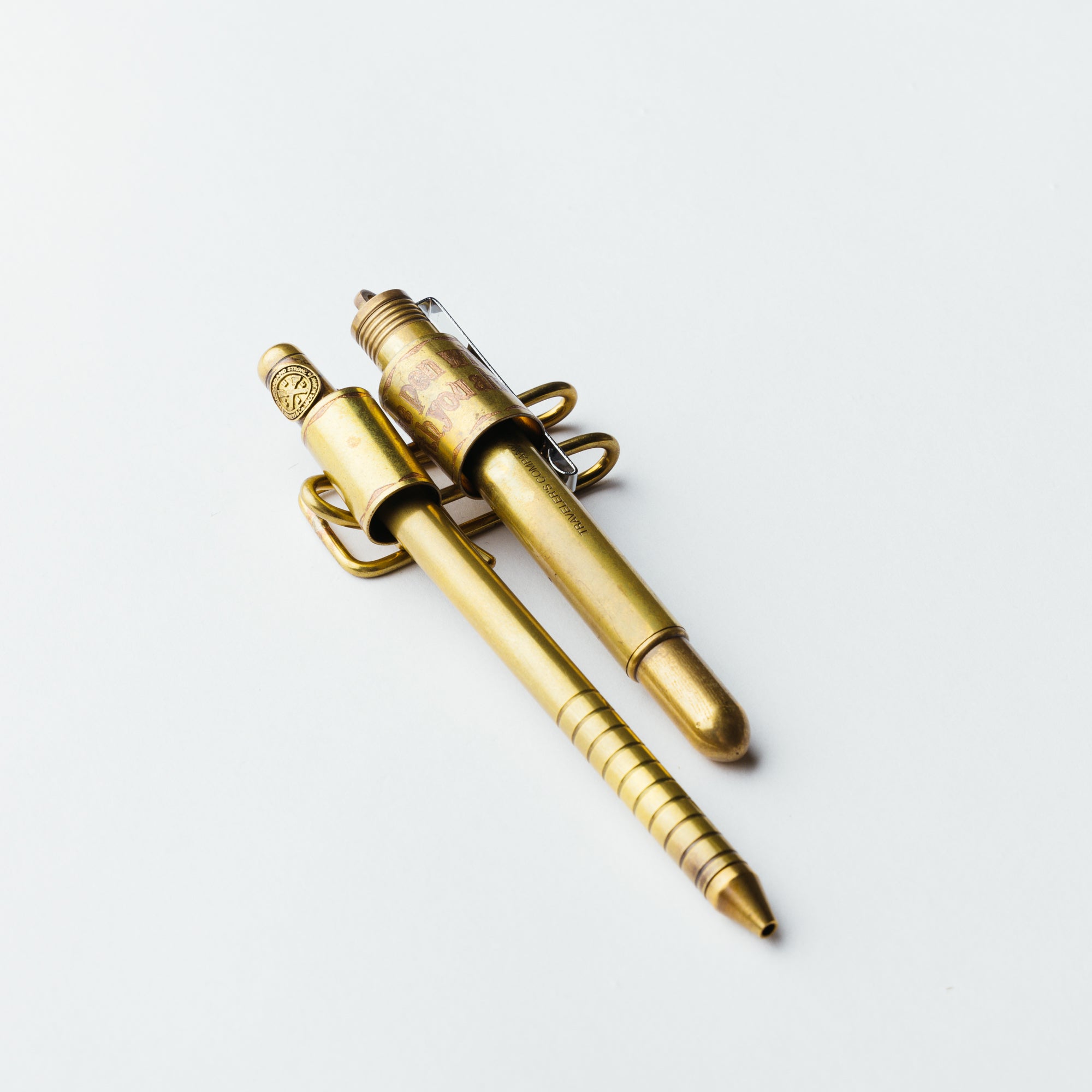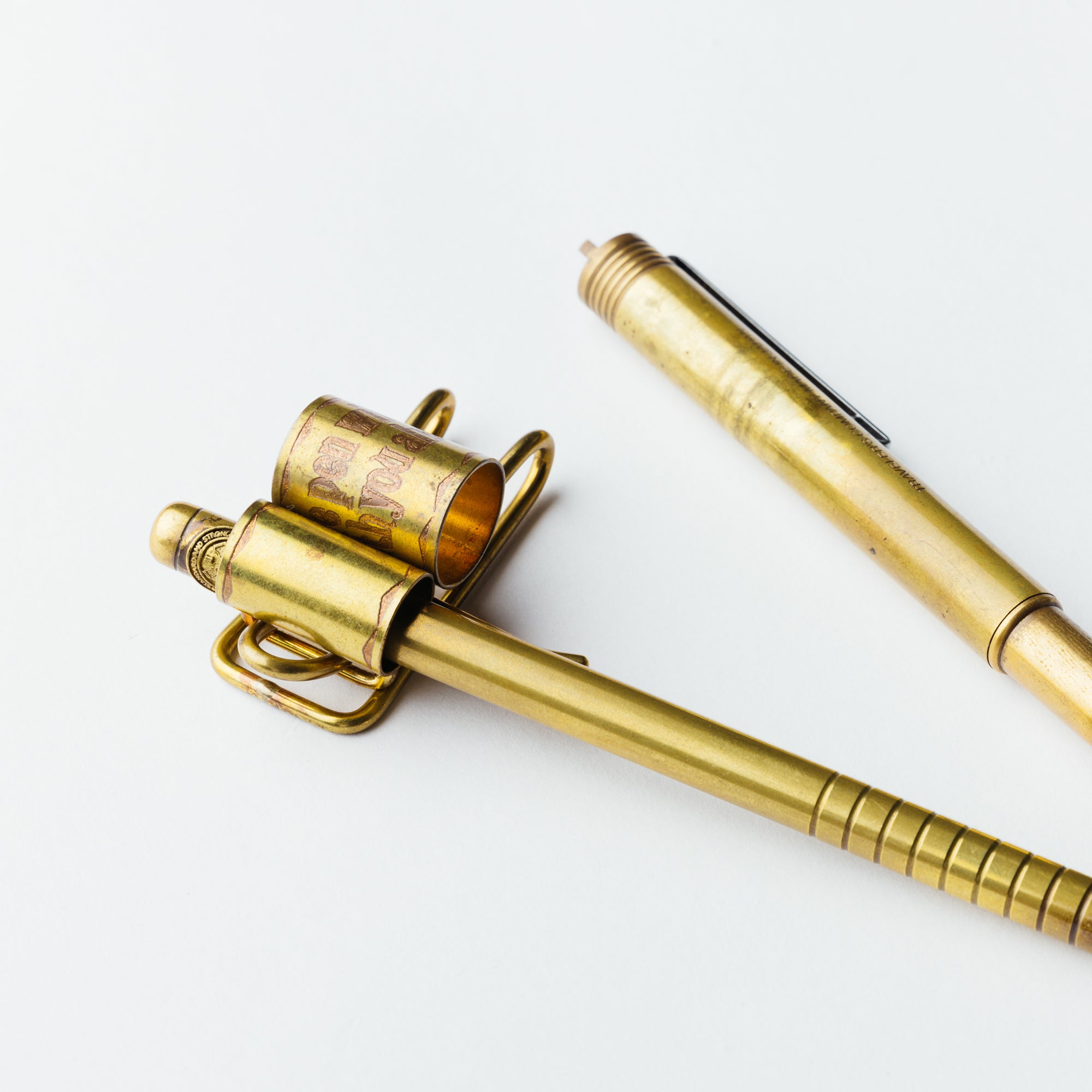 真鍮製のペンクリップは、二本のペンを手帳やノートの表紙に取り付けることができます。