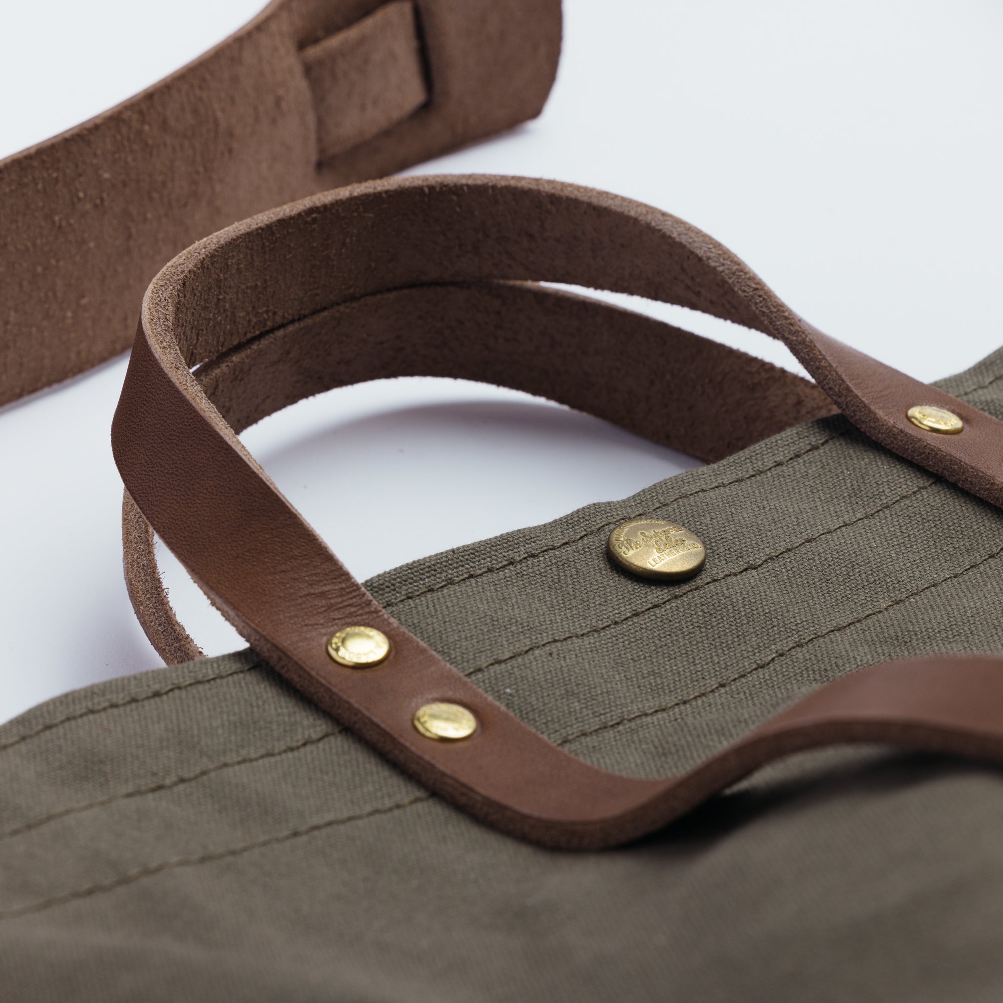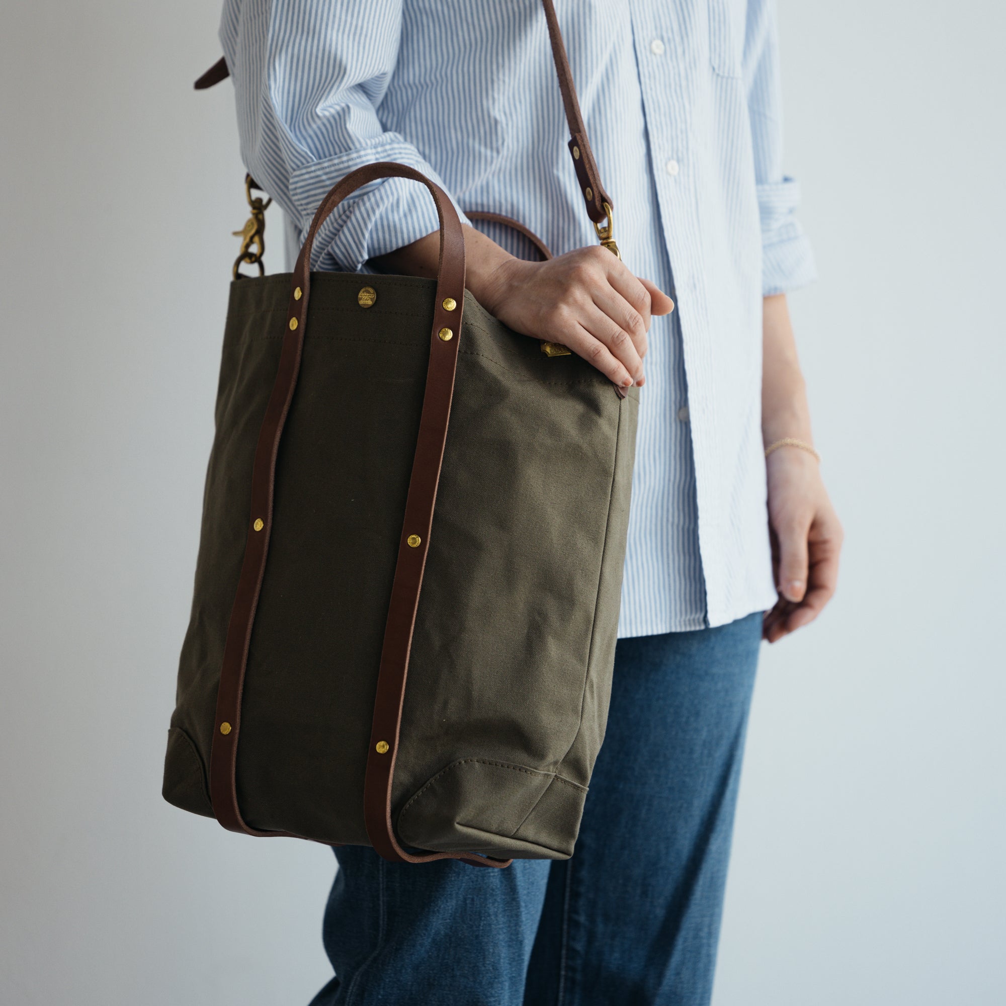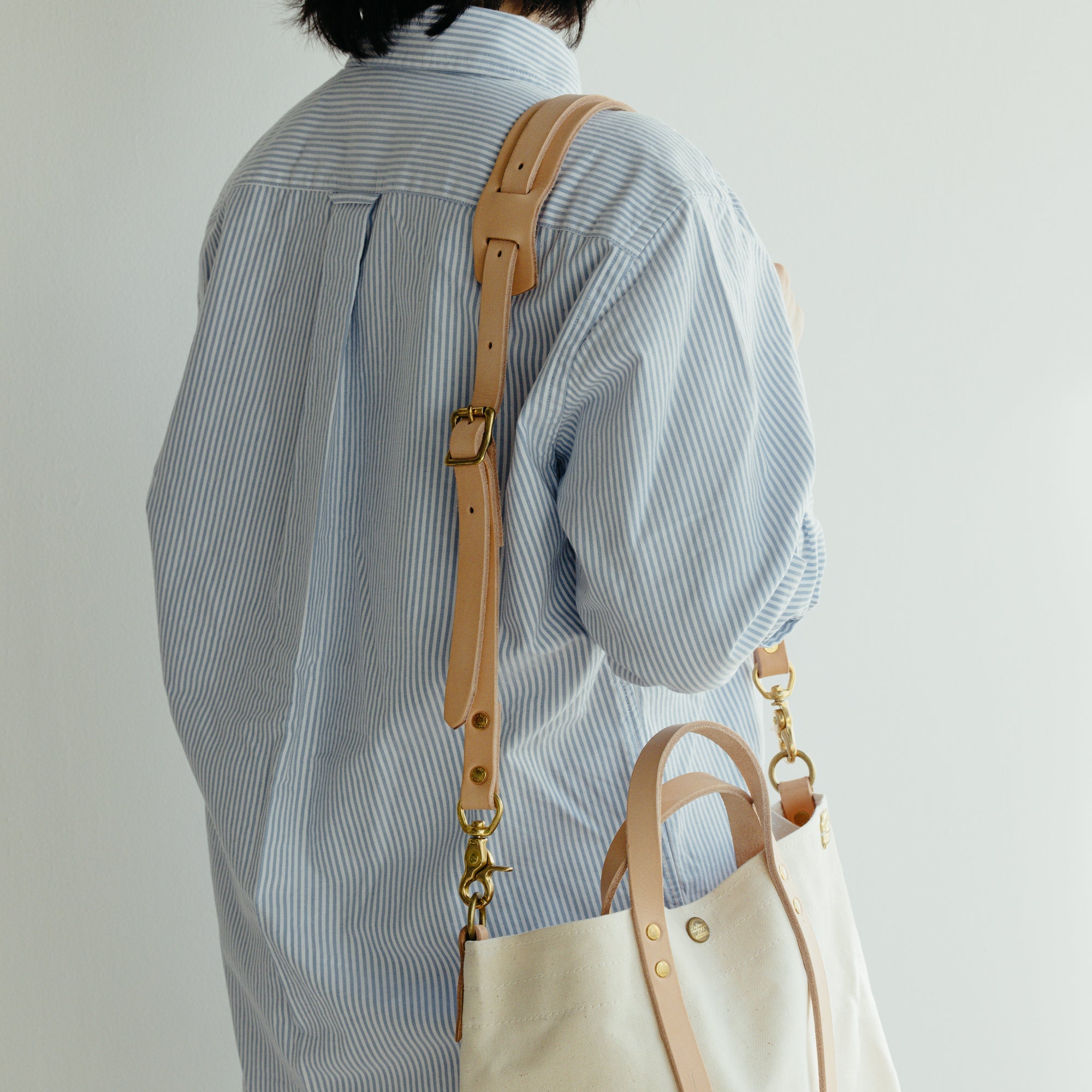 バッグを縦にぐるっと巻くようにリベットで留められたハンドルベルトの間には折り畳み傘や脱いだシャツを丸めて挟んだり、通りすがりの市場で見つけた長ネギだって挟むことができます。