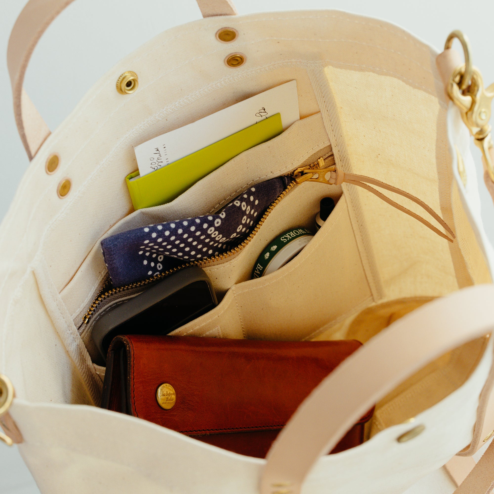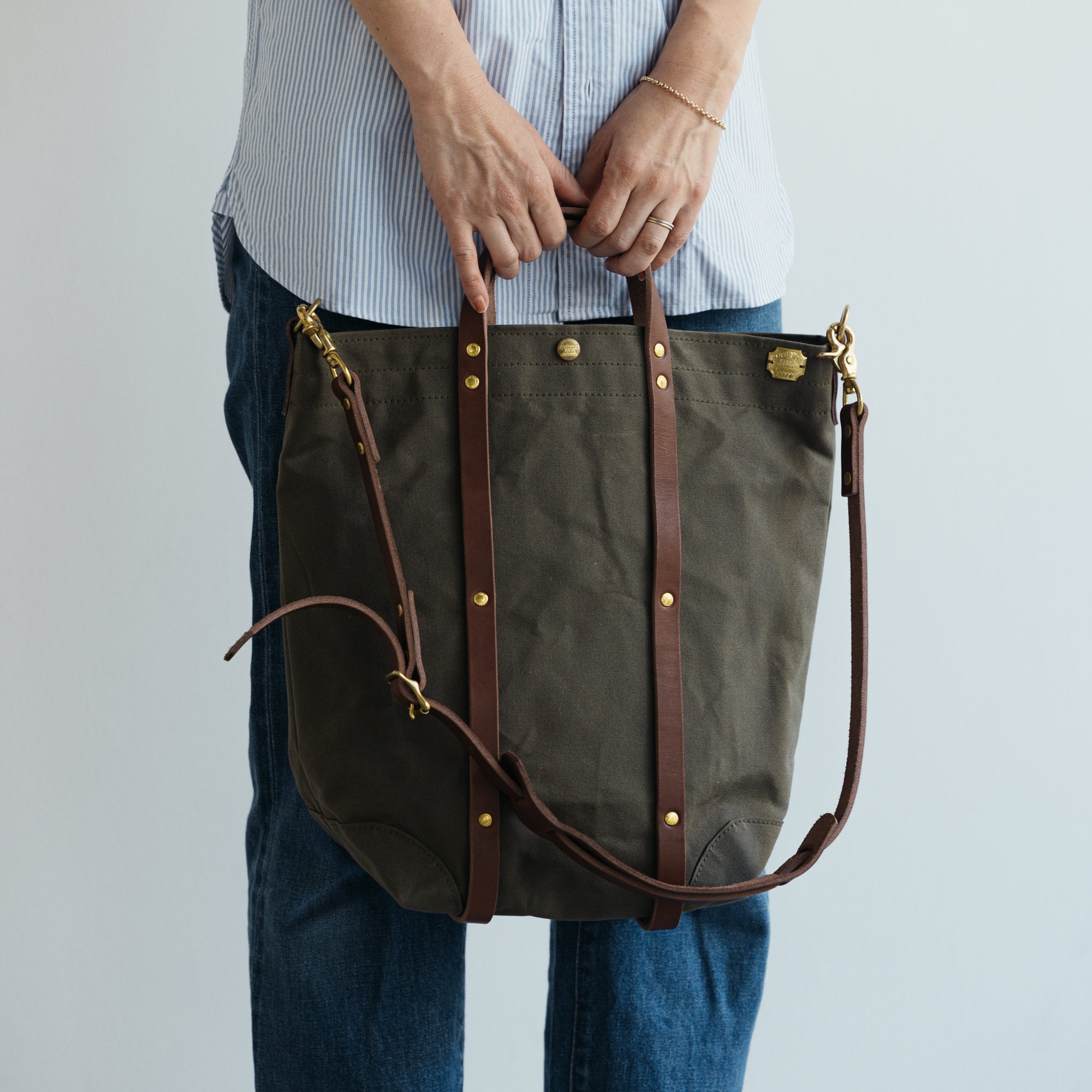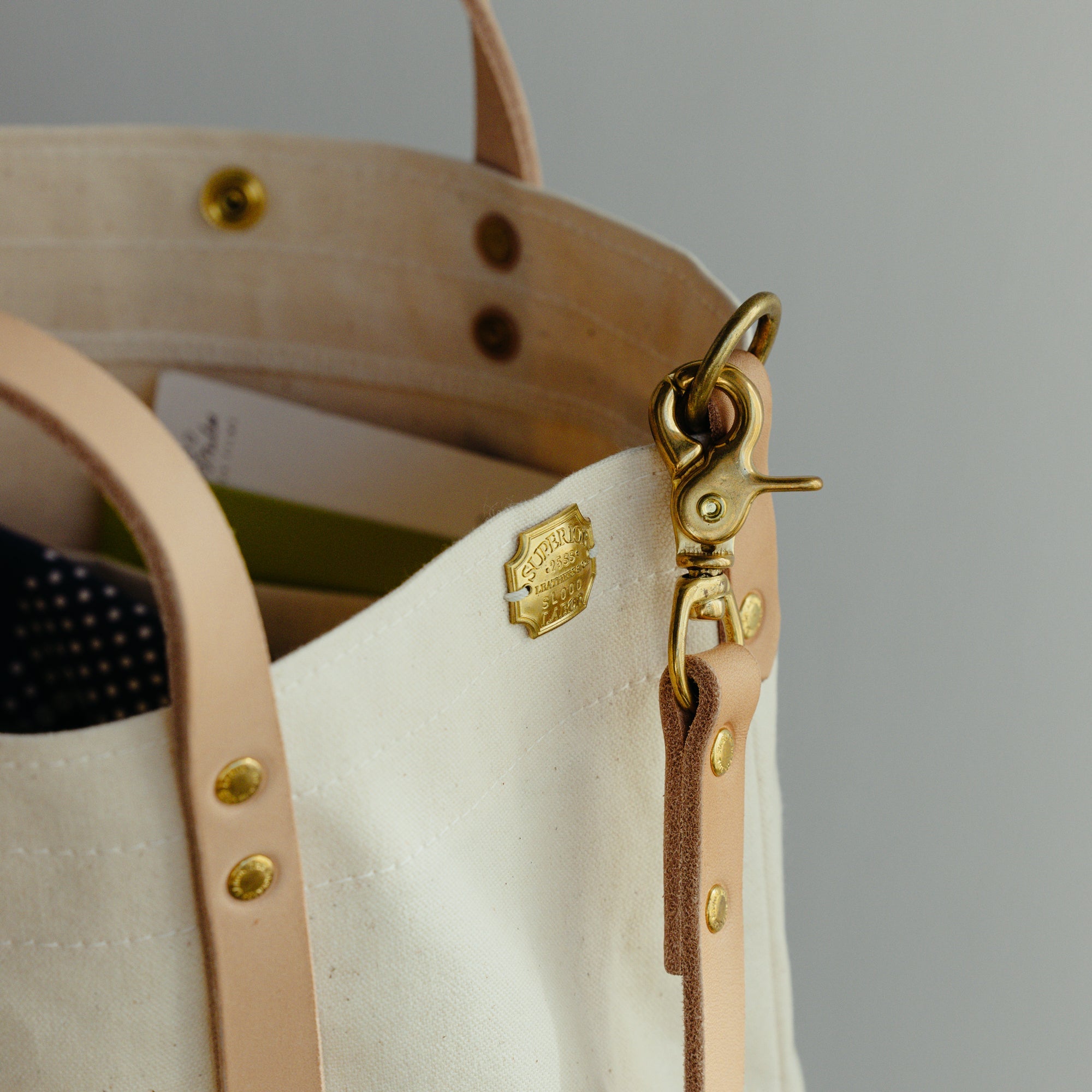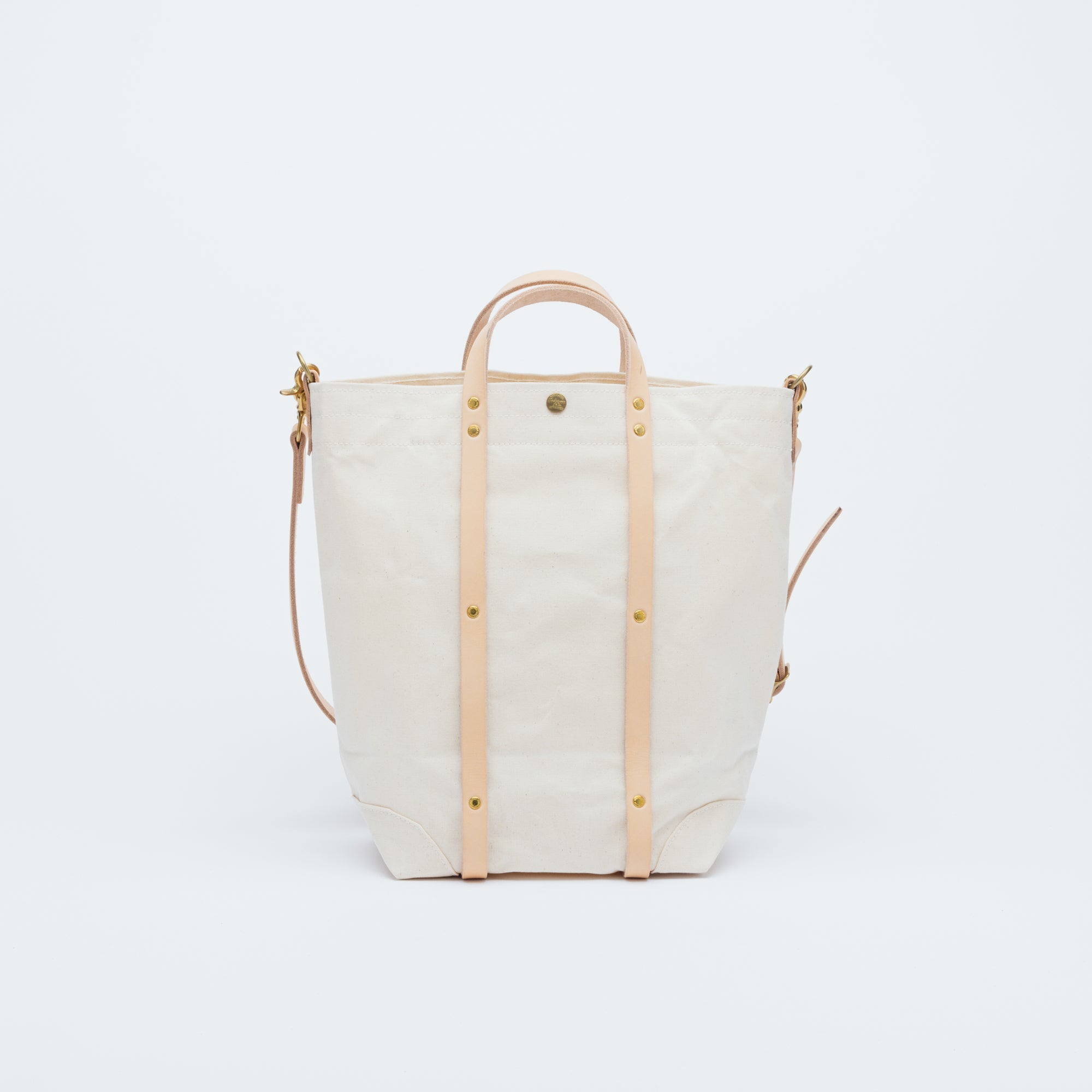 バッグを縦にぐるっと巻くようにリベットで留められたハンドルベルトの間には折り畳み傘や脱いだシャツを丸めて挟んだり、通りすがりの市場で見つけた長ネギだって挟むことができます。