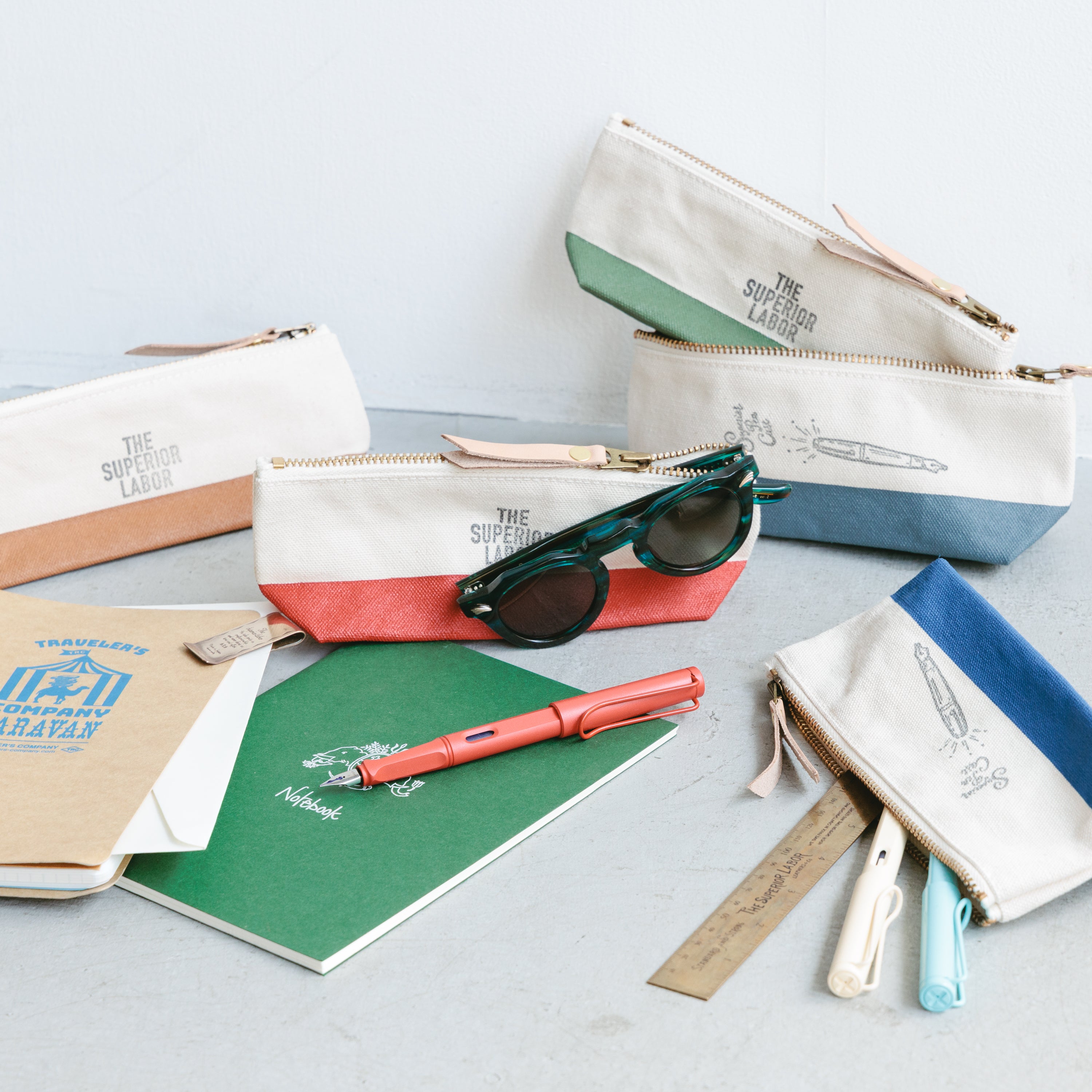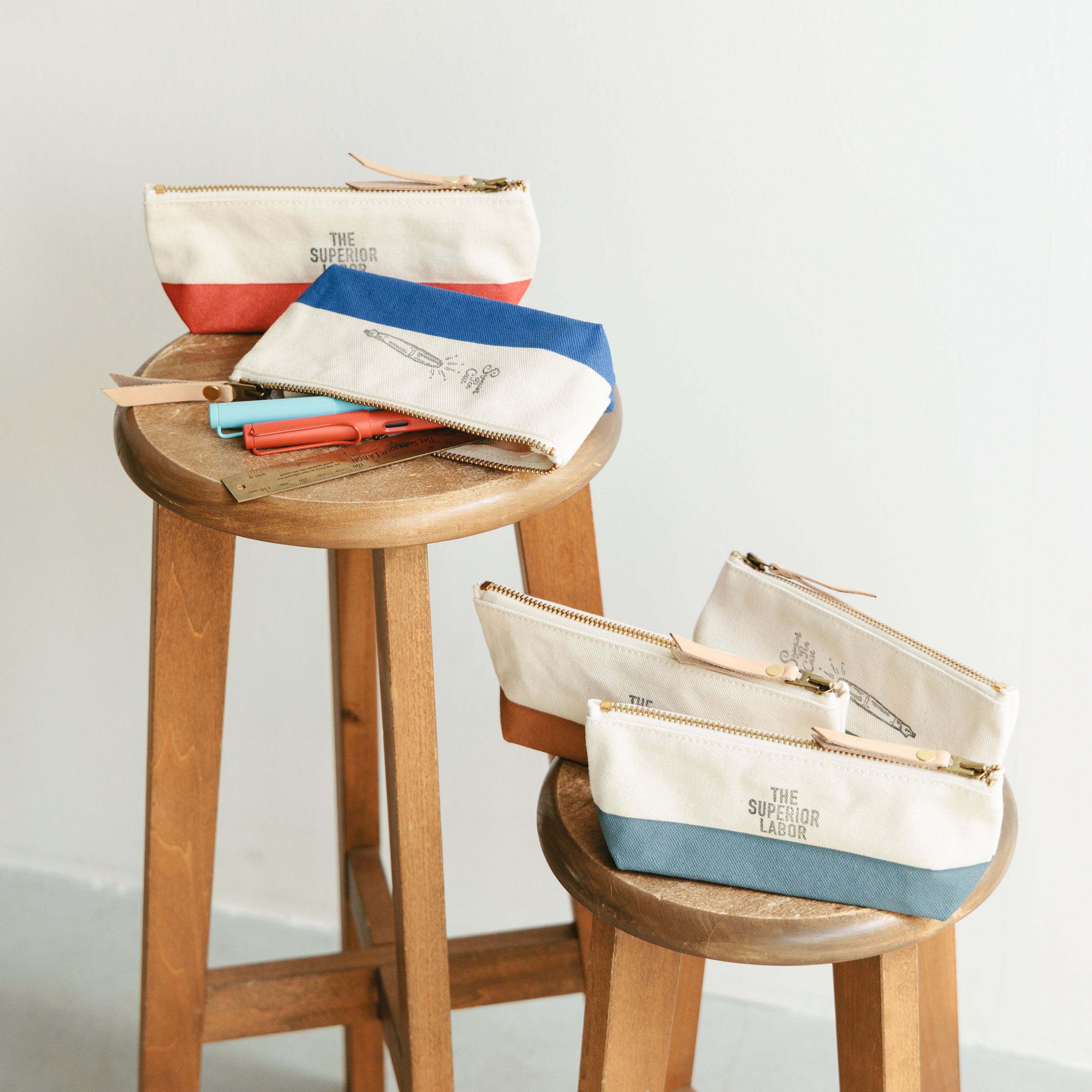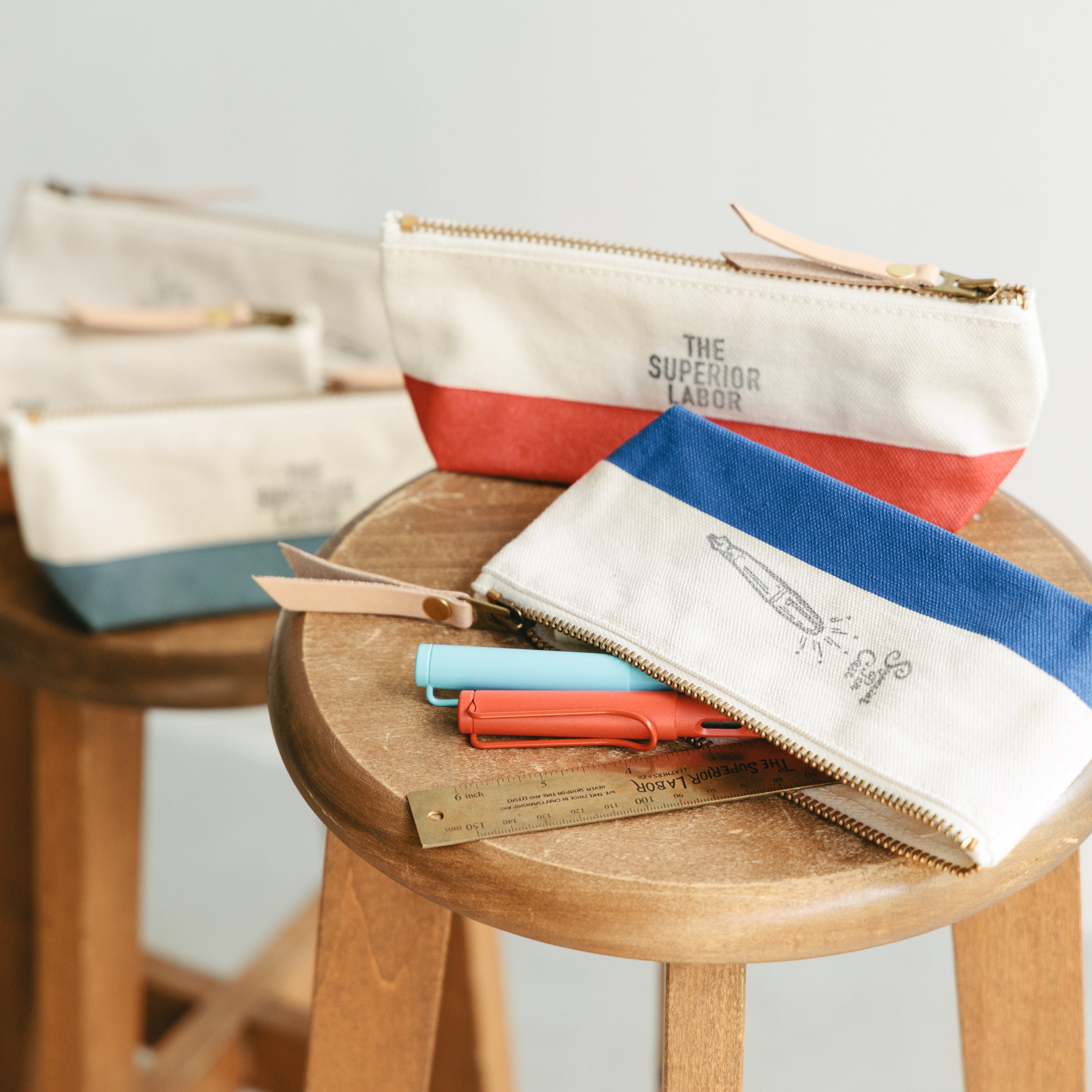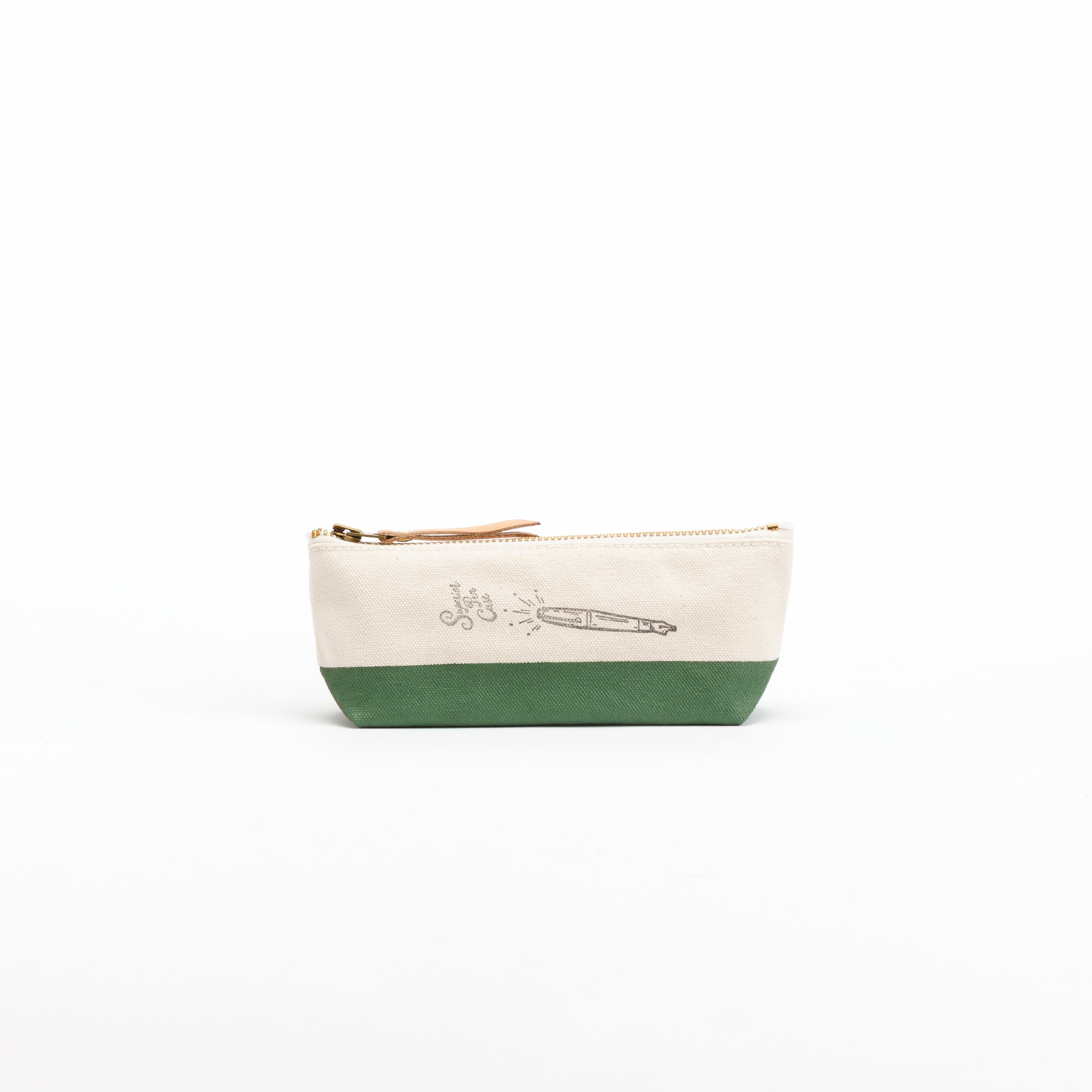 浅型なのでペンケースにぴったり、ということで万年筆イラストのスタンプをあしらいました。