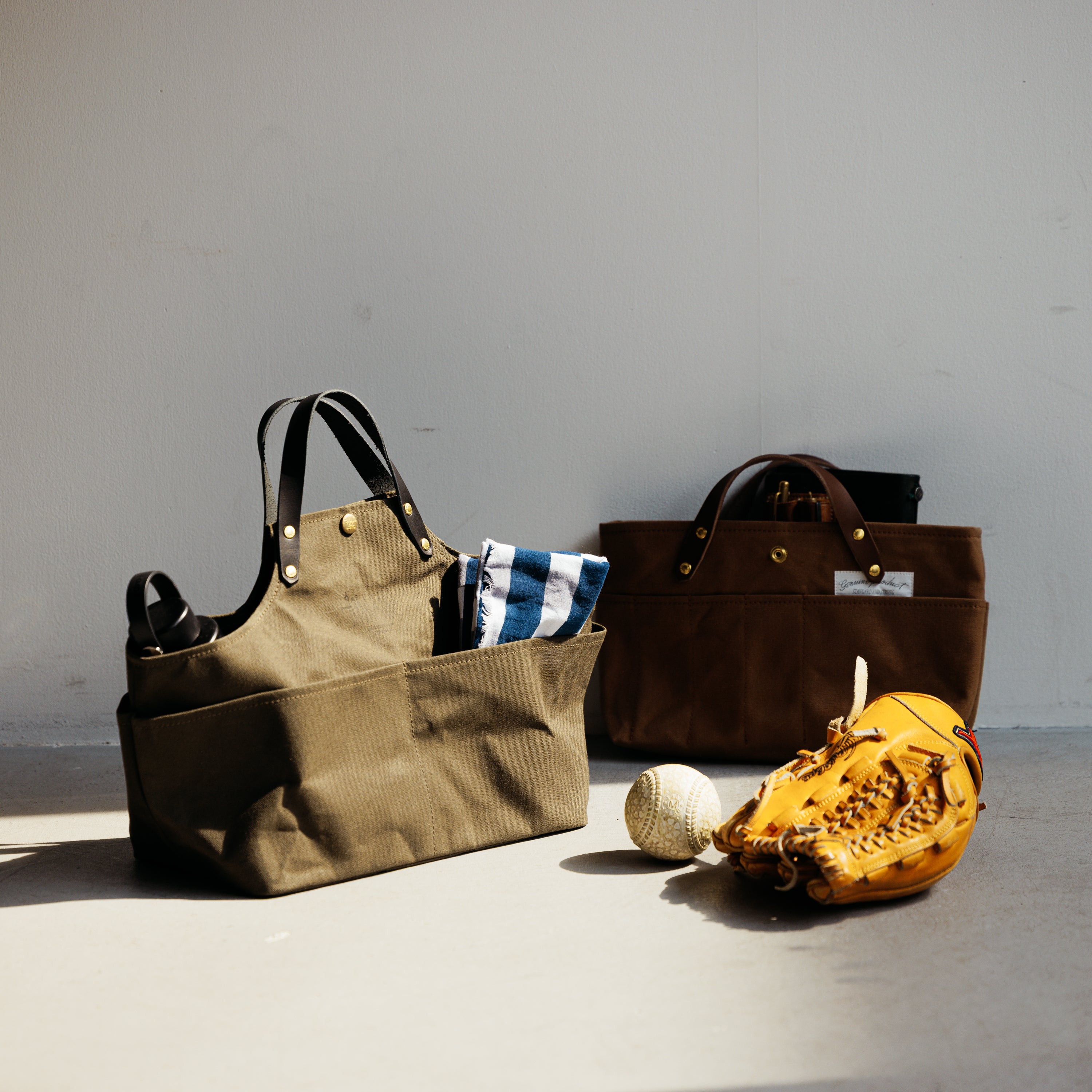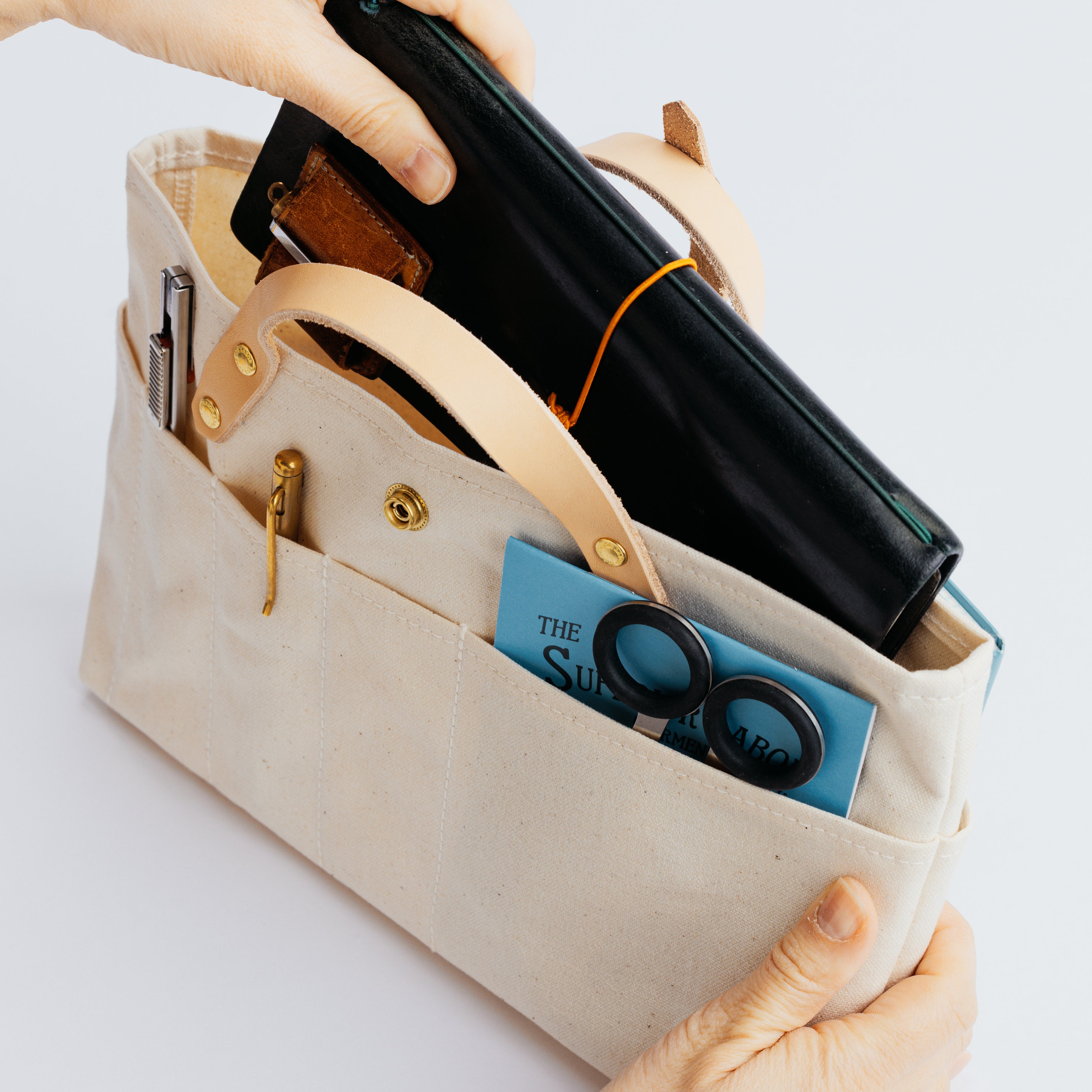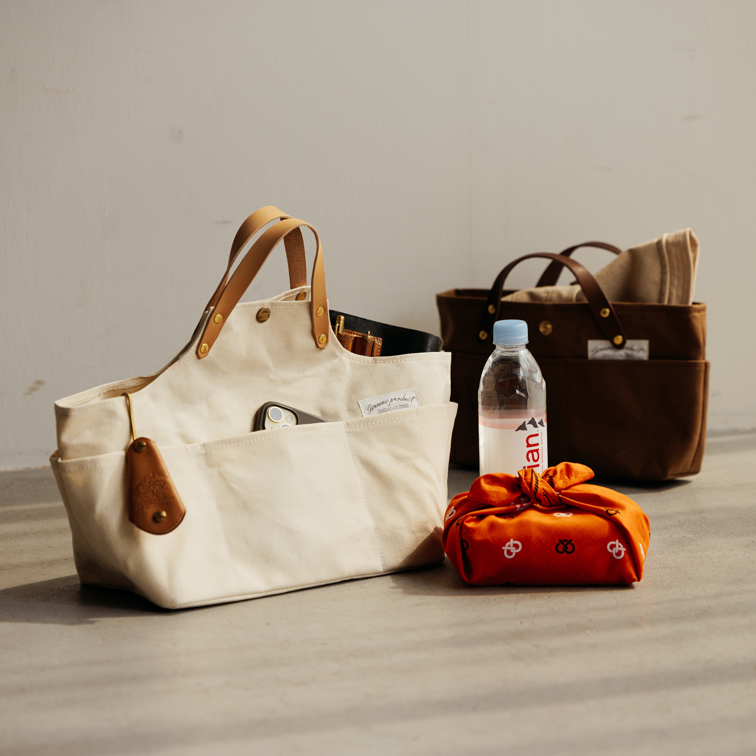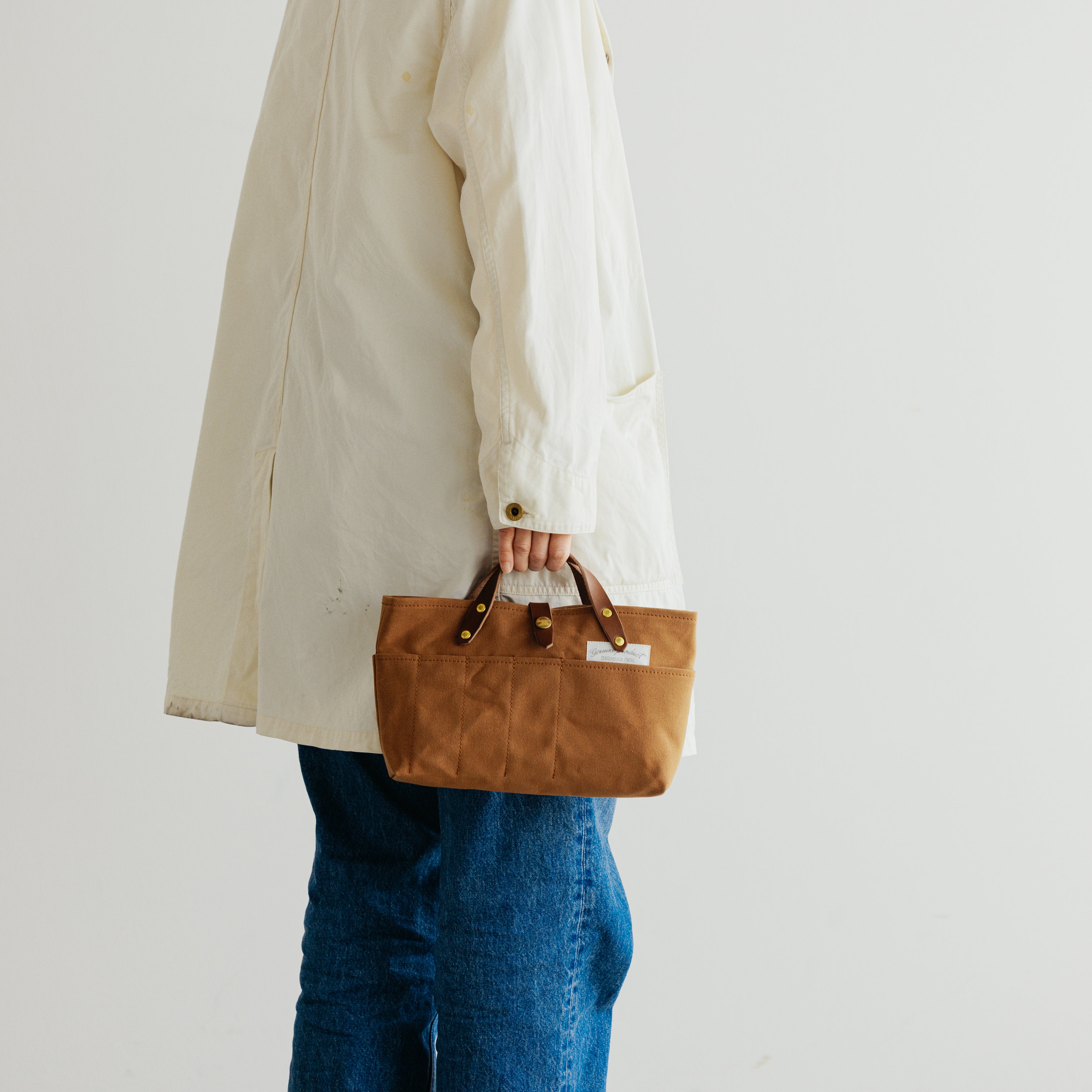 同シリーズの「paraffin canvas apron bag」に、すっぽり収まるサイズ感で、